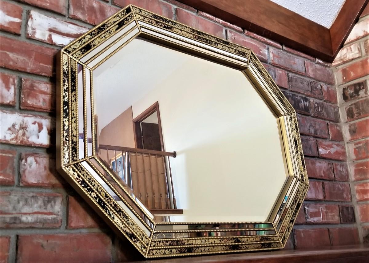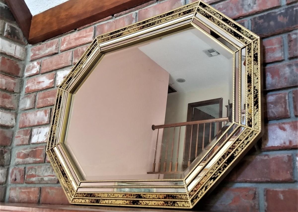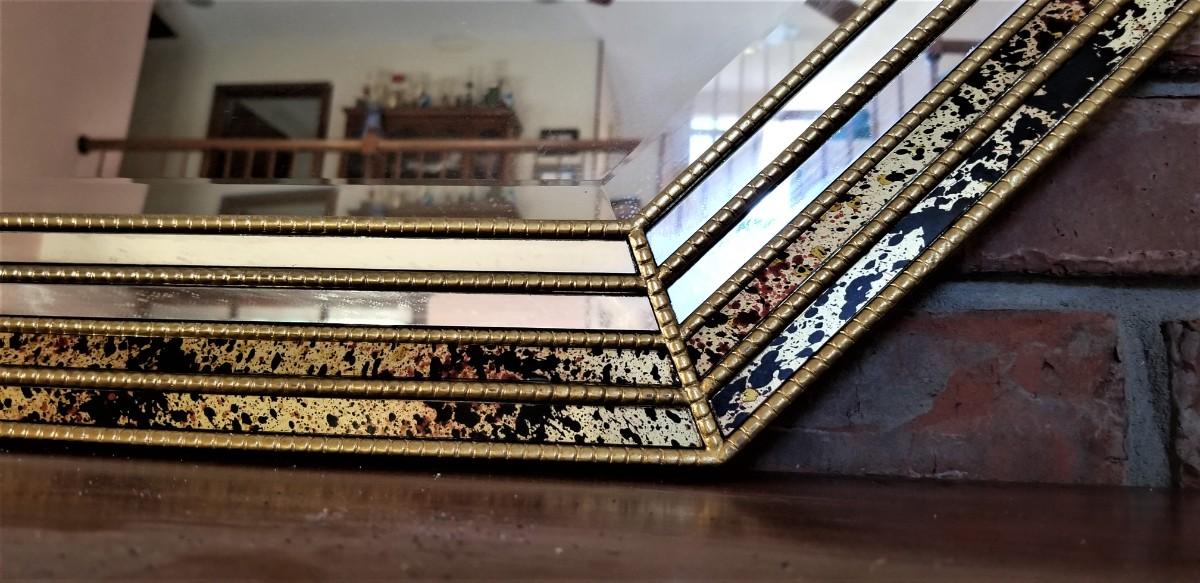 Nice contemporary accent wall mirror - smoky glass trim - beveled. Has some weight to it. Good condition. Measures 33.25" across, 25.5" tall.