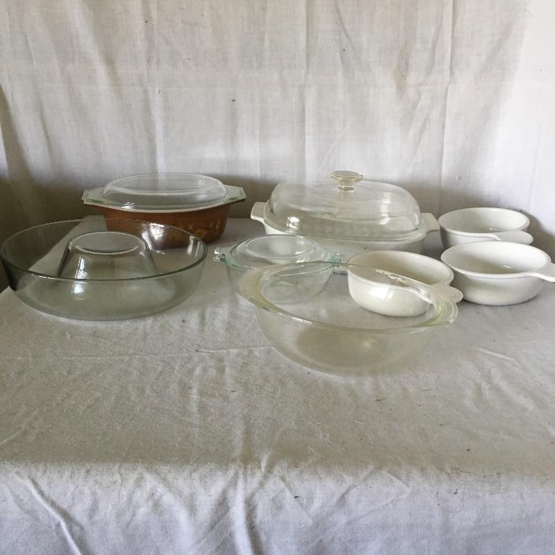 Array of Corning Ware includes three covers dishes, three small bowls with handles, clear bowl and upside down cake mold. A great assortment to add to your collection. Largest dish measures 10.25” x 10.25” x 4”.