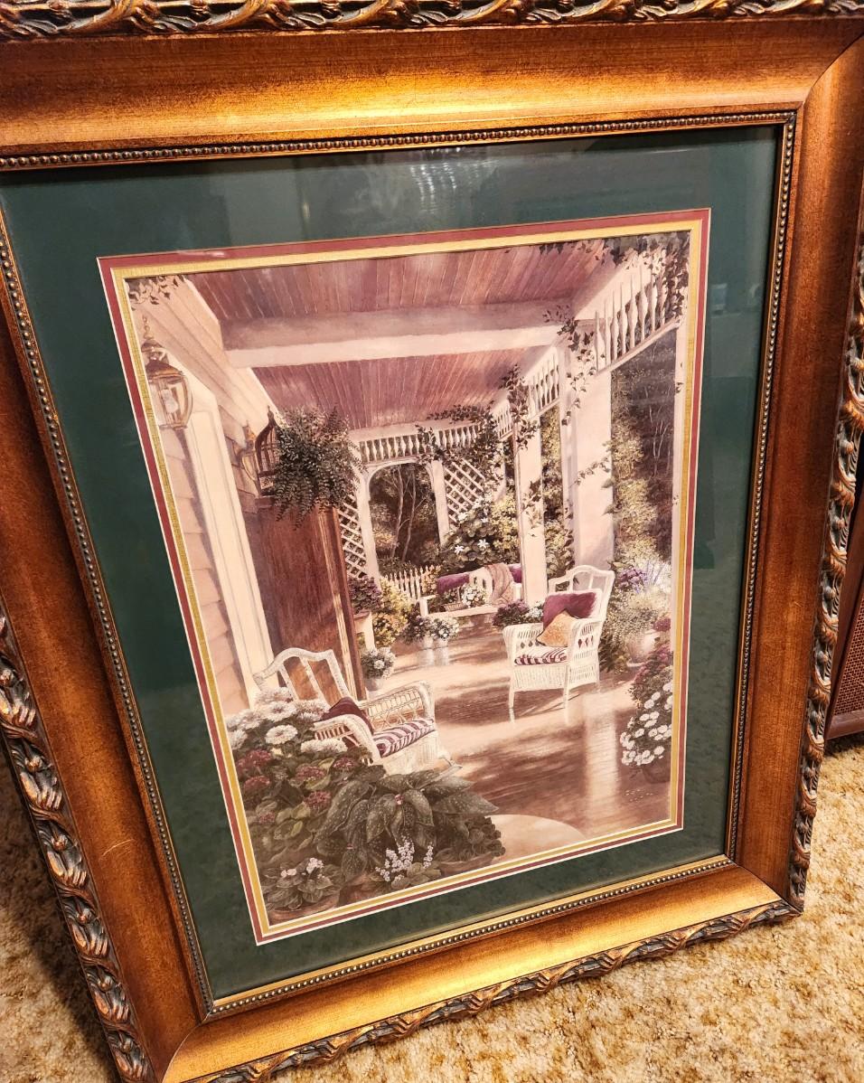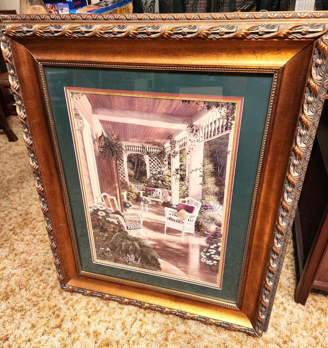Nice decorator framed art print - serene porch scene - unsigned. Triple matted, 30" across, 36" tall. Good condition.