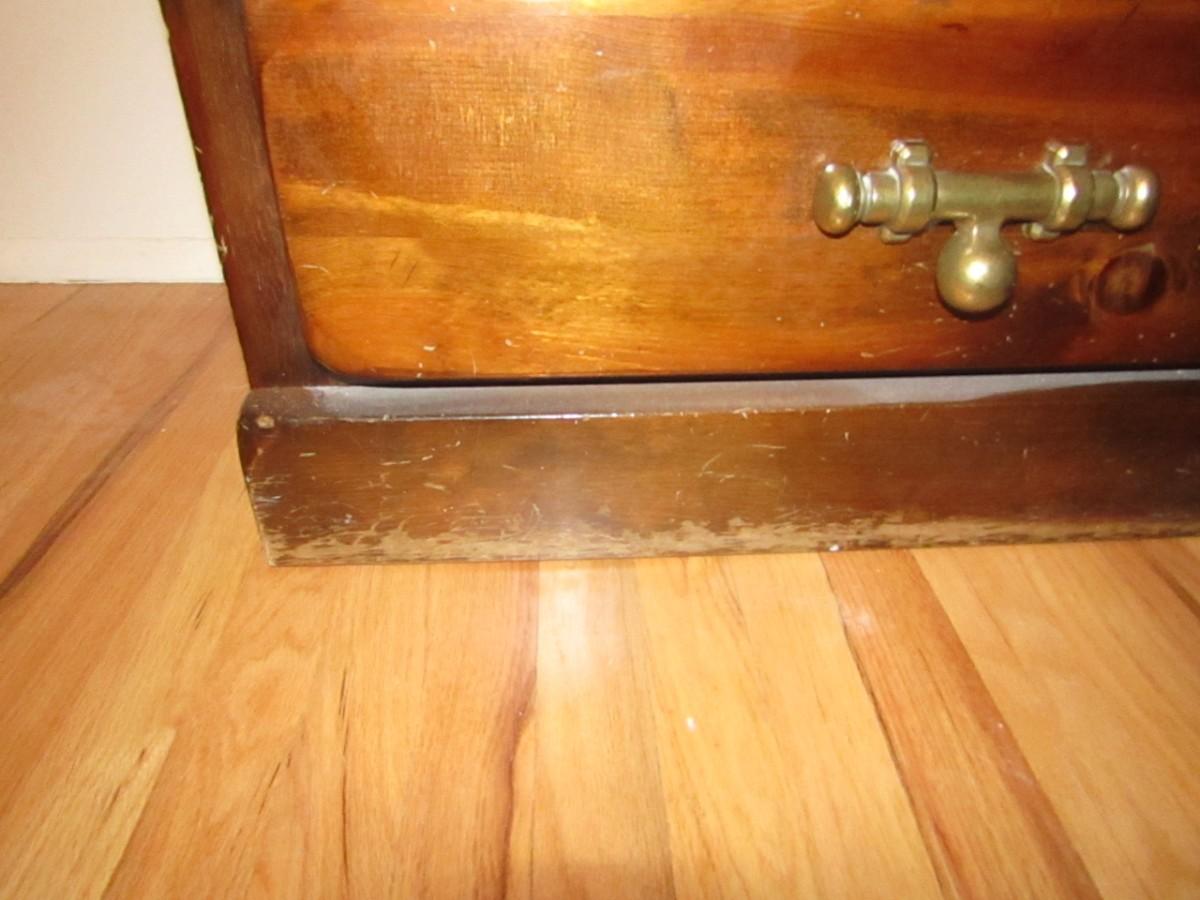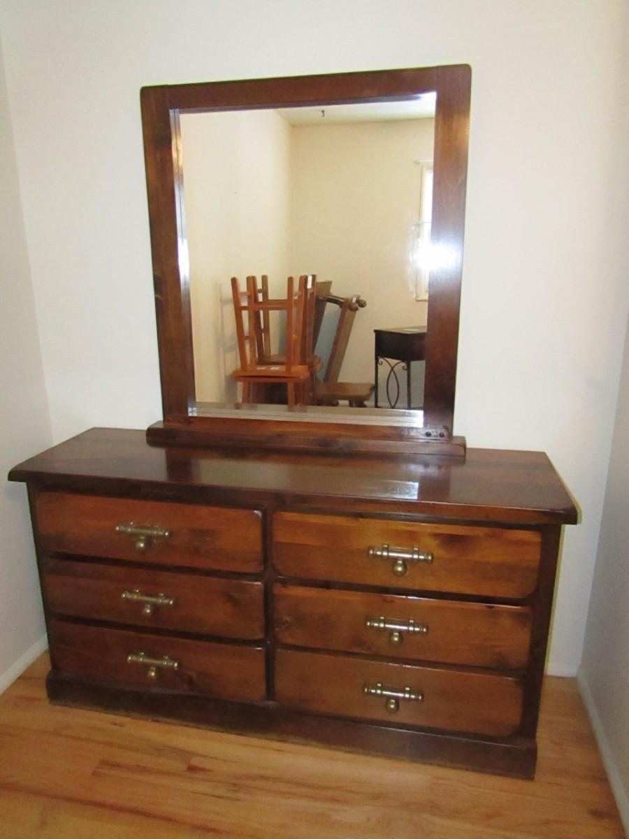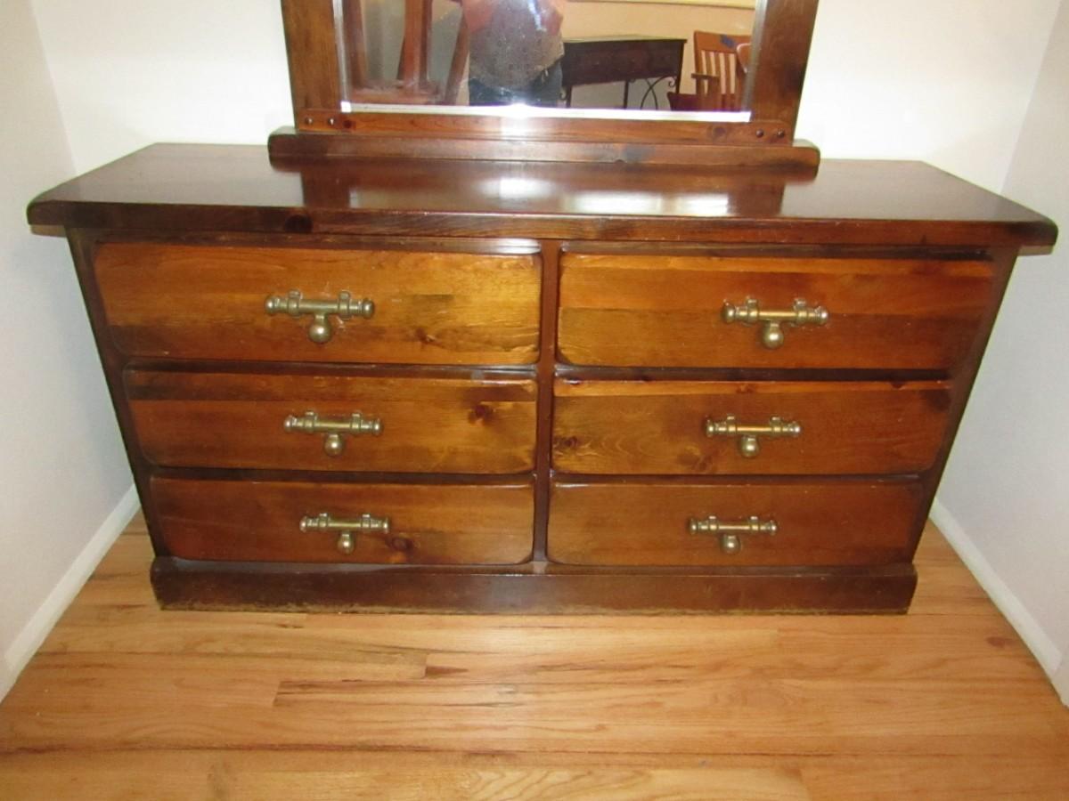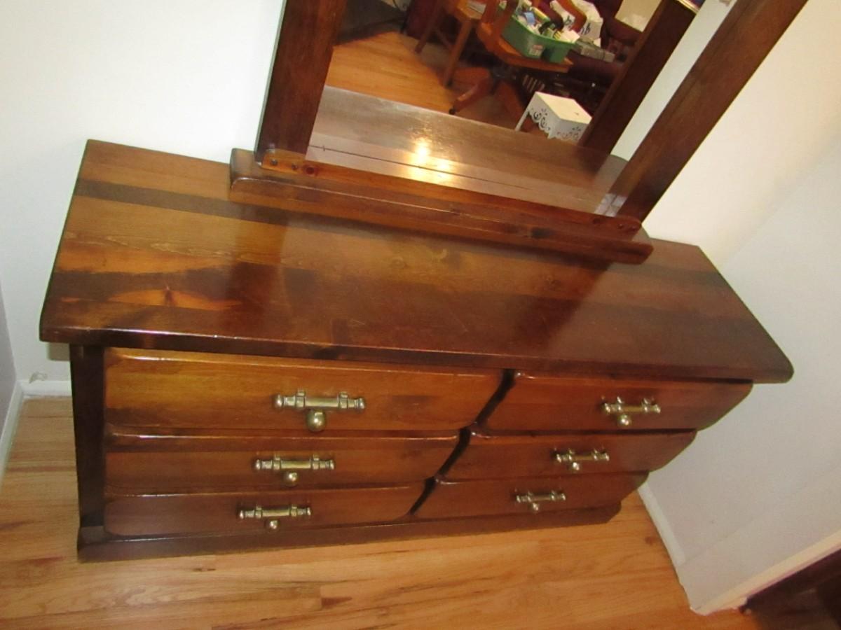 THICK WOODEN 6 DRAWER DRESSER 57" X 17" X 30" WITH SOME SCUFFS ALONG THE BOTTOM