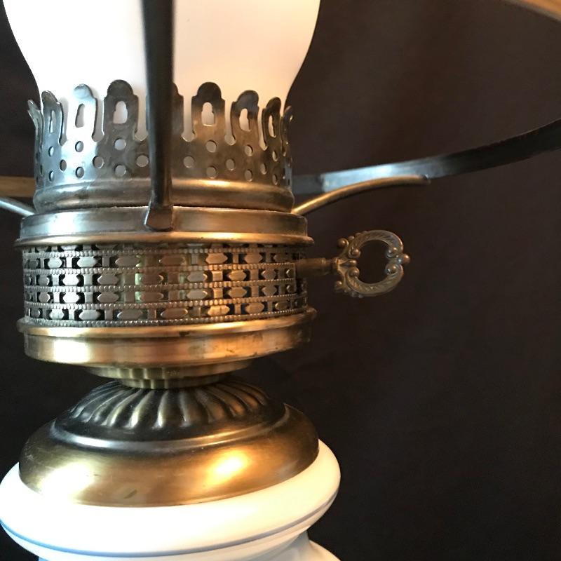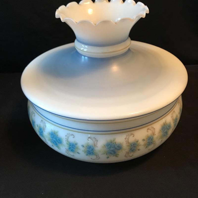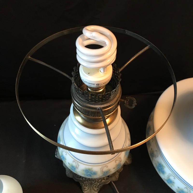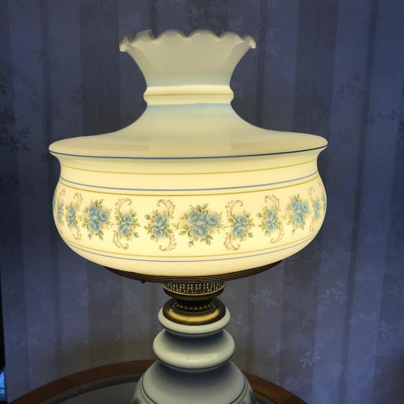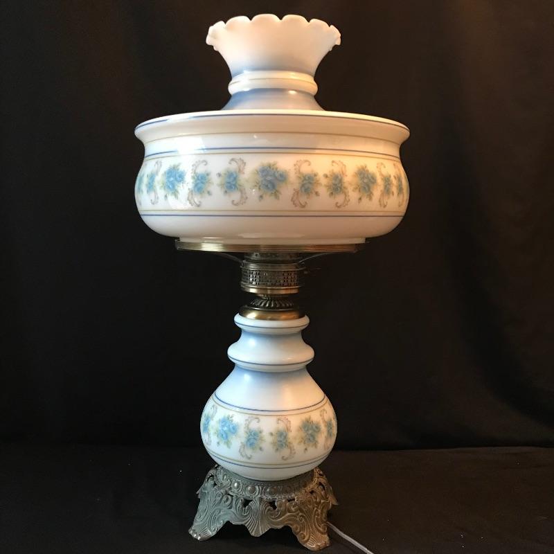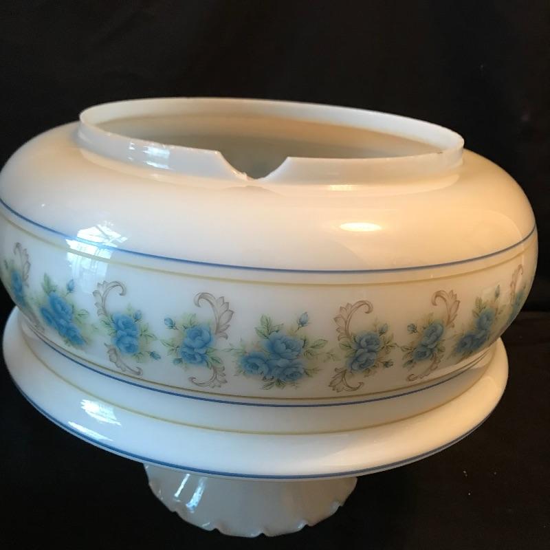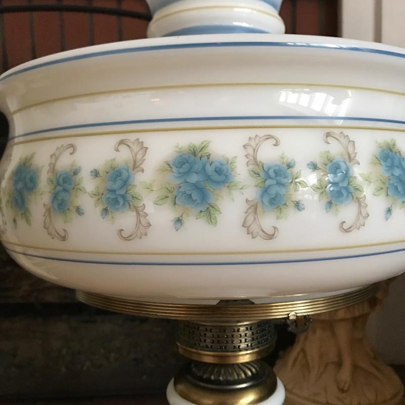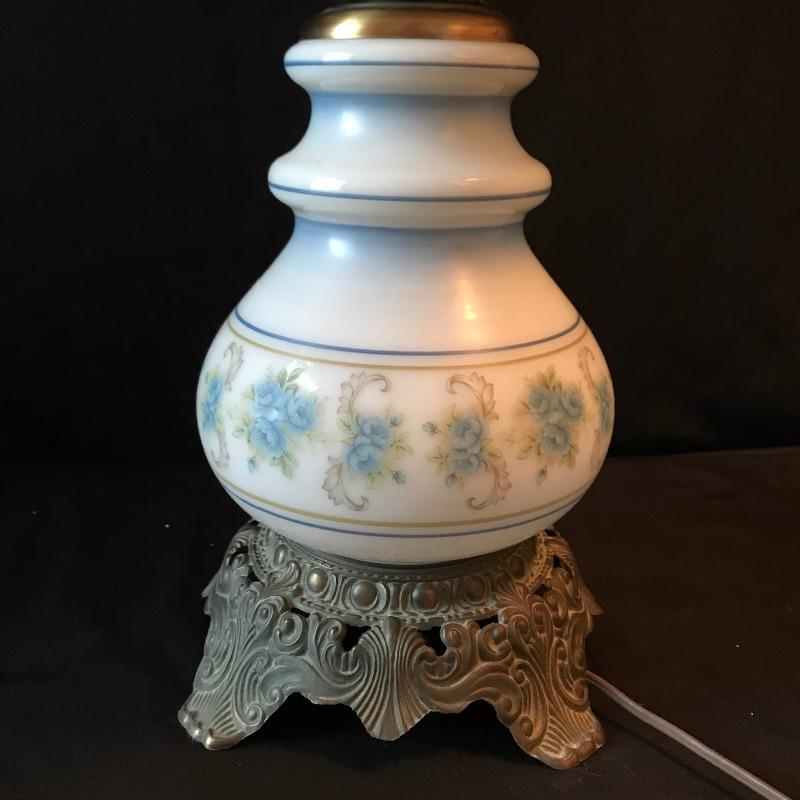 Stunning blue rose globe lamp with electric socket. Lamp has brass or bronze-like metal feet and socket. Shade appears to be hand blown glass with painted design (not verified). It has one chip on bottom part that is only noticeable if you remove shade or you’re seeking it out. Lamp measures approximately 15”d x 26”. See photos. Shipping available. Call UPS for quote prior to bidding as it is likely costly 828-252-6930.