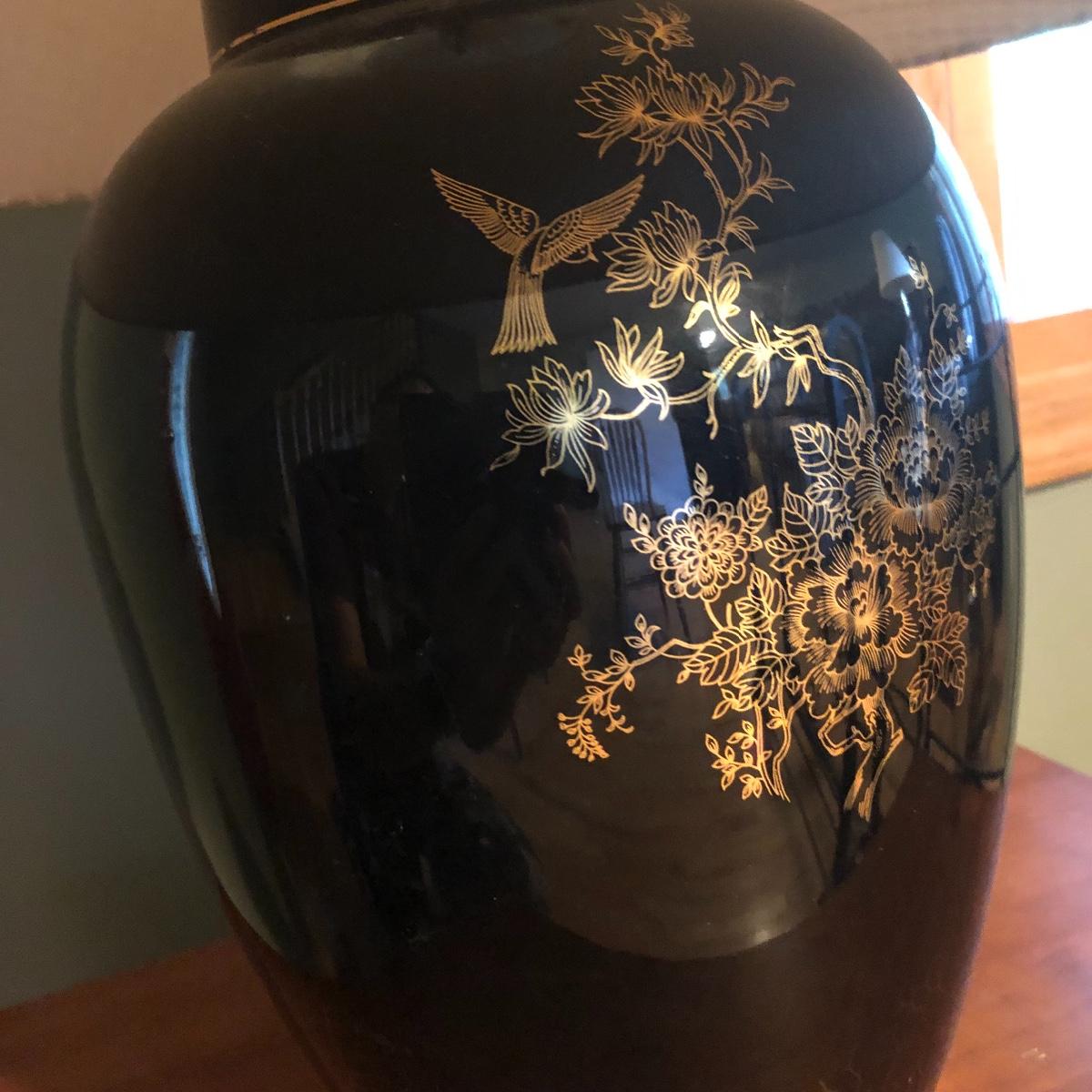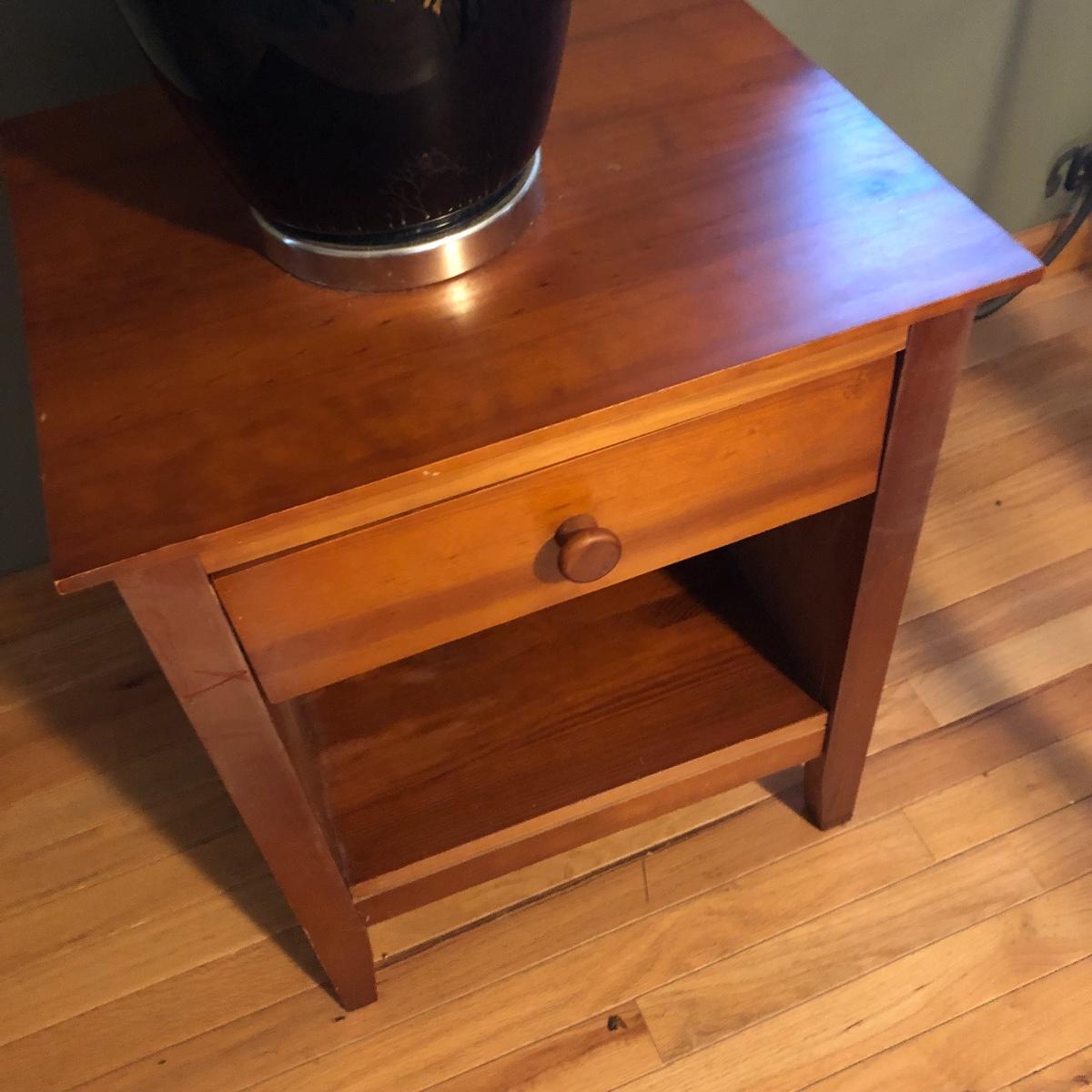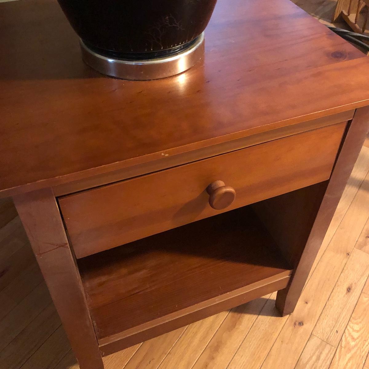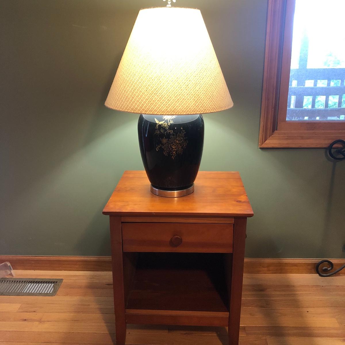 Brighten up your space with a Ginger Jar Lamp and end table. The lamp operates when plugged in and measures 10” wide (shade is approximately 18” wide) and 27” high (to top of finial). The table measures 19.5” wide x 15” deep x 24” tall. It seems to be made of wood and particle board. Please note the few scratches and chips. Local pick up only.