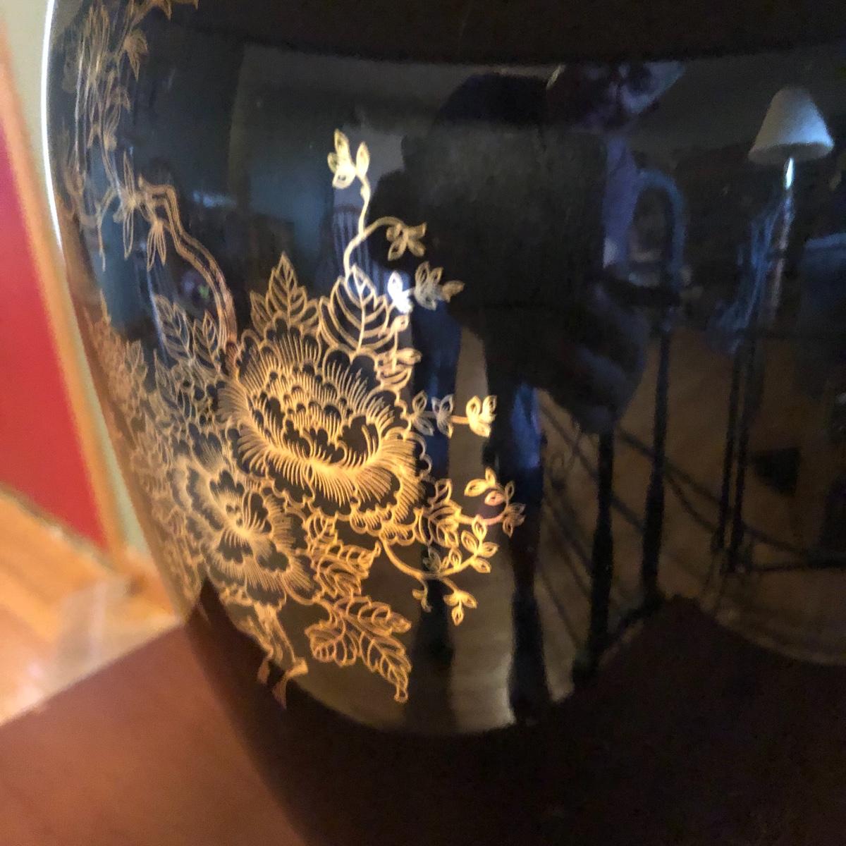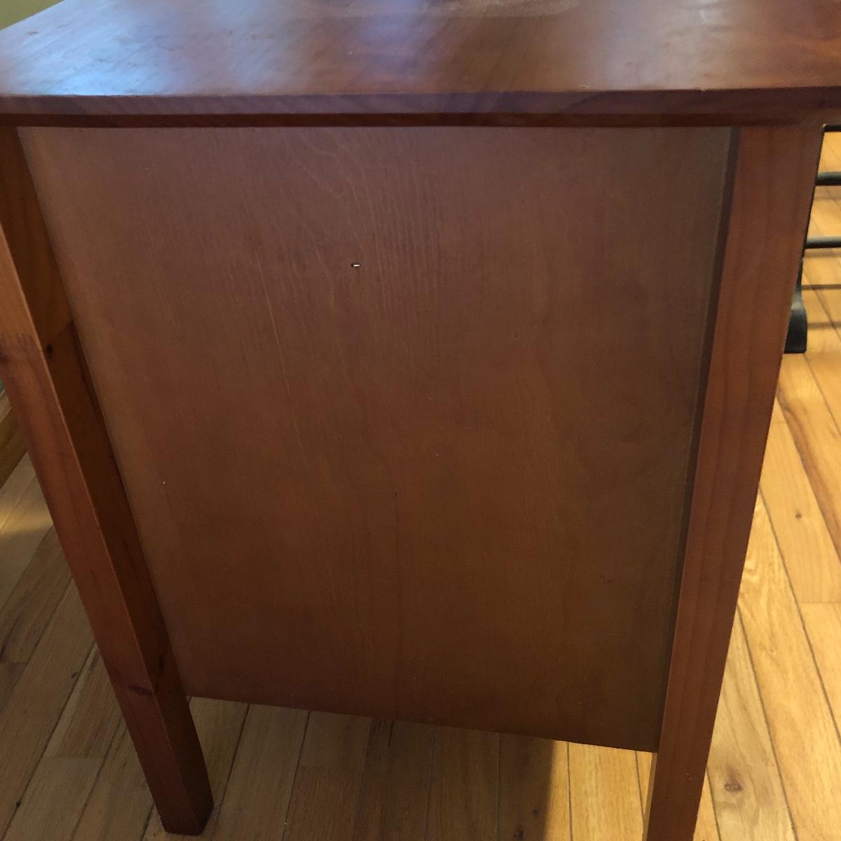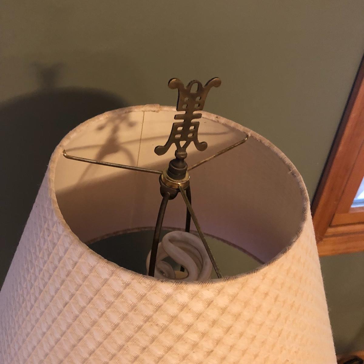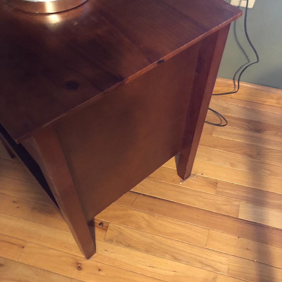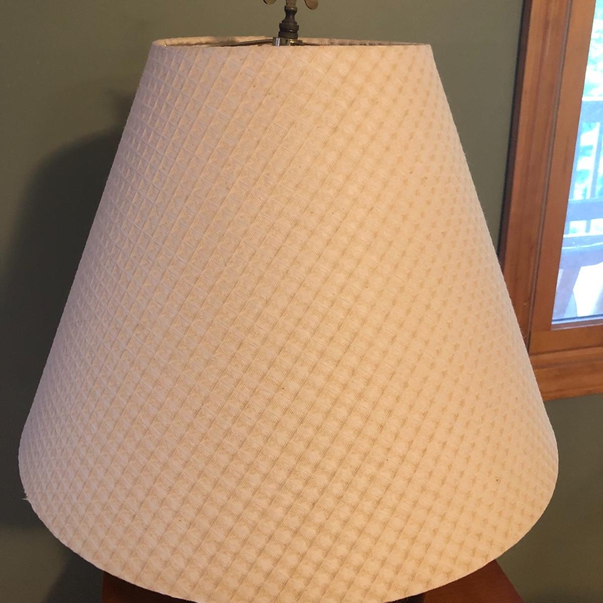 Brighten up your space with a Ginger Jar Lamp and end table. The lamp operates when plugged in and measures 10” wide (shade is approximately 18” wide) and 27” high (to top of finial). The table measures 19.5” wide x 15” deep x 24” tall. It seems to be made of wood and particle board. Please note the few scratches and chips. Local pick up only.