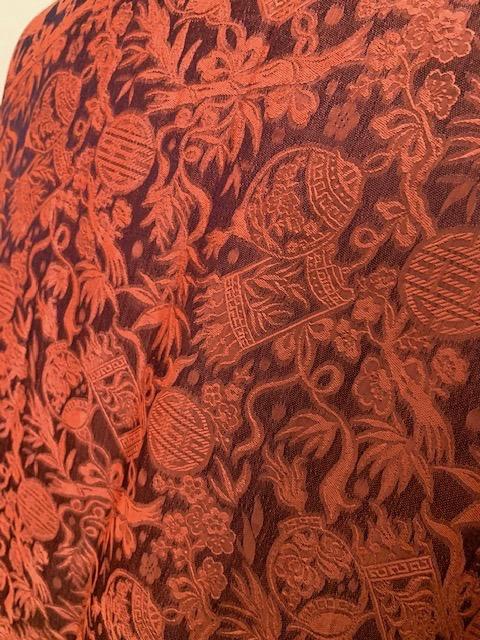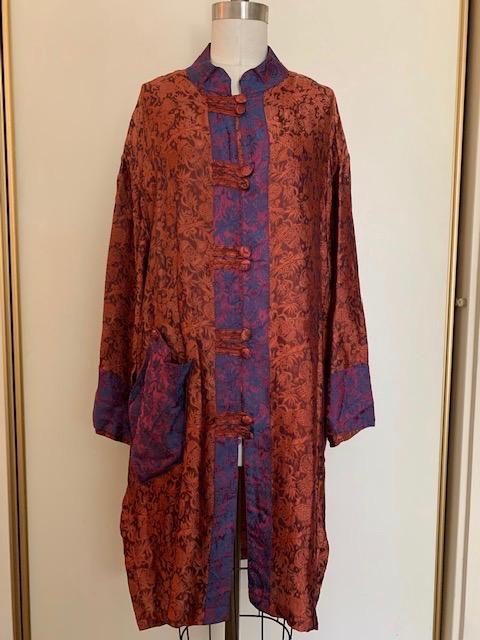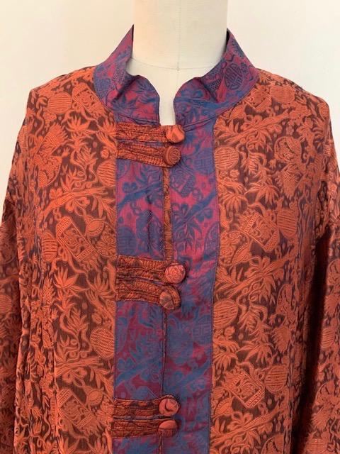 Wearable art. Rusty orange lantern & bamboo design silk with purple & blue trim down front. Mandarin collar, one front pocket. Covered buttons w/tabs.