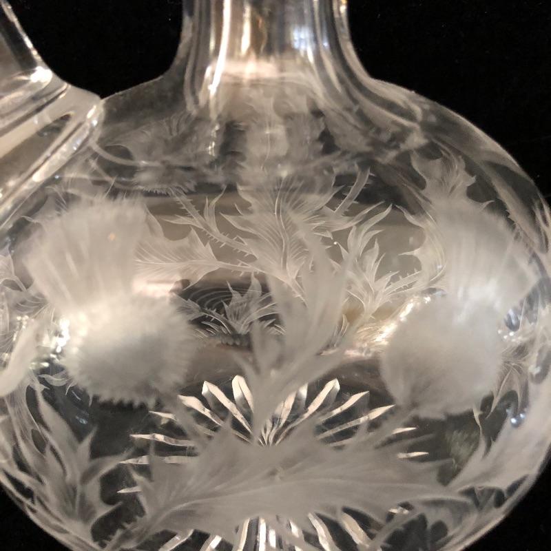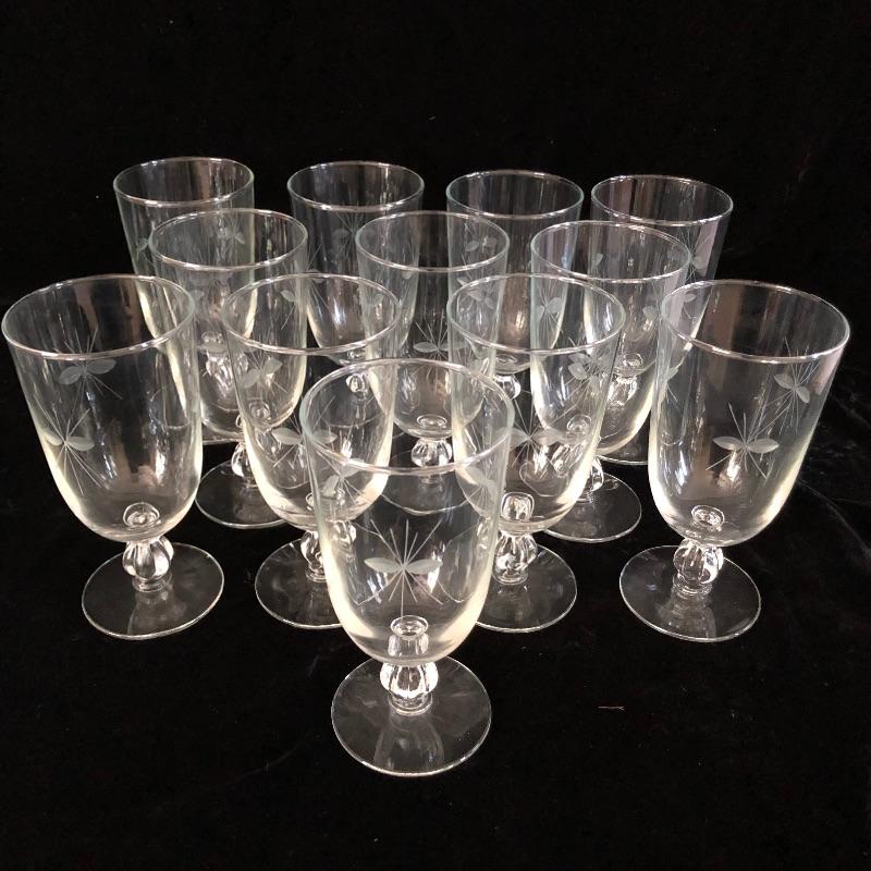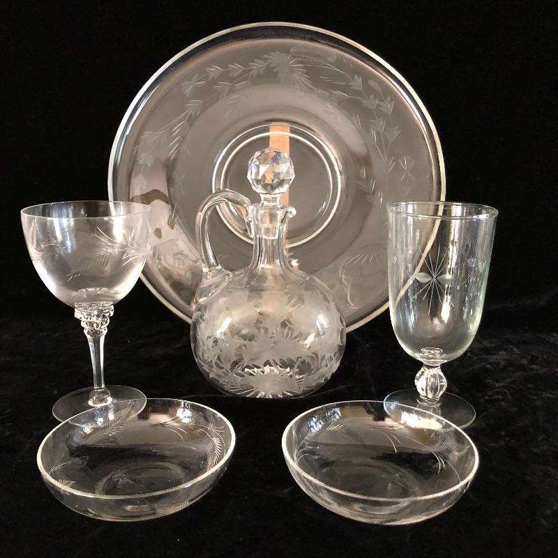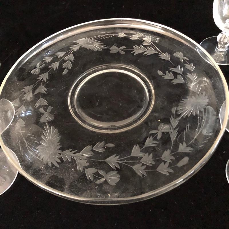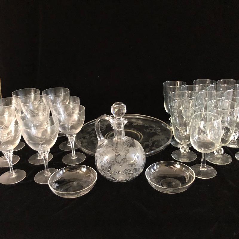 We have your next party covered for elegant stemware with 11 wine glasses, 12 water glasses, a large platter and a stunning decanter with a thistle design etching and more. Platter measures 13”.