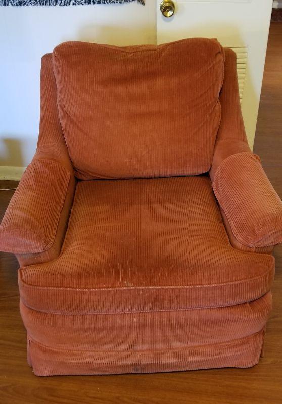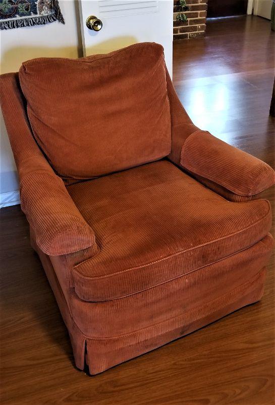 Ahhhh - classic "burnt orange" upholstered armchair from the 1970's. Made by the Ethan Allen Company. Used condition. 34" across, 35" deep, 30.5" tall. The chair is stationary - it doesn't rock, etc. See the matching sofa in a future lot.