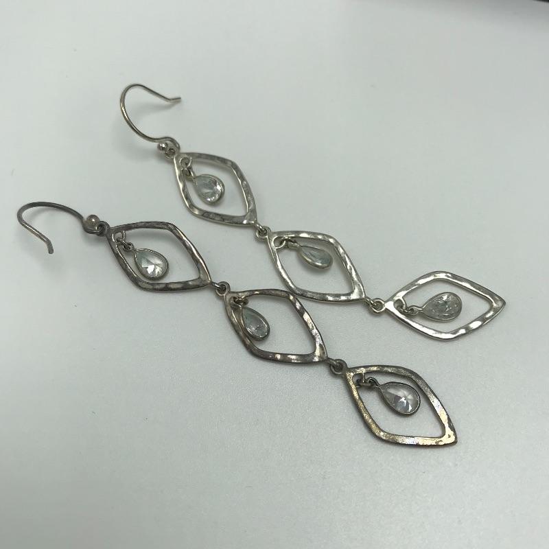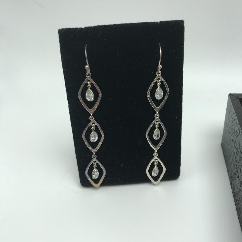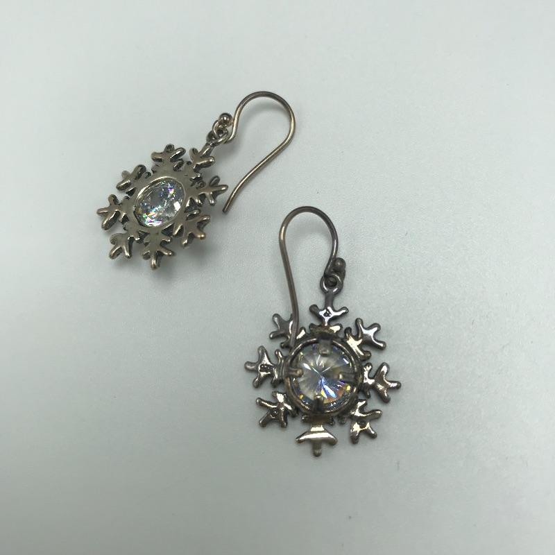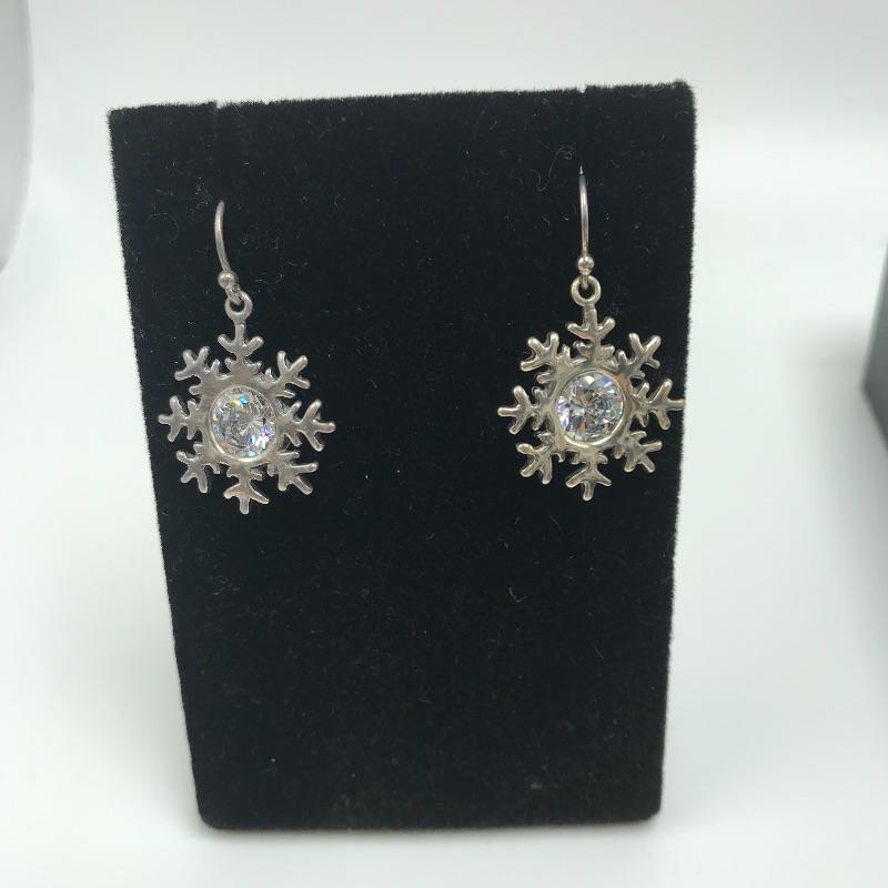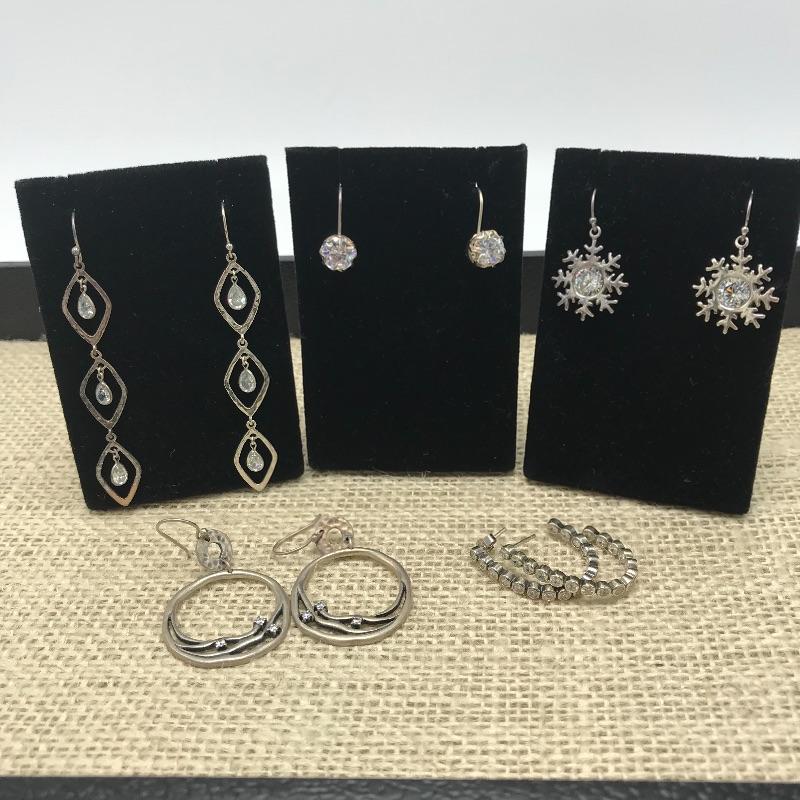 Five sparkling pairs of Silpada earrings to dazzle your look. First a 3” pair titled “Girl’s Best Friend” with sterling silver and cubic zirconia. Next pictured are also a bold cubic zirconia with sterling drop earrings on locking French wires. This pair appears to be in used condition. Channel your inner snow angel with the third pairs pictured- sterling and cubic zirconia snowflake earrings on French wires. For a more natural salute, an oxidized sterling pair with circles and waves accented with more sparkling cubic zirconia. Last photographed are half hoop cubic zirconia and sterling on posts with one back missing. See photos.