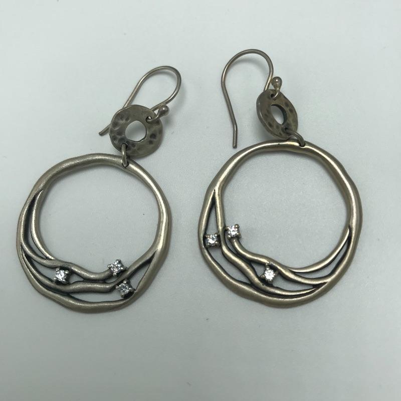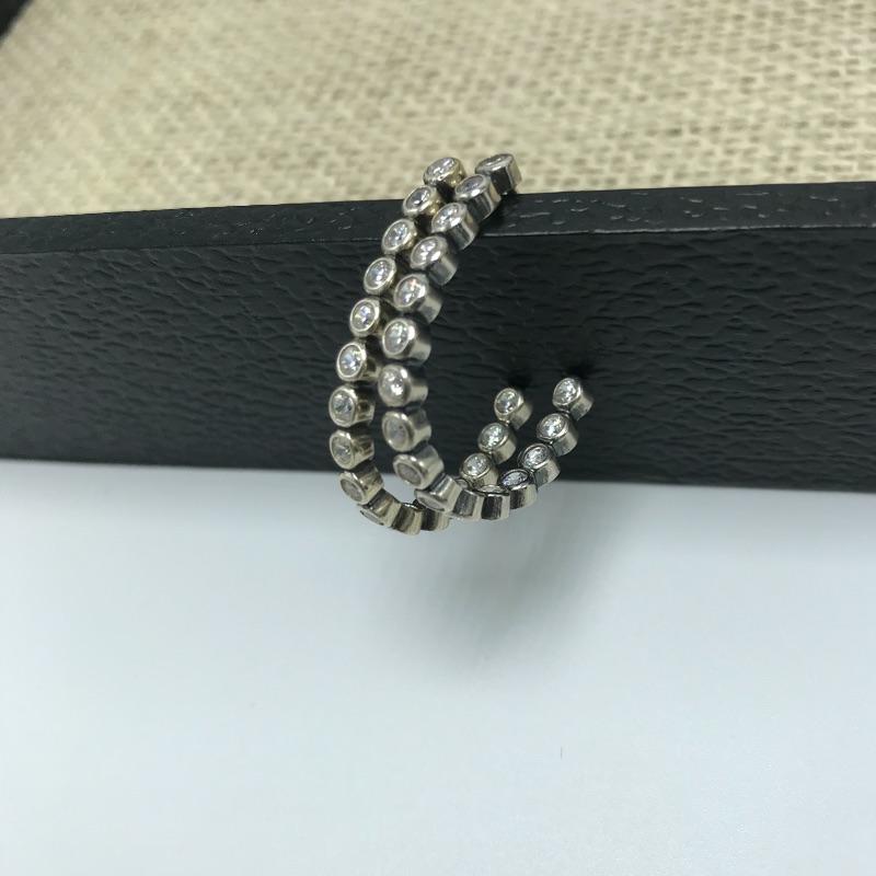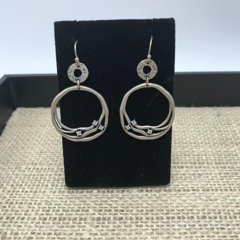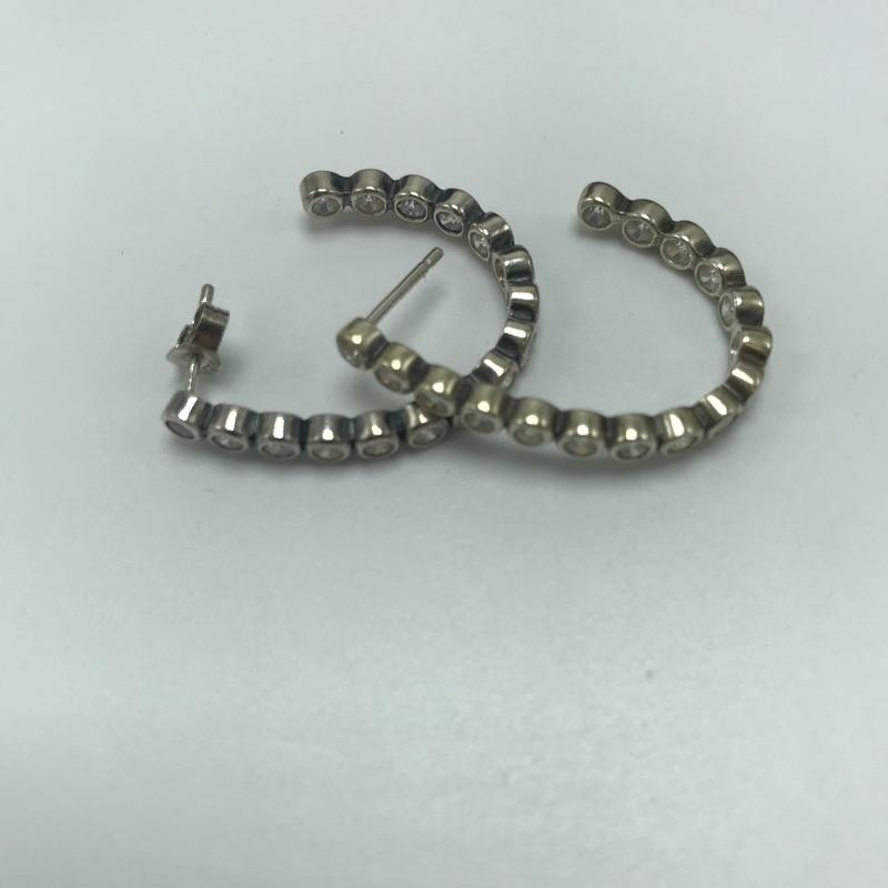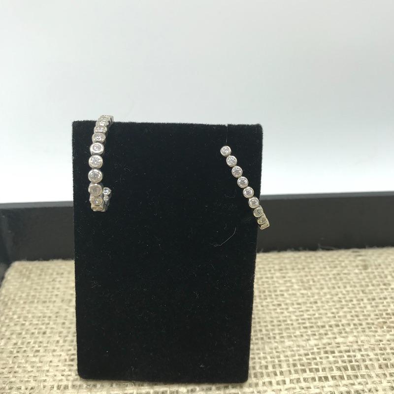 Five sparkling pairs of Silpada earrings to dazzle your look. First a 3” pair titled “Girl’s Best Friend” with sterling silver and cubic zirconia. Next pictured are also a bold cubic zirconia with sterling drop earrings on locking French wires. This pair appears to be in used condition. Channel your inner snow angel with the third pairs pictured- sterling and cubic zirconia snowflake earrings on French wires. For a more natural salute, an oxidized sterling pair with circles and waves accented with more sparkling cubic zirconia. Last photographed are half hoop cubic zirconia and sterling on posts with one back missing. See photos.