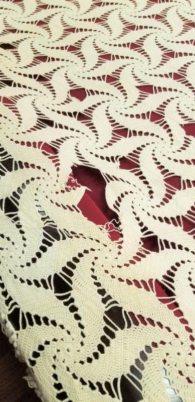 Nice vintage hand crocheted bed coverlet as shown. Well executed and clean - one "hole" as shown (easy repair). Three sides are fringed. Measures about 98" x 72".