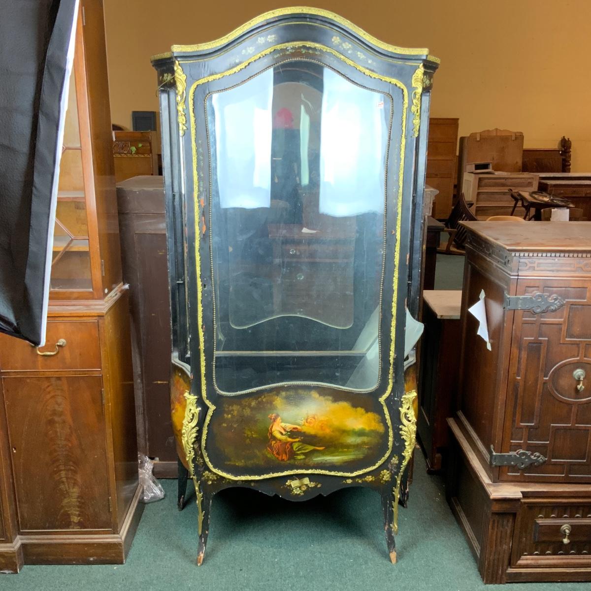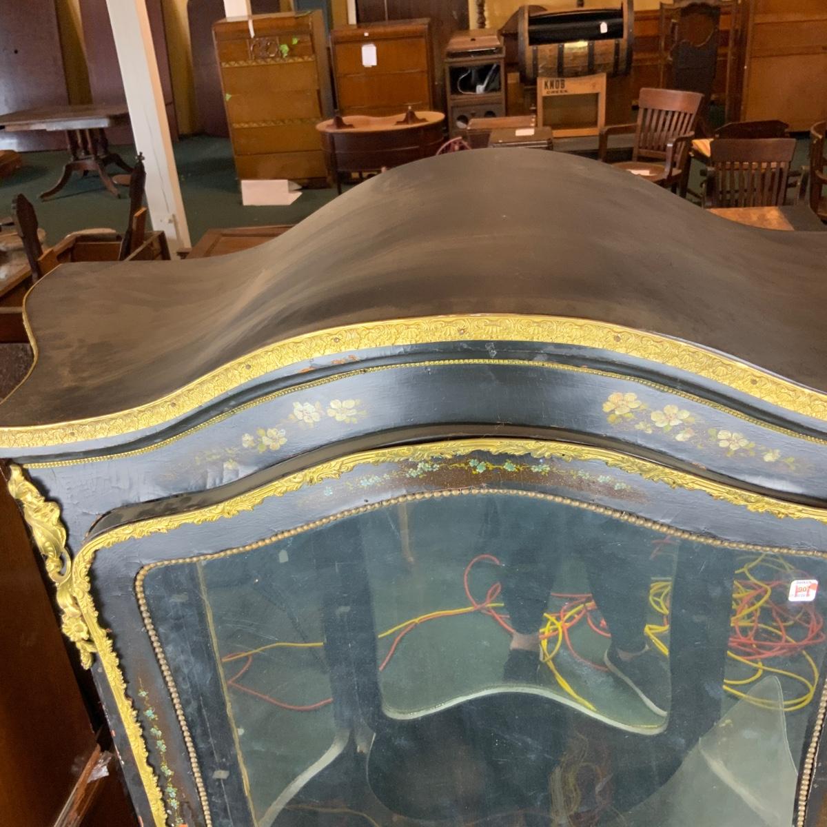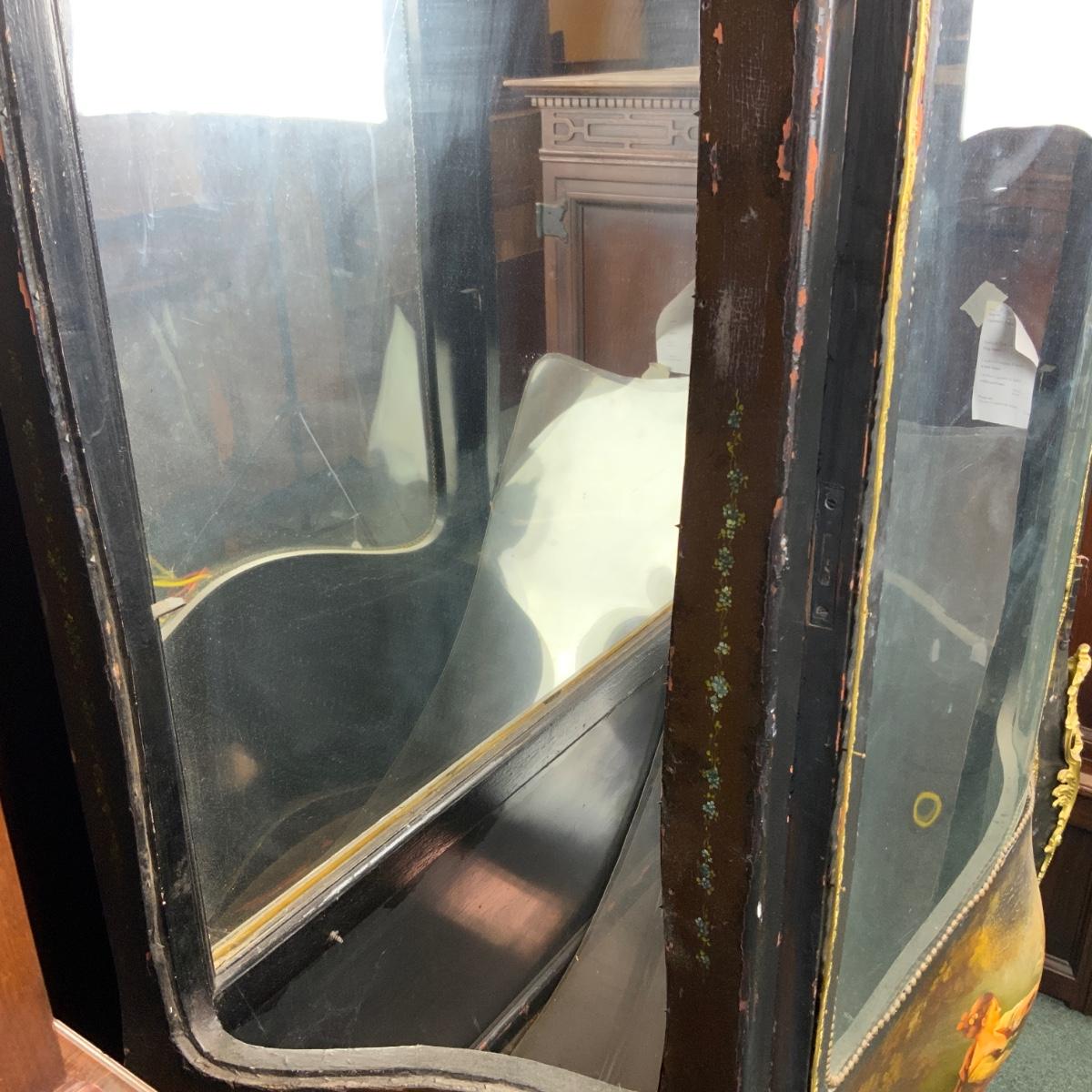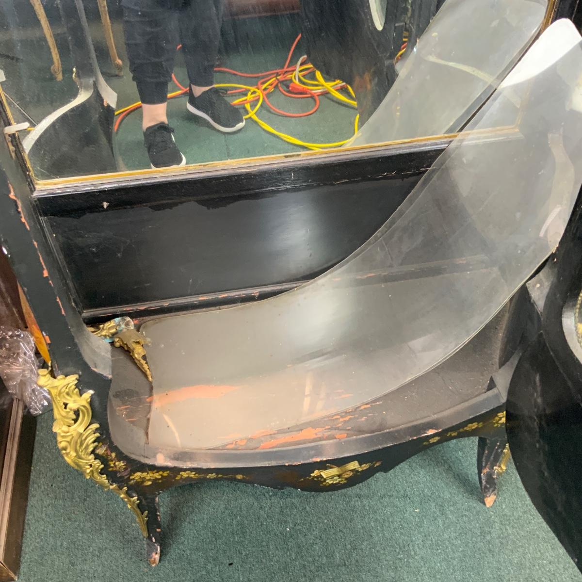 Beautiful Black Lacquered Convex Glass Cabinet. Front glass is intact. Both side pieces need to be replaced. There are plexi cut-outs included so that you can get glass Cut if you desire. //::\\ Please see photos for details and condition. No attempt has been made to hide any imperfections. All items listed in this auction are warehouse items, and need to be cleaned. A majority of the items need restoration as well. All items are sold AS IS and WITHOUT GUARANTEE. If you are uncertain about an item, DO NOT BID. Due to the nature of this online auction in-person inspection is HIGHLY recommended. All Sales are FINAL. Pick Up Times are FIRM. Please confirm with your own schedule that you can pick up in the scheduled times listed in the Terms and Conditions. Any questions please message the auctioneer. DO NOT Contact The Harp Gallery.