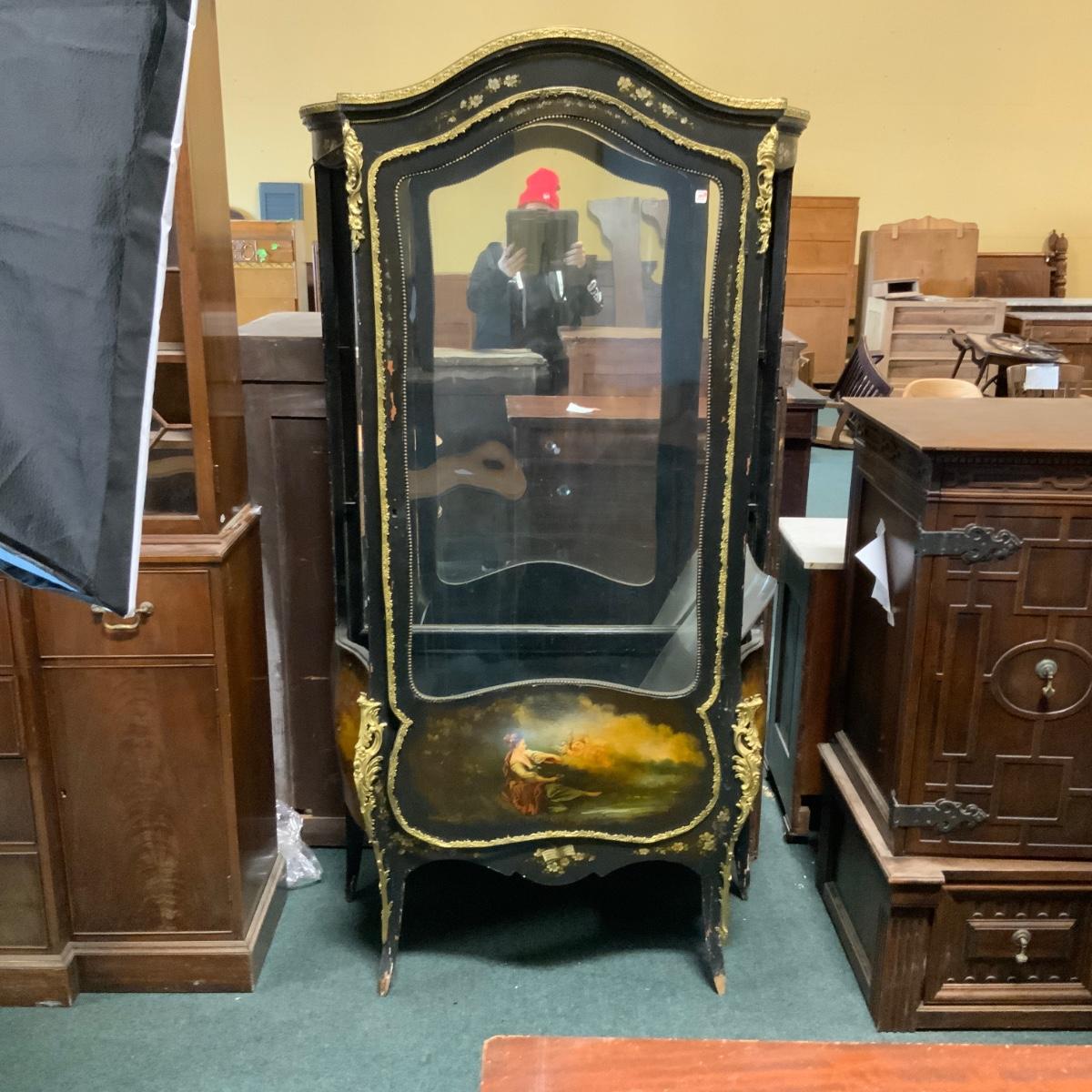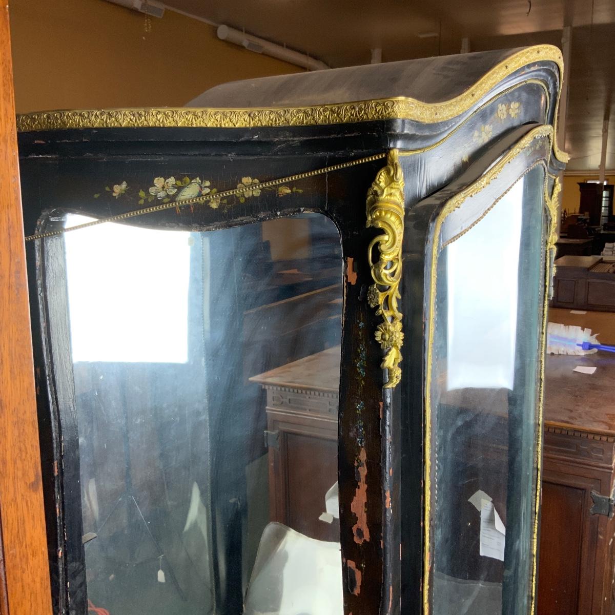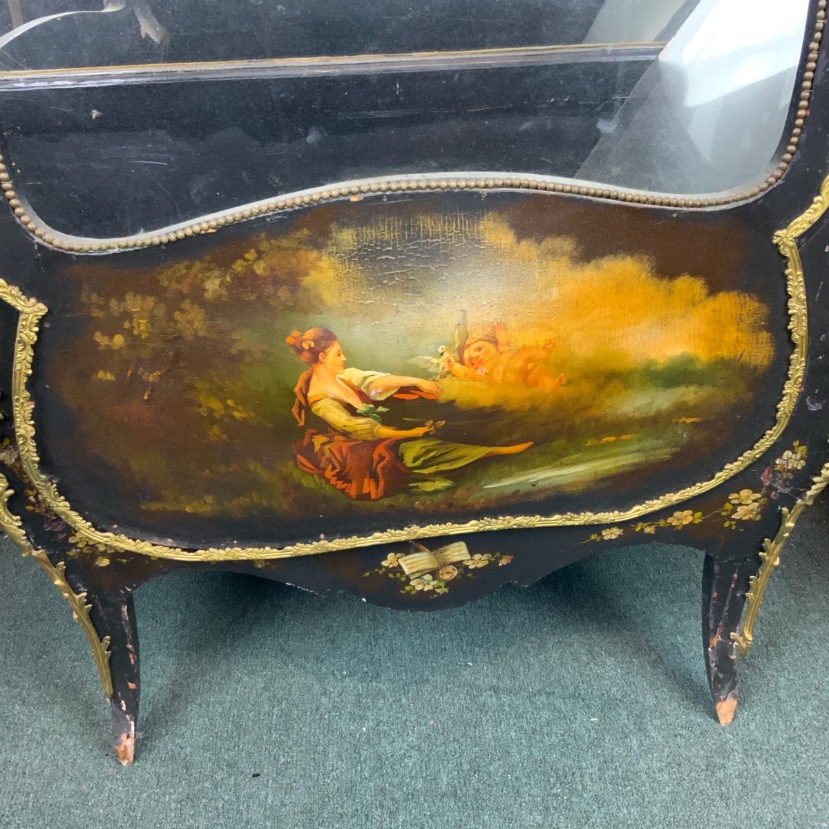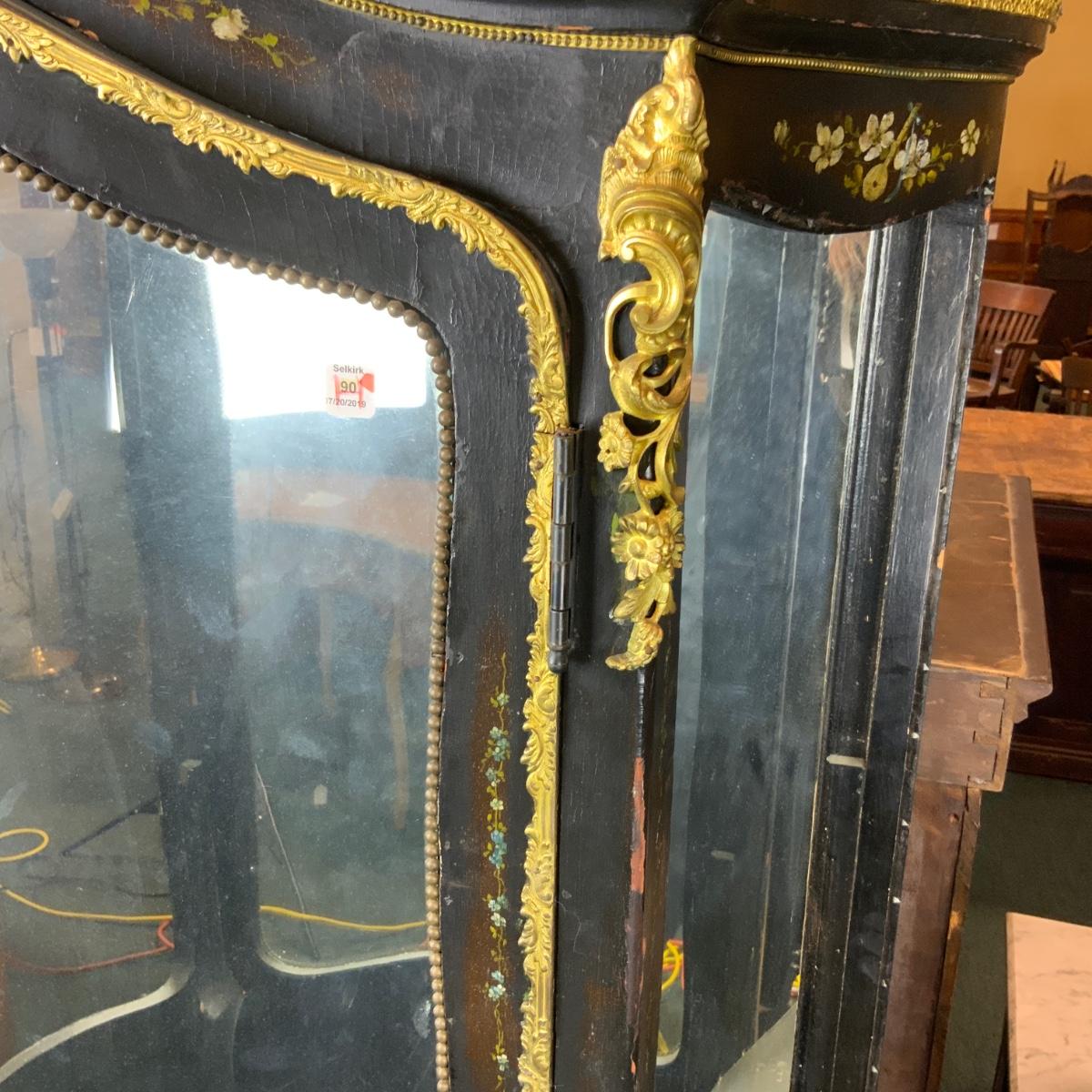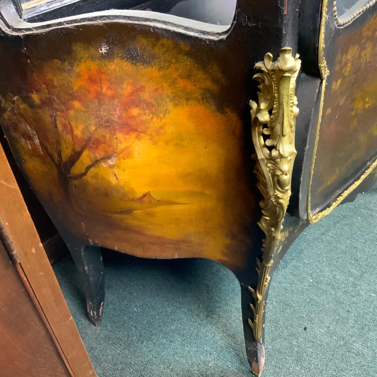 Beautiful Black Lacquered Convex Glass Cabinet. Front glass is intact. Both side pieces need to be replaced. There are plexi cut-outs included so that you can get glass Cut if you desire. //::\\ Please see photos for details and condition. No attempt has been made to hide any imperfections. All items listed in this auction are warehouse items, and need to be cleaned. A majority of the items need restoration as well. All items are sold AS IS and WITHOUT GUARANTEE. If you are uncertain about an item, DO NOT BID. Due to the nature of this online auction in-person inspection is HIGHLY recommended. All Sales are FINAL. Pick Up Times are FIRM. Please confirm with your own schedule that you can pick up in the scheduled times listed in the Terms and Conditions. Any questions please message the auctioneer. DO NOT Contact The Harp Gallery.
