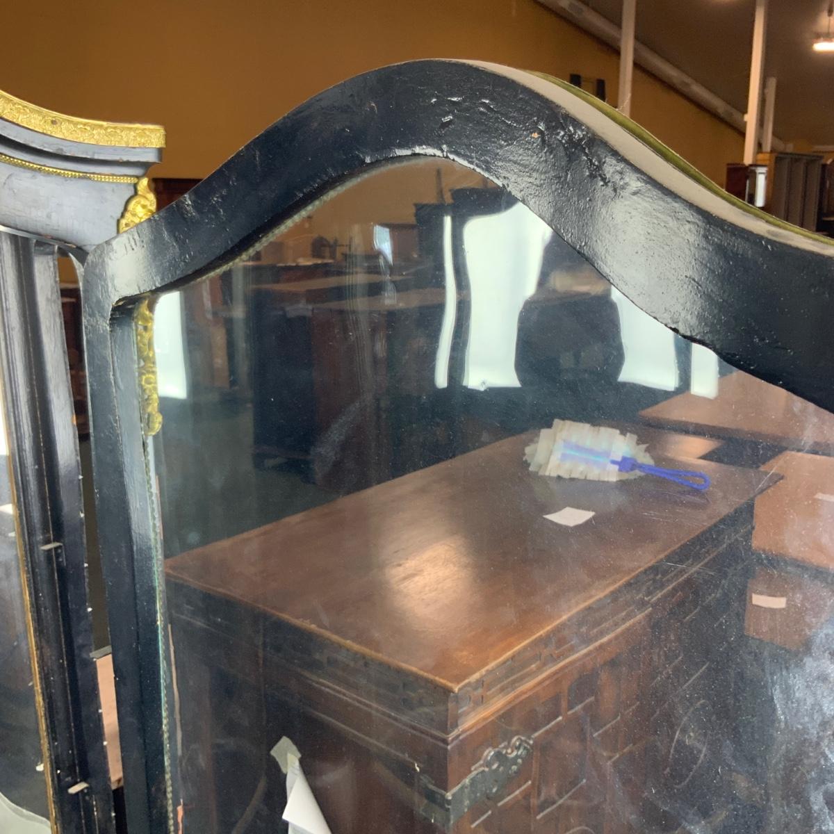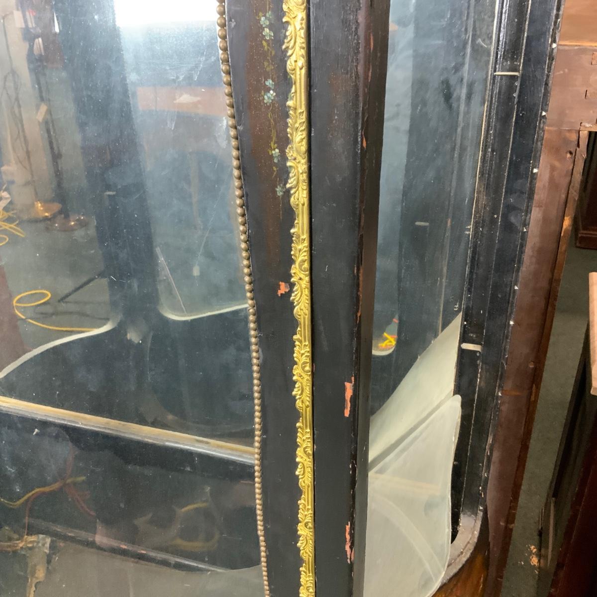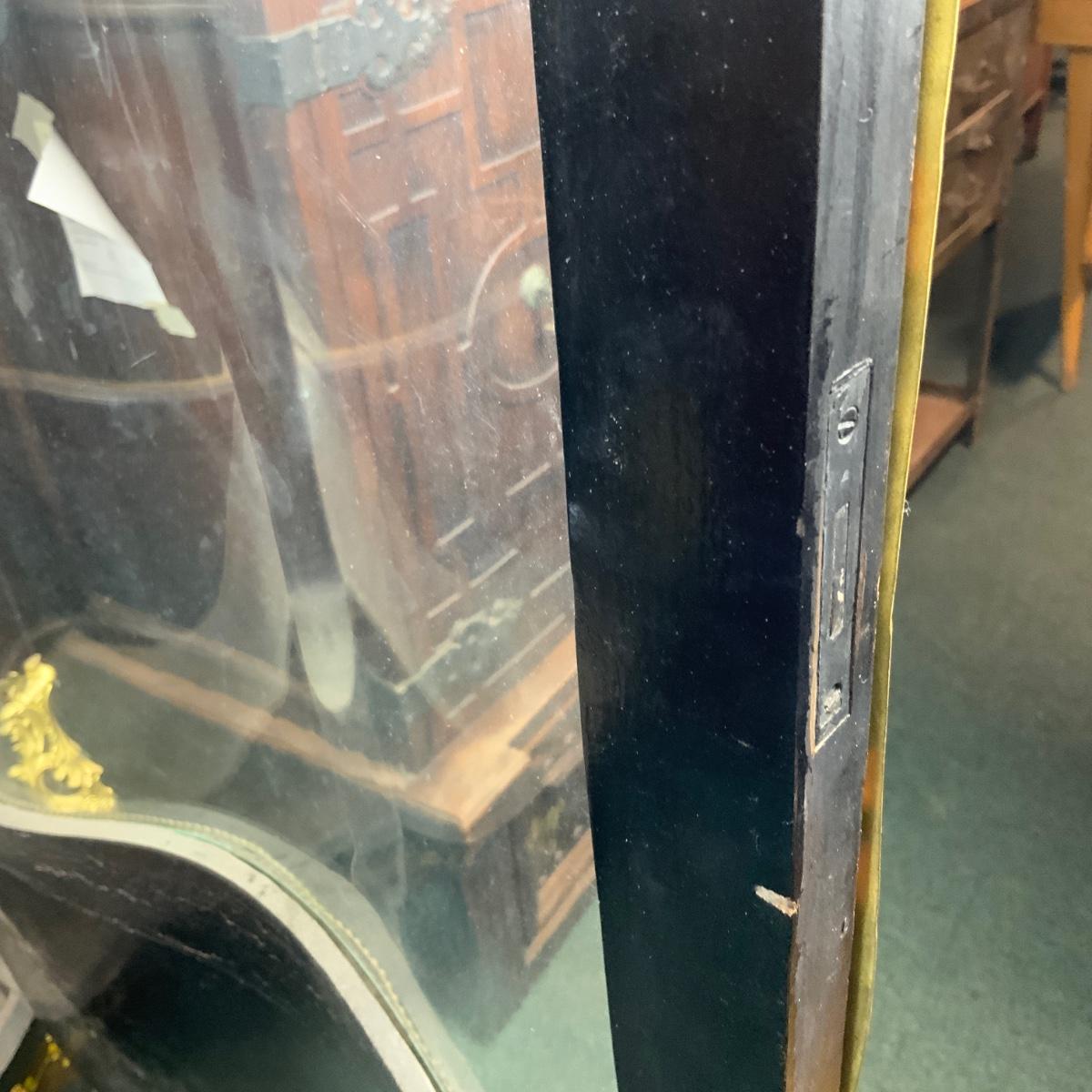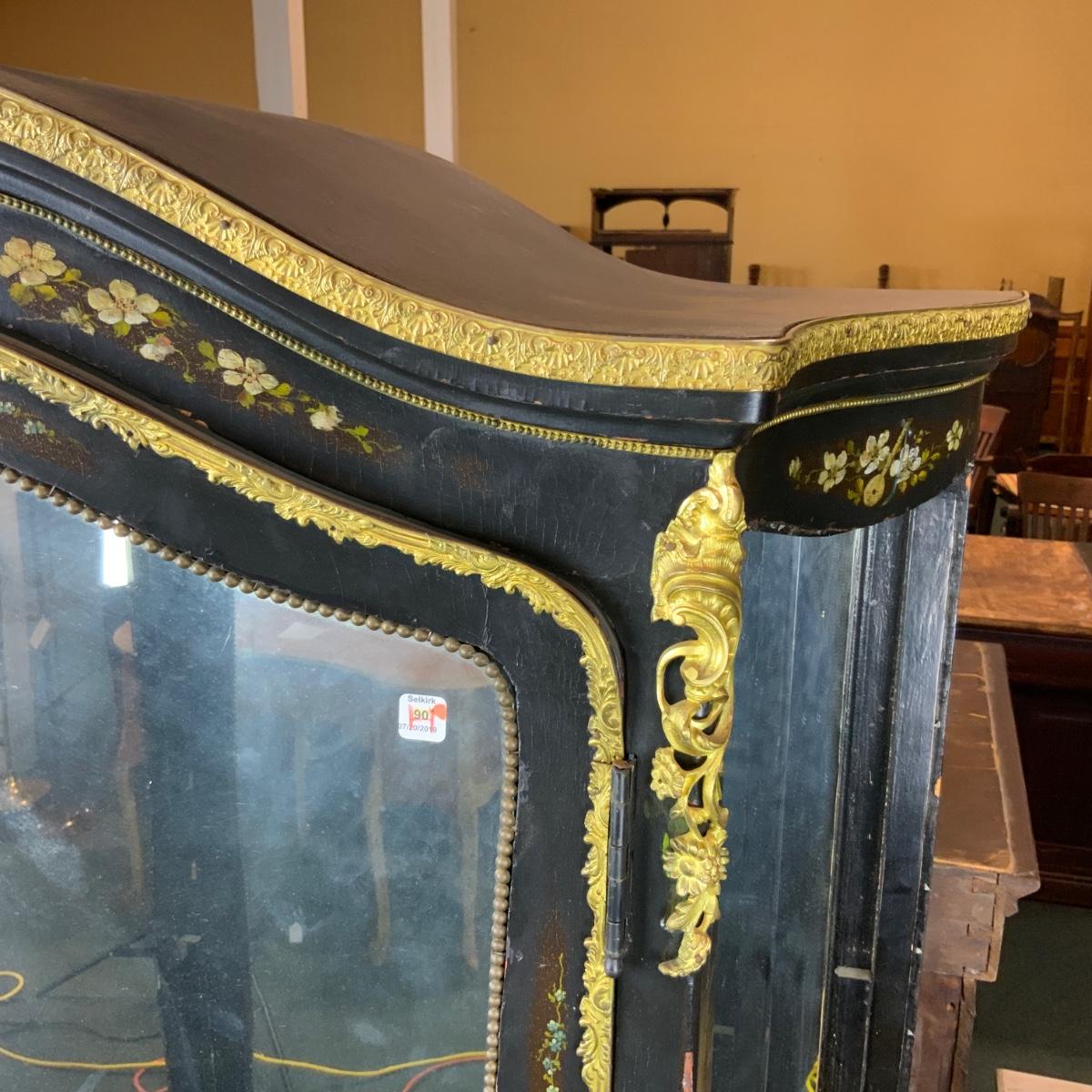 Beautiful Black Lacquered Convex Glass Cabinet. Front glass is intact. Both side pieces need to be replaced. There are plexi cut-outs included so that you can get glass Cut if you desire. //::\\ Please see photos for details and condition. No attempt has been made to hide any imperfections. All items listed in this auction are warehouse items, and need to be cleaned. A majority of the items need restoration as well. All items are sold AS IS and WITHOUT GUARANTEE. If you are uncertain about an item, DO NOT BID. Due to the nature of this online auction in-person inspection is HIGHLY recommended. All Sales are FINAL. Pick Up Times are FIRM. Please confirm with your own schedule that you can pick up in the scheduled times listed in the Terms and Conditions. Any questions please message the auctioneer. DO NOT Contact The Harp Gallery.