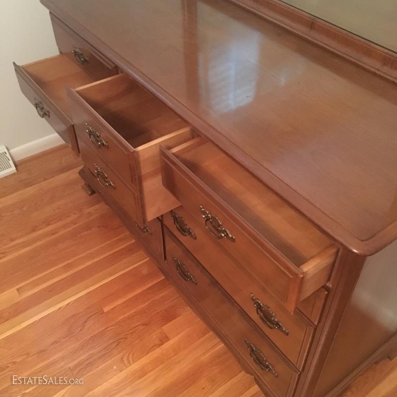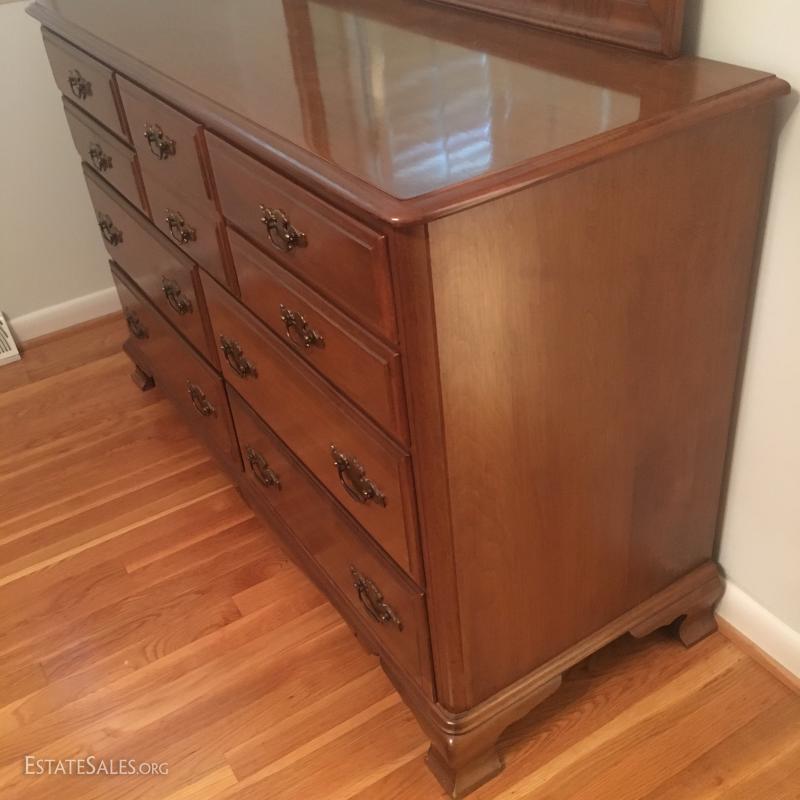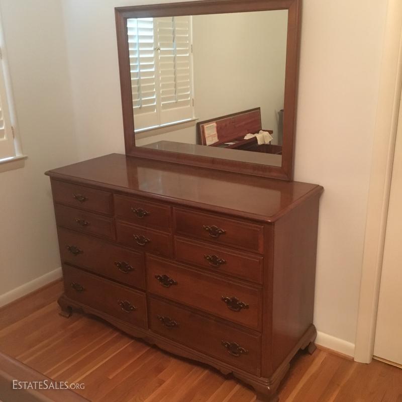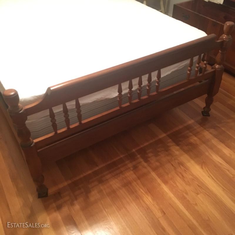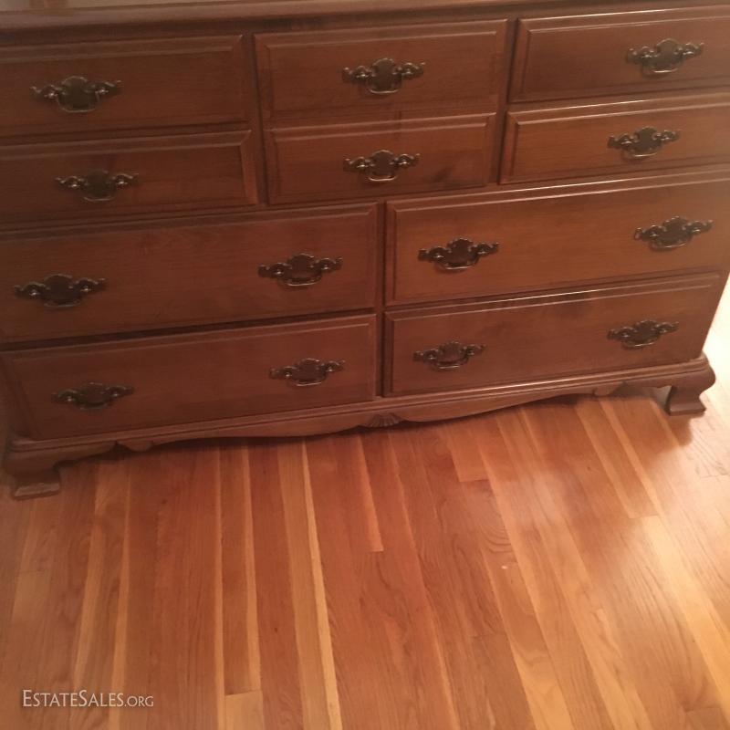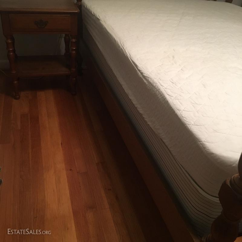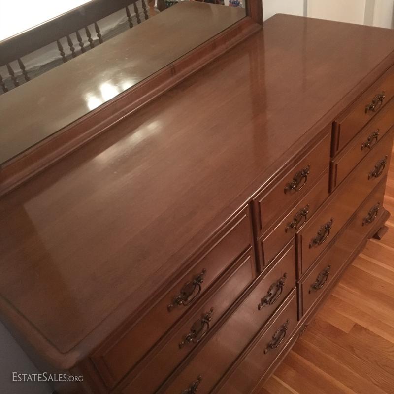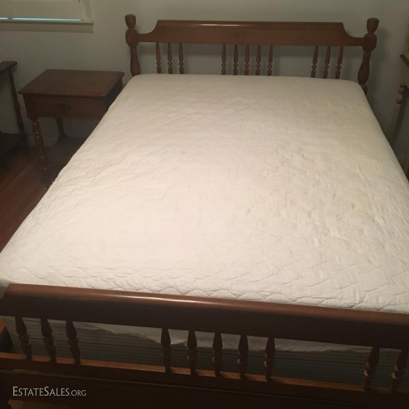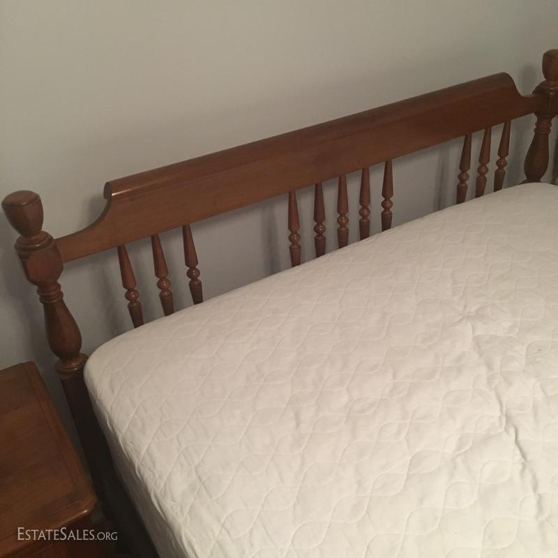 Double bed, dresser with mirror and side table. Pieces are in good condition. Bed is a double and mattress is available for free if winner wants it. Dresser measures 54.5" x20" x34" and mirror attaches and measures 42" x32". Headboard of bed measures 55" x38" and side table measures 15" x 18.5" x 25.5". This lot is available for local pick up in Asheville, NC only.