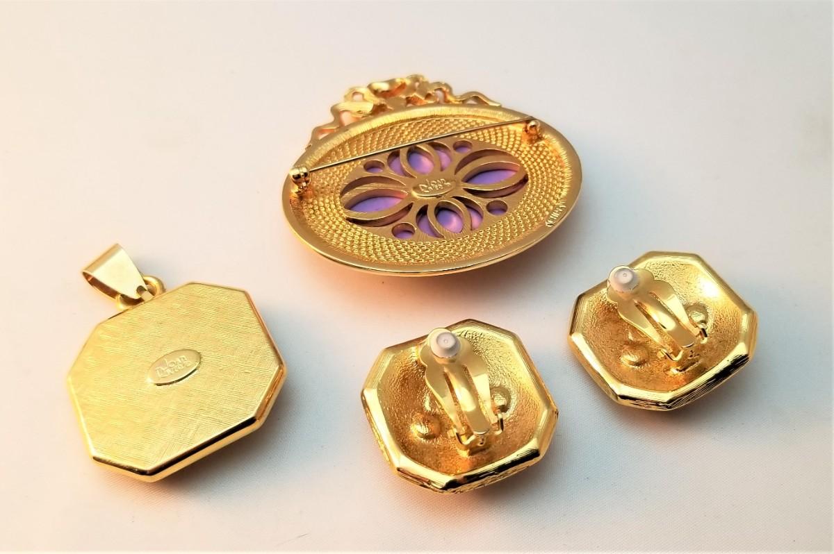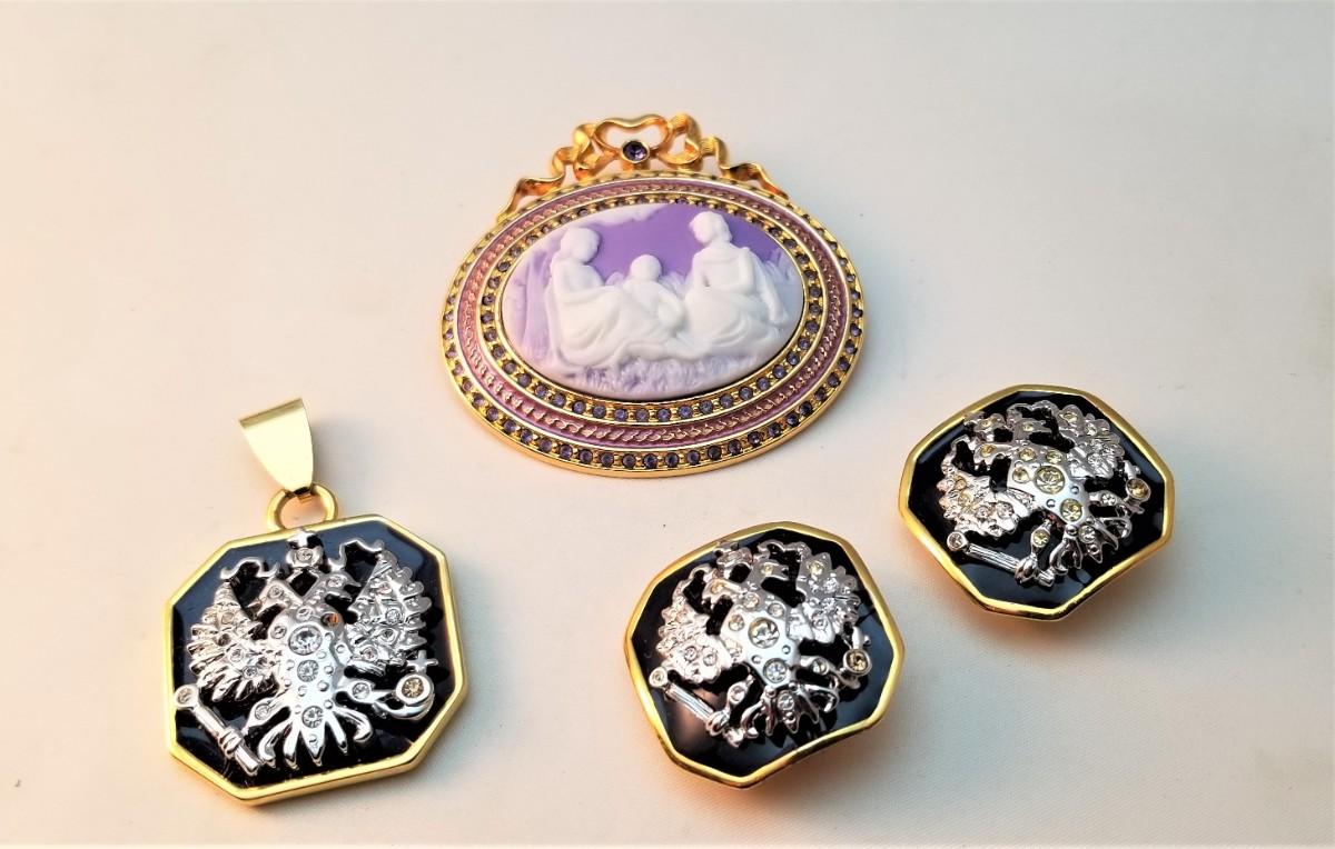 You get all you see here - pretty Joan Rivers "cameo" brooch, Russian two-headed eagle pendant and matching clip earrings. All pieces are signed and in excellent condition. No boxes. Cameo-type pin is 1.75" across. Pendant is 1.5" long, earrings are 1 inch across.