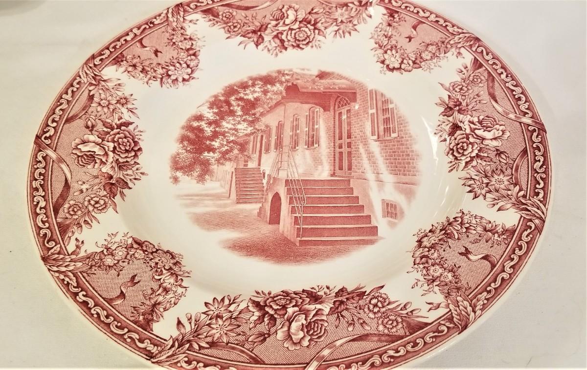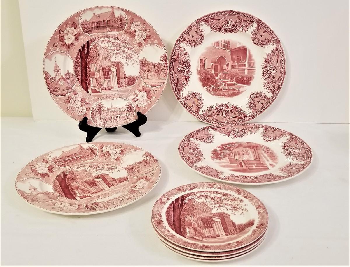 4 dinner plates (10" across), 4 smaller plates (7" across) - mulberry transferware, Staffordshire (England). All showing historical scenes from Salem (now Winston-Salem), North Carolina.