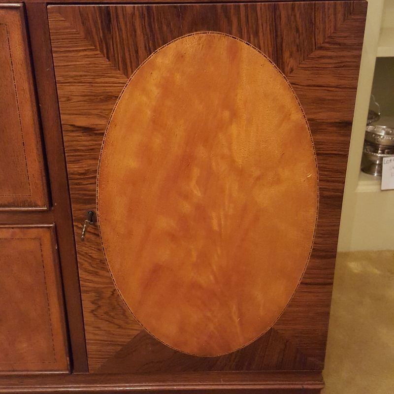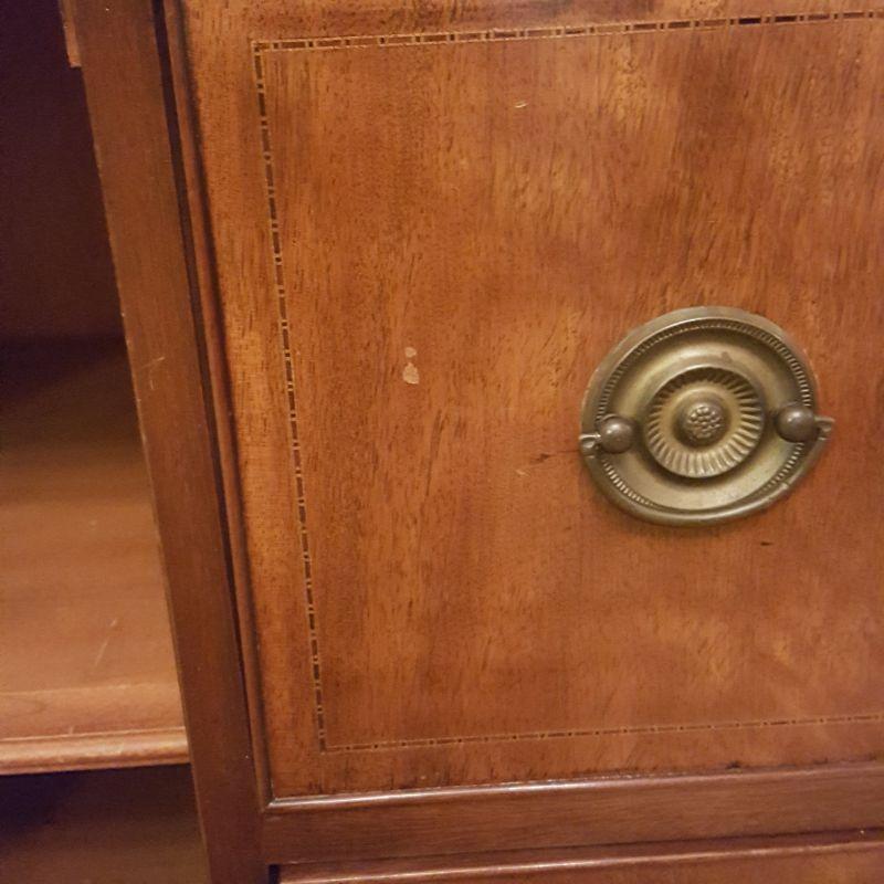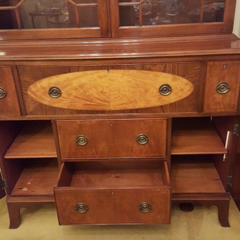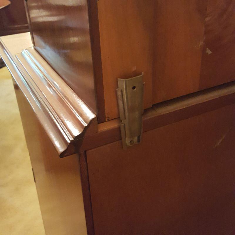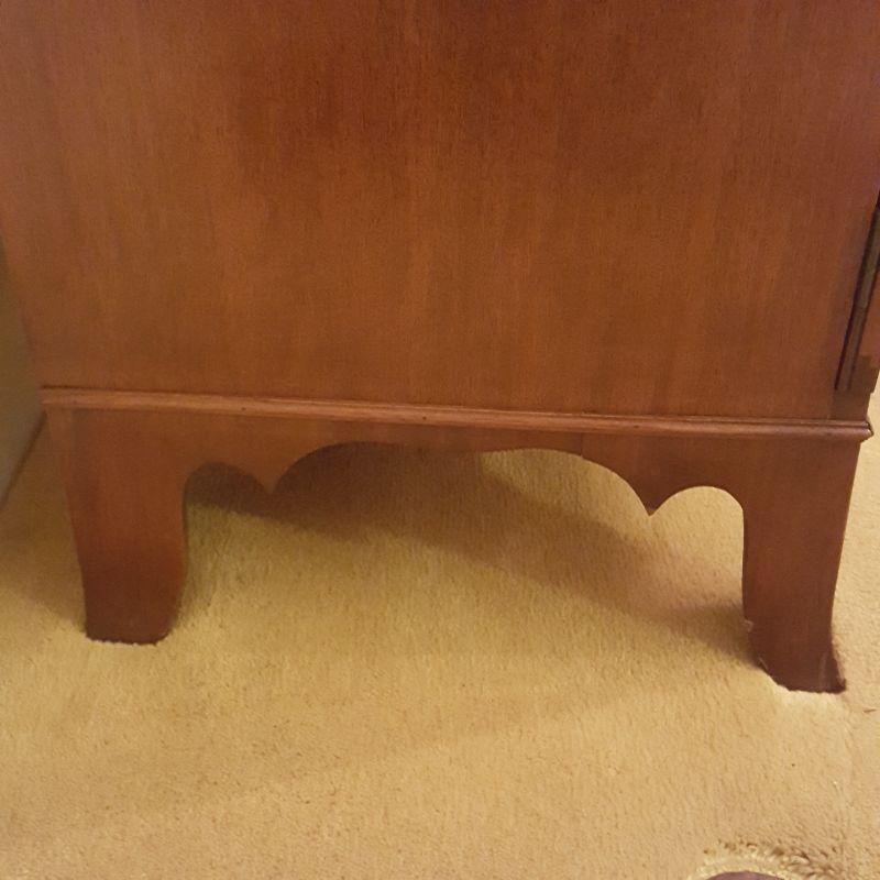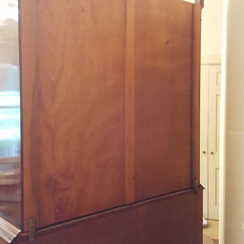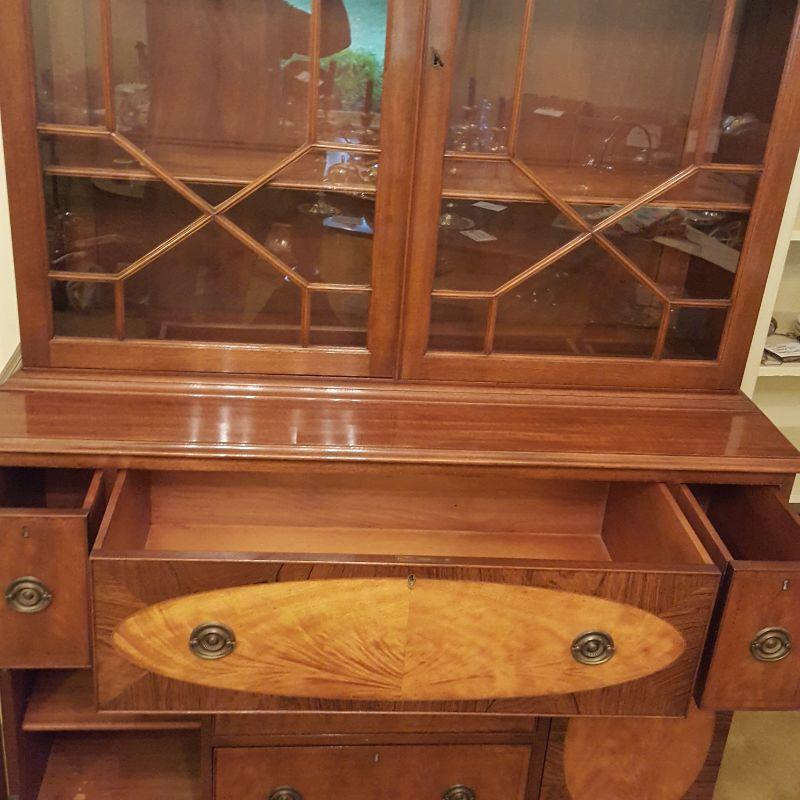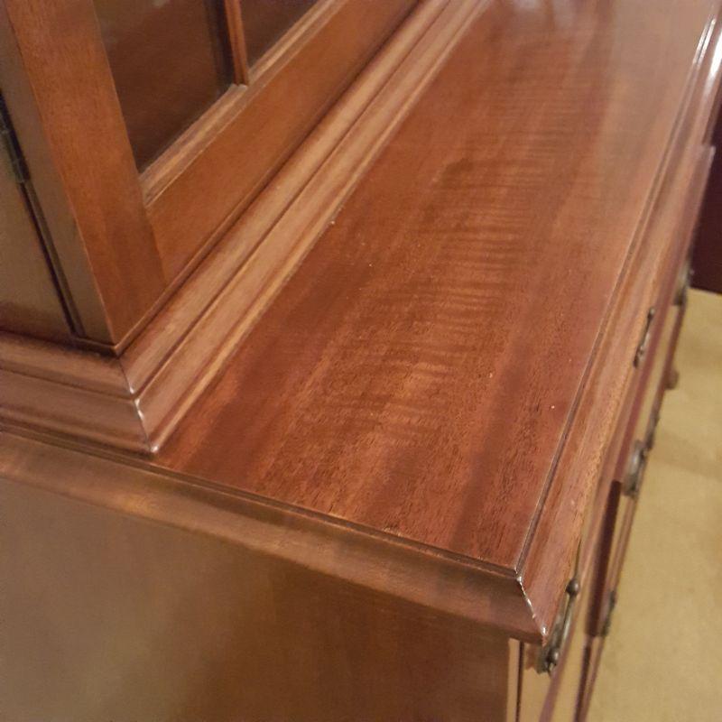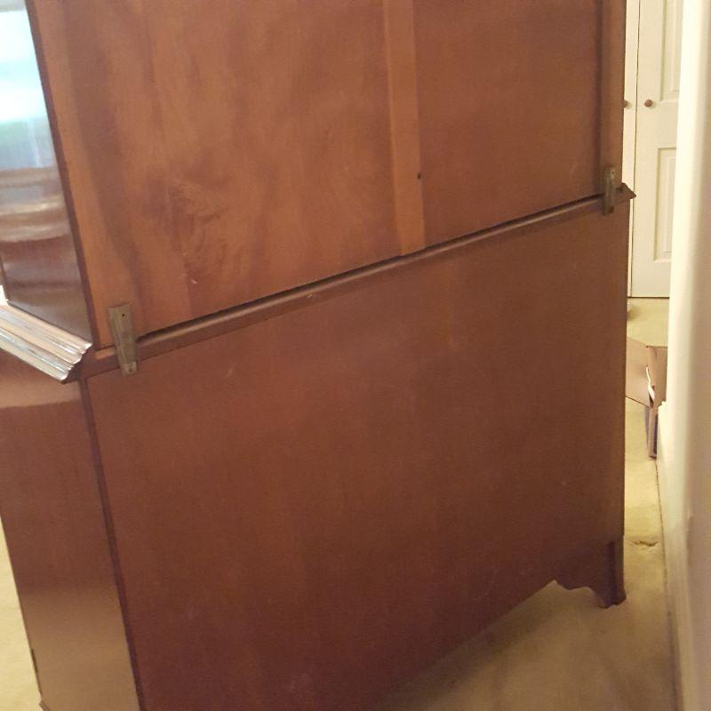 This beautiful hutch called Marlboro Manor by Sacks features inlay wood work, a metal bird perched at the top, a glass cabinet and 5 drawers and 2 cabinets. The glass hutch does come off the base for easy transport. There is wear at the feet of the hutch, and the left lower cabinet needs the screws tightened and a stain on the bottom shelf, see pictures. There is also a few nicks on the drawer. Other than these minor blemishes, it’s a beauty that has many stories to tell. The hutch comes with a key to lock the glass top and all the drawers. This piece measures 48x19x91 inches. The 91" is to the top of the bird. There is 8 inches from the glass cabinet to the edge of the base cabinet, see pictures.
