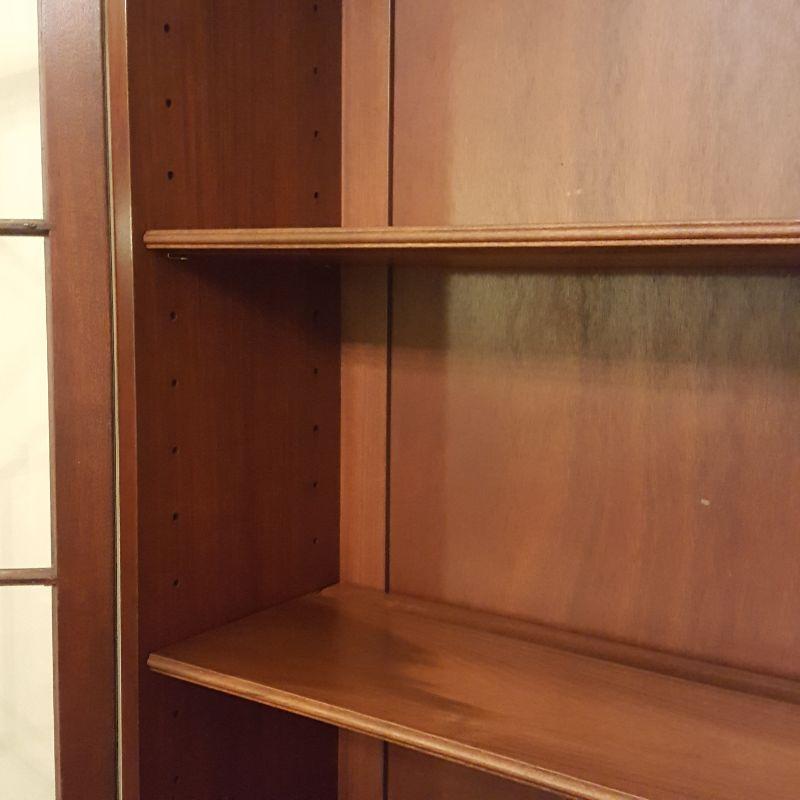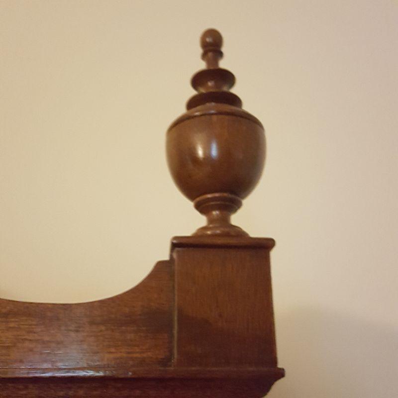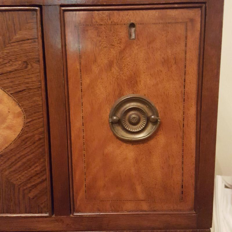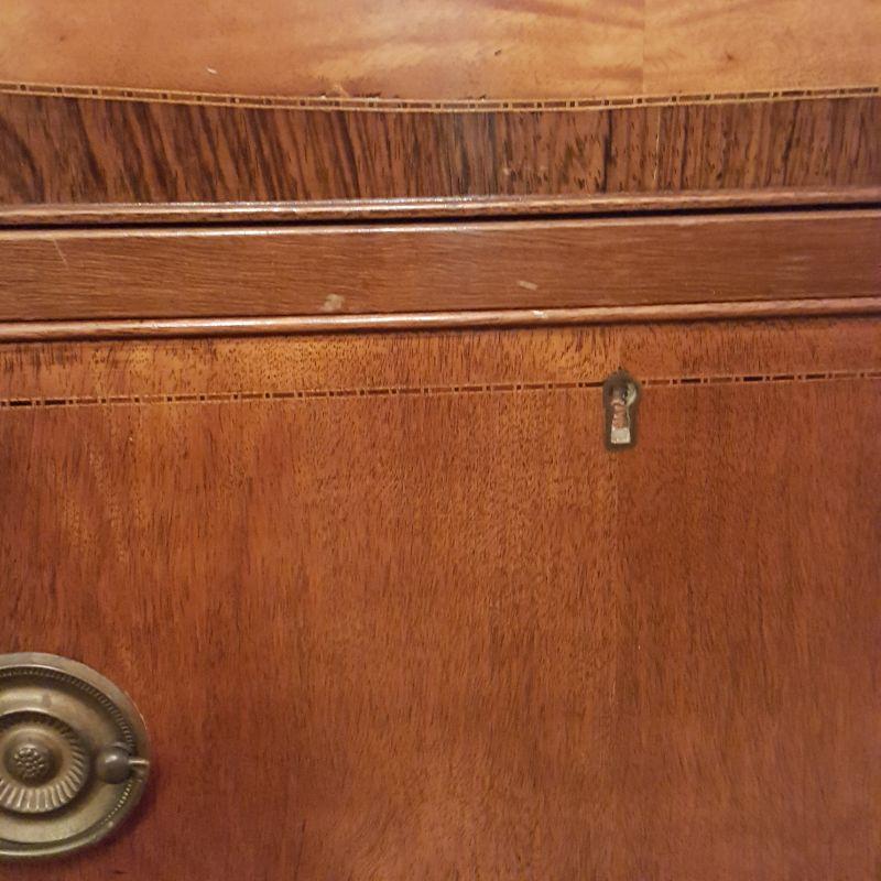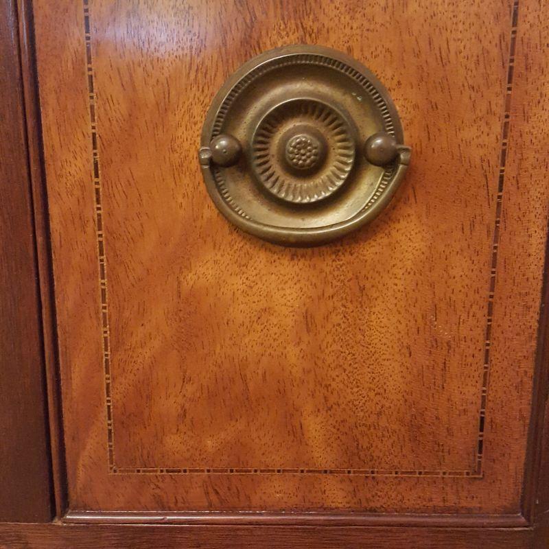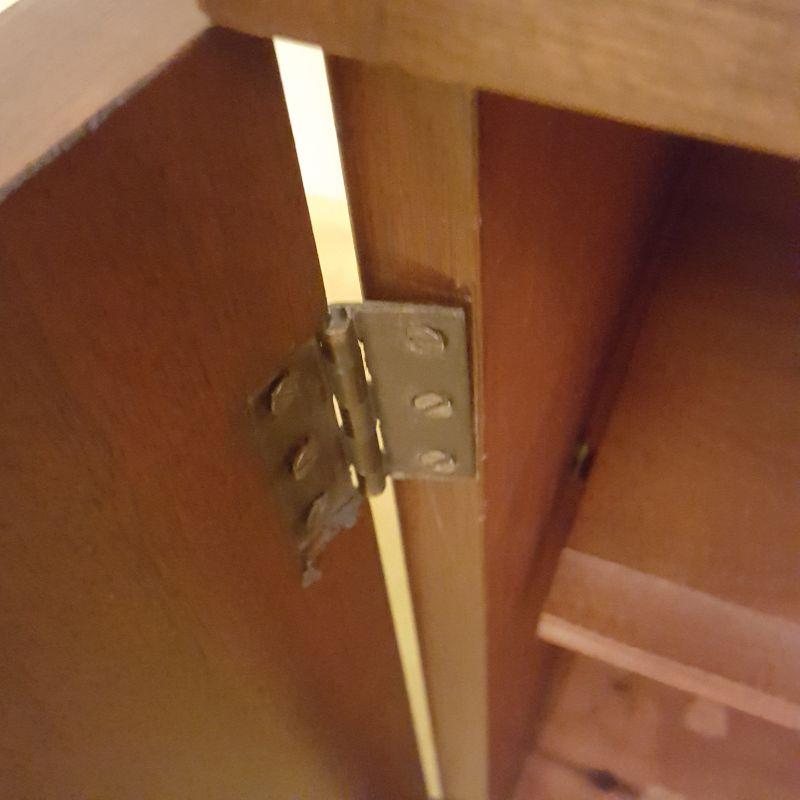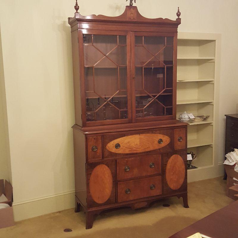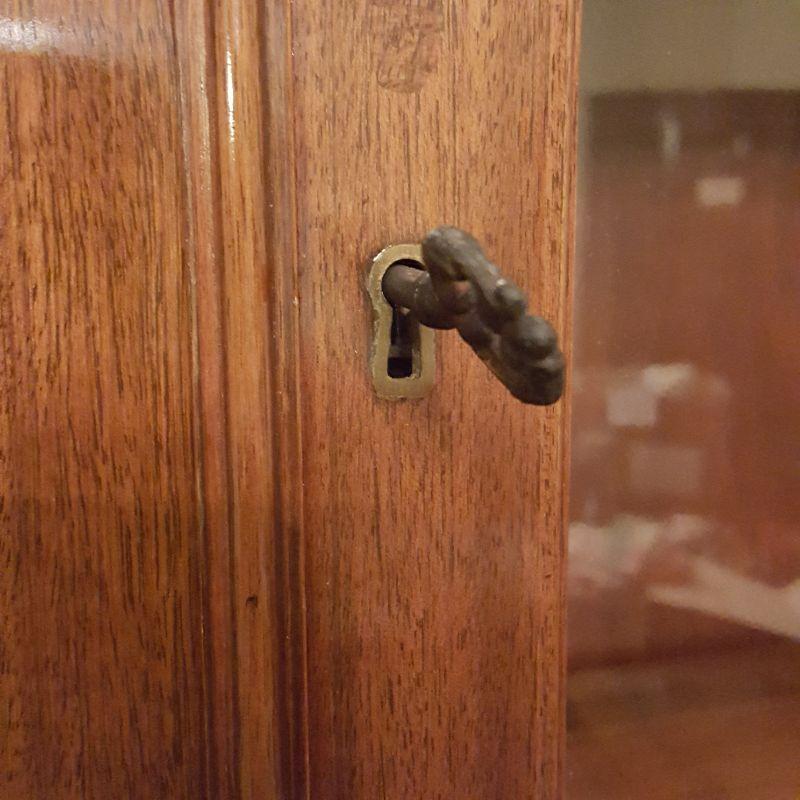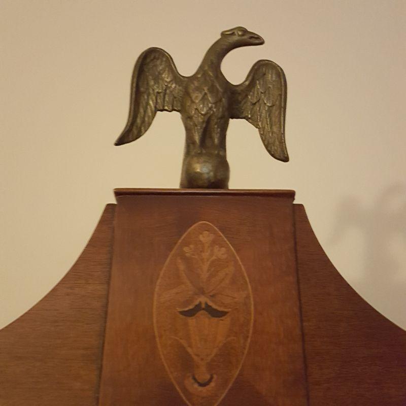 This beautiful hutch called Marlboro Manor by Sacks features inlay wood work, a metal bird perched at the top, a glass cabinet and 5 drawers and 2 cabinets. The glass hutch does come off the base for easy transport. There is wear at the feet of the hutch, and the left lower cabinet needs the screws tightened and a stain on the bottom shelf, see pictures. There is also a few nicks on the drawer. Other than these minor blemishes, it’s a beauty that has many stories to tell. The hutch comes with a key to lock the glass top and all the drawers. This piece measures 48x19x91 inches. The 91" is to the top of the bird. There is 8 inches from the glass cabinet to the edge of the base cabinet, see pictures.
