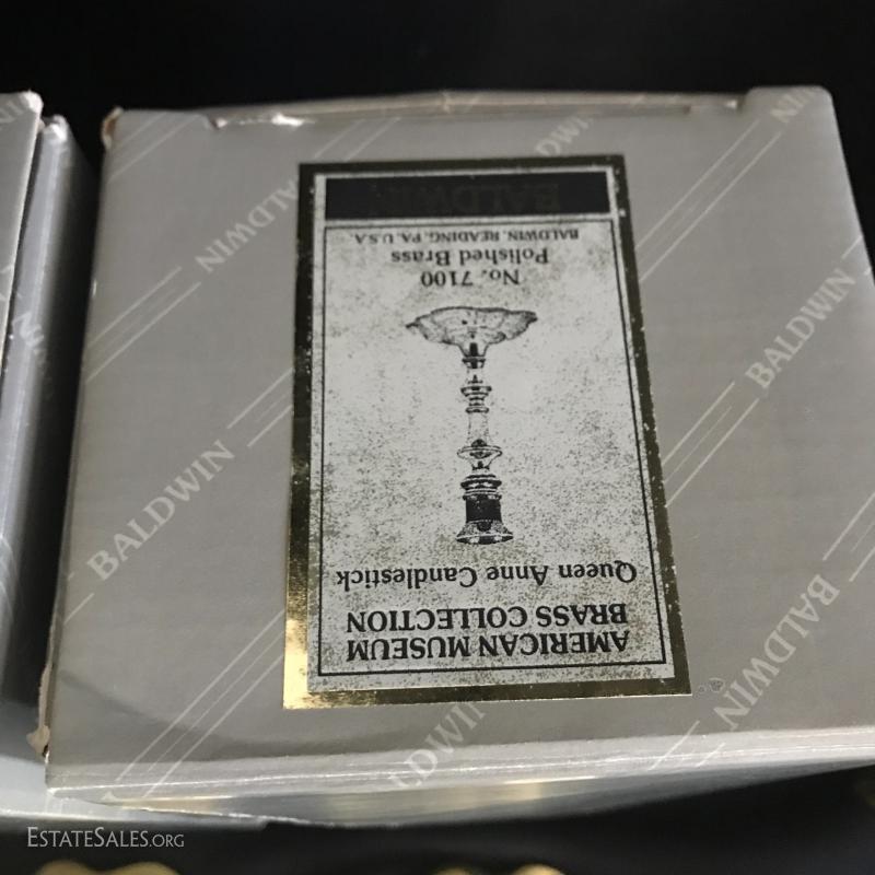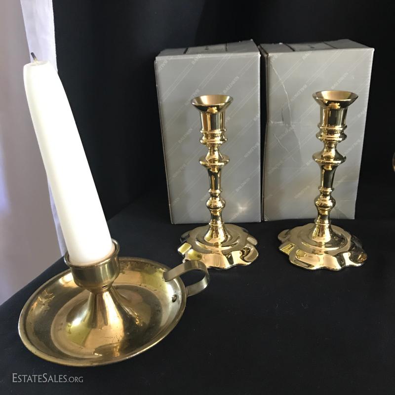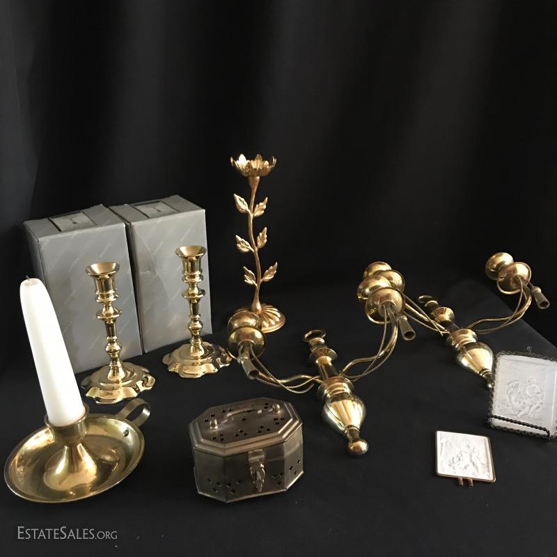 Large lot of brass pieces. 2 wall scones, 4 candle holders(2 matching Baldwin new in box), small cricket box and two Lithopanes with etched relief.