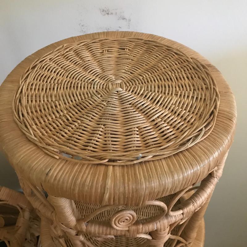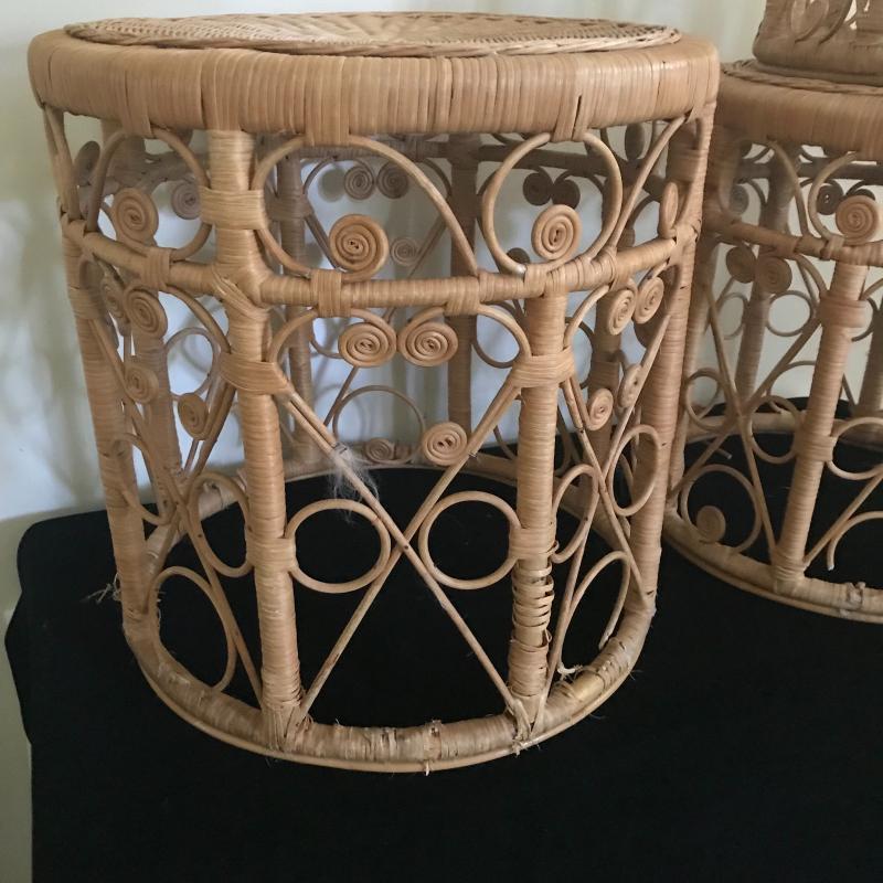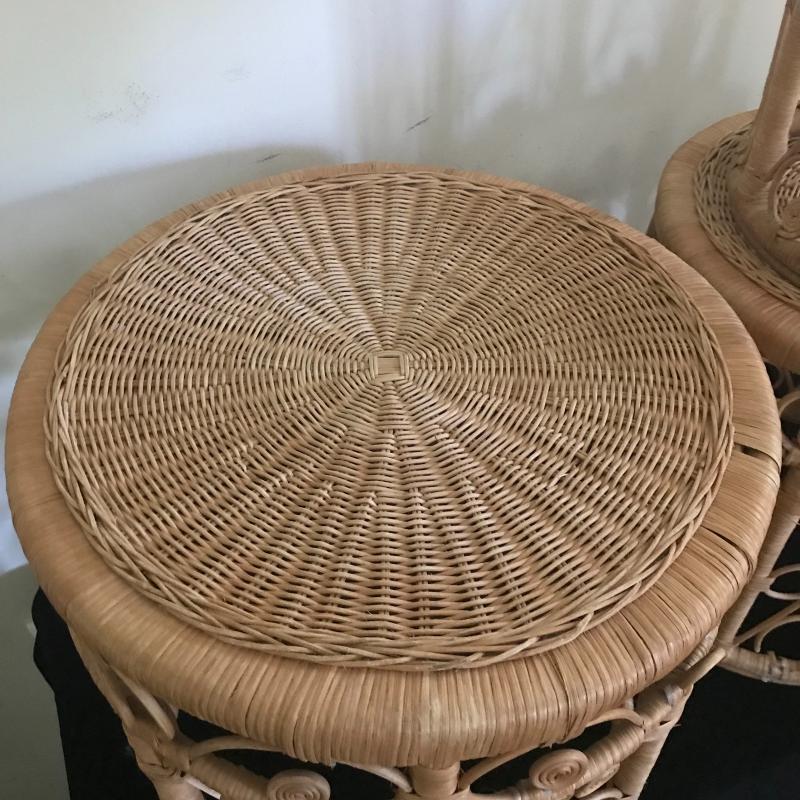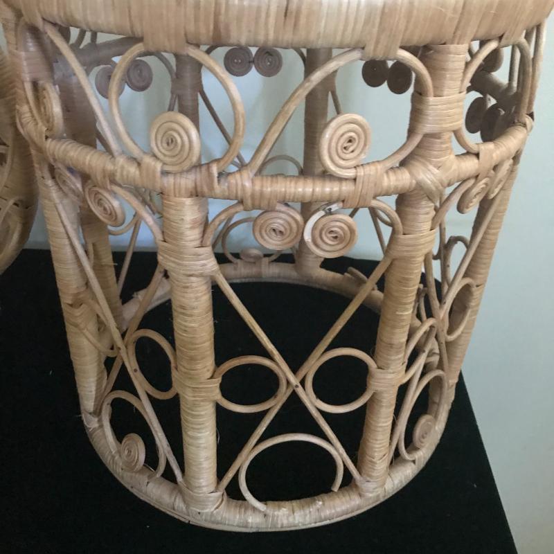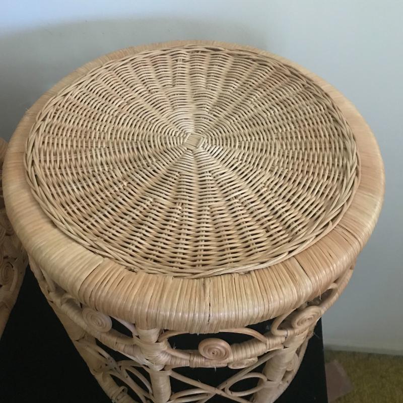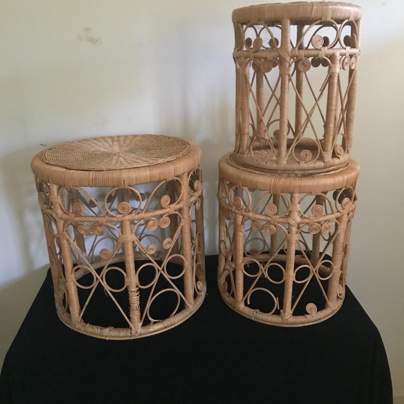 Set of 3 stools or tables made of wicker. Sturdy and in good condition with some broken pieces as the detail work is fragile. Largest one measures 18” diameter and stands 18” tall. Local pick up only.