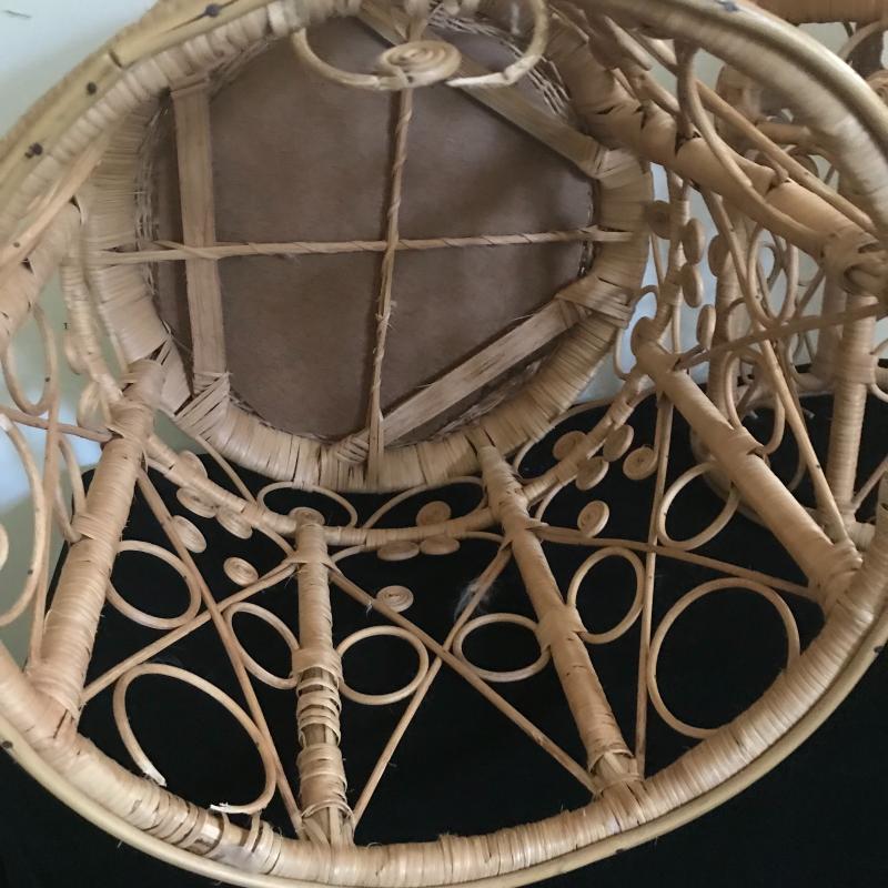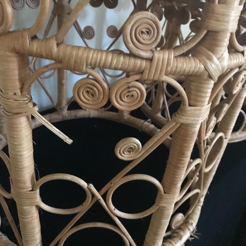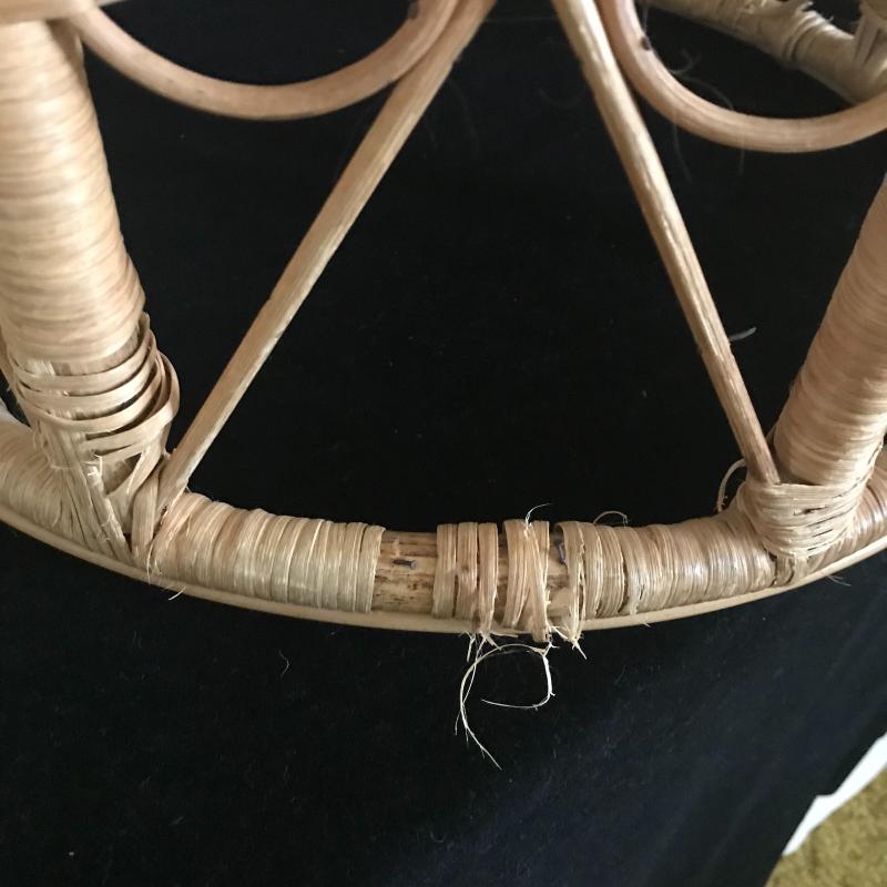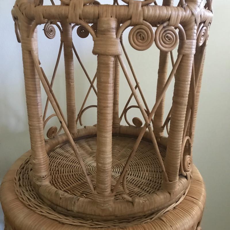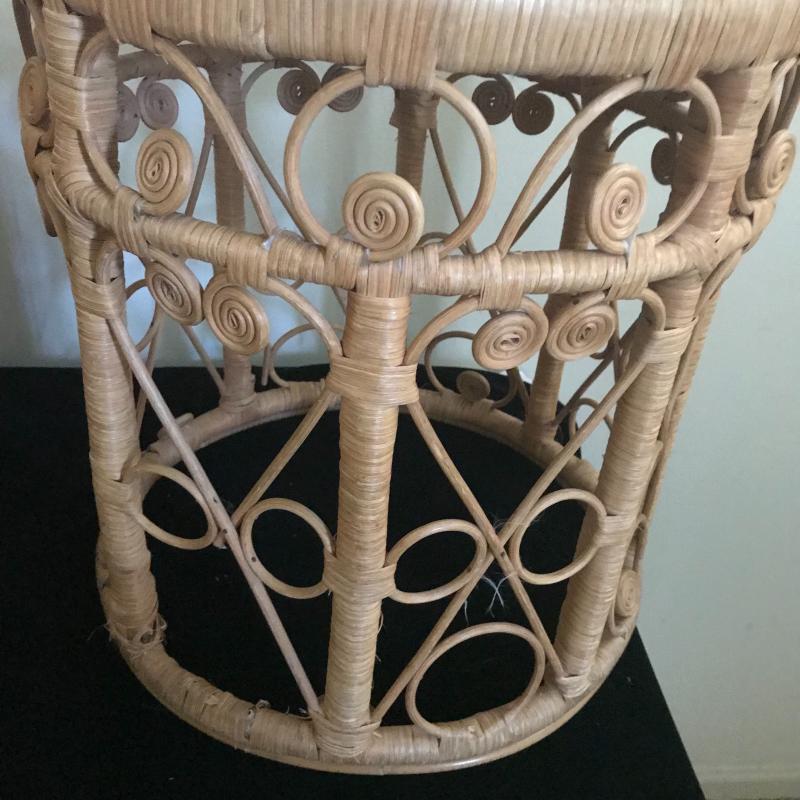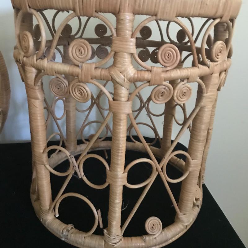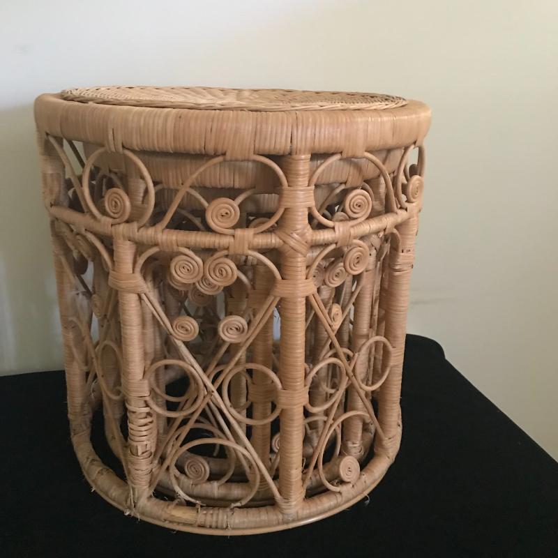 Set of 3 stools or tables made of wicker. Sturdy and in good condition with some broken pieces as the detail work is fragile. Largest one measures 18” diameter and stands 18” tall. Local pick up only.