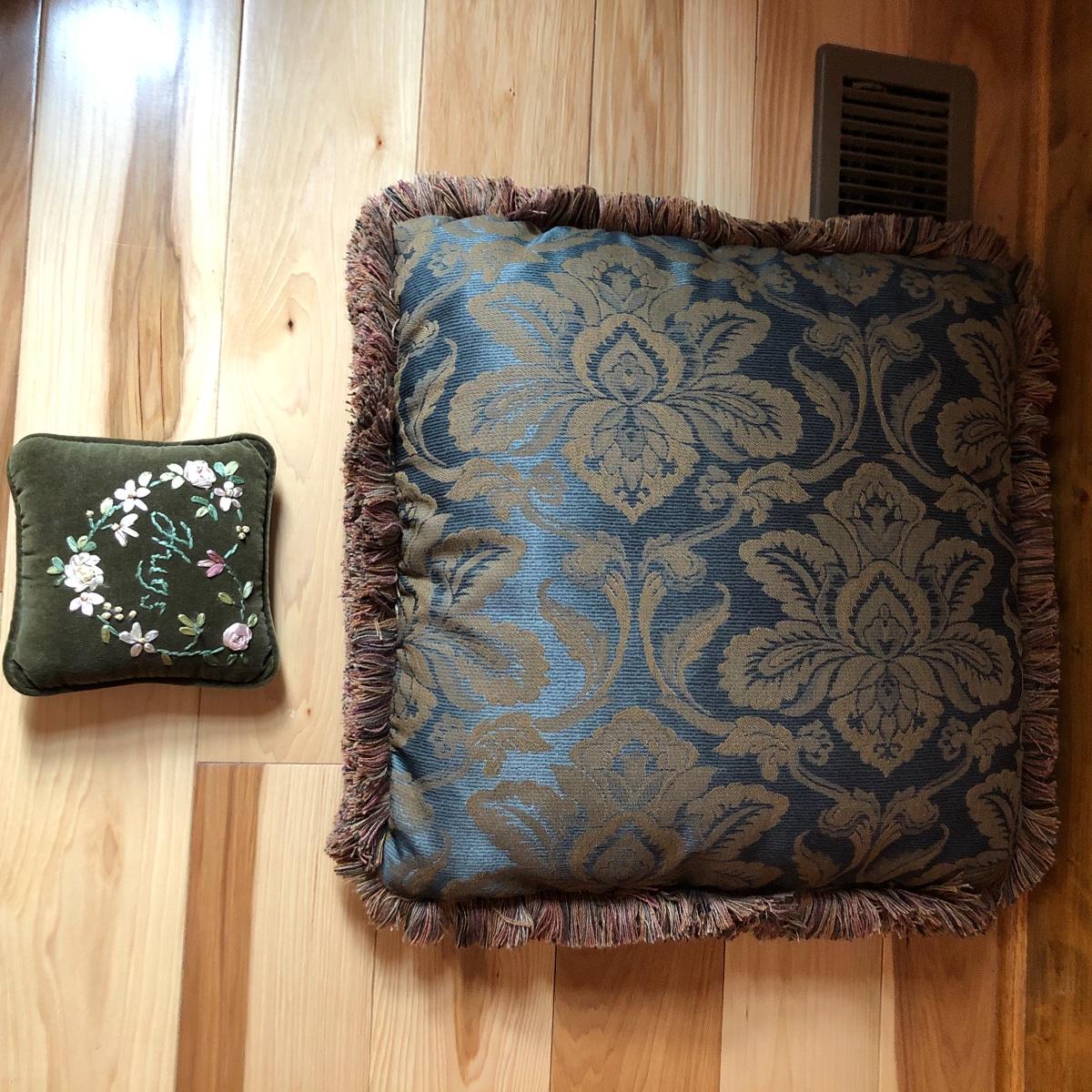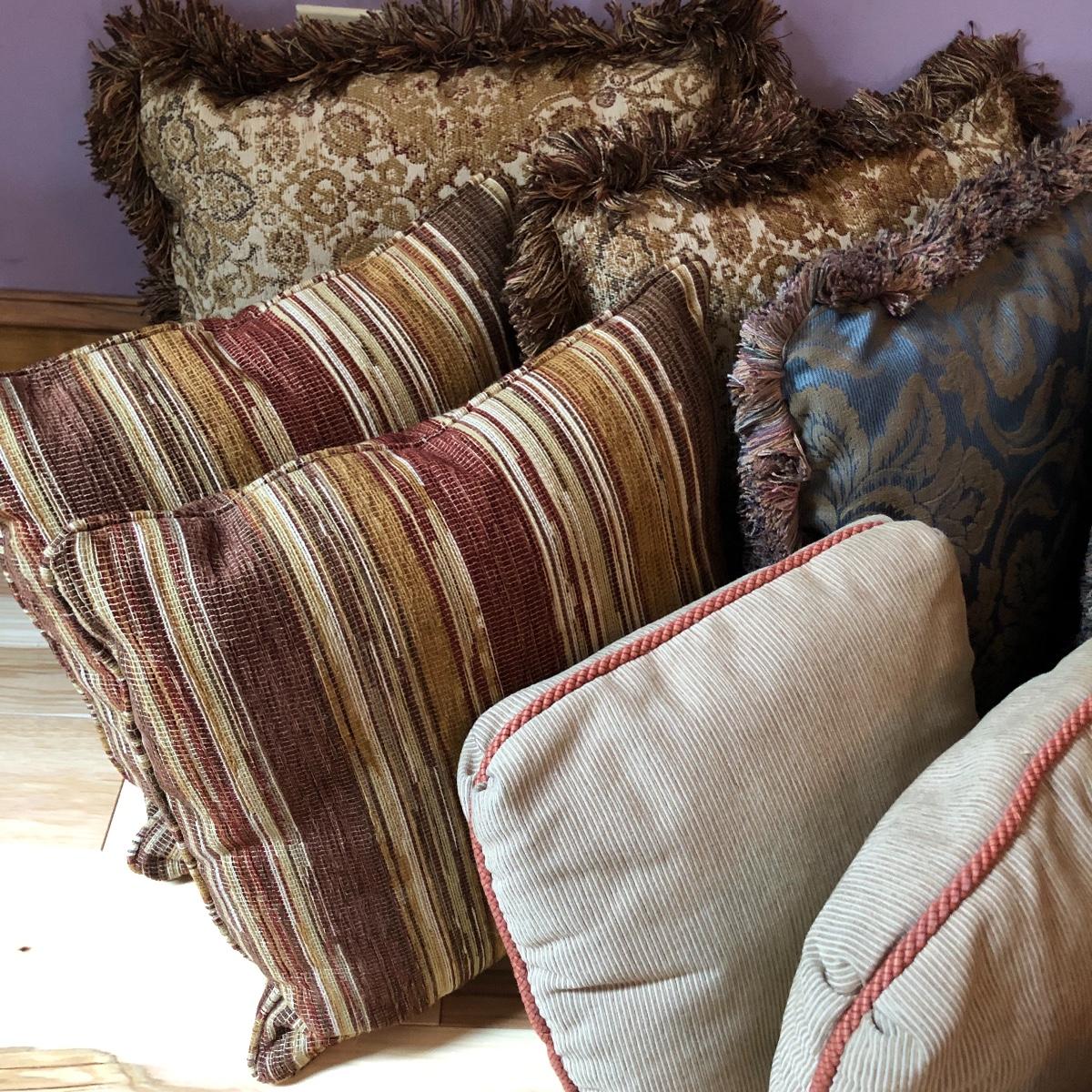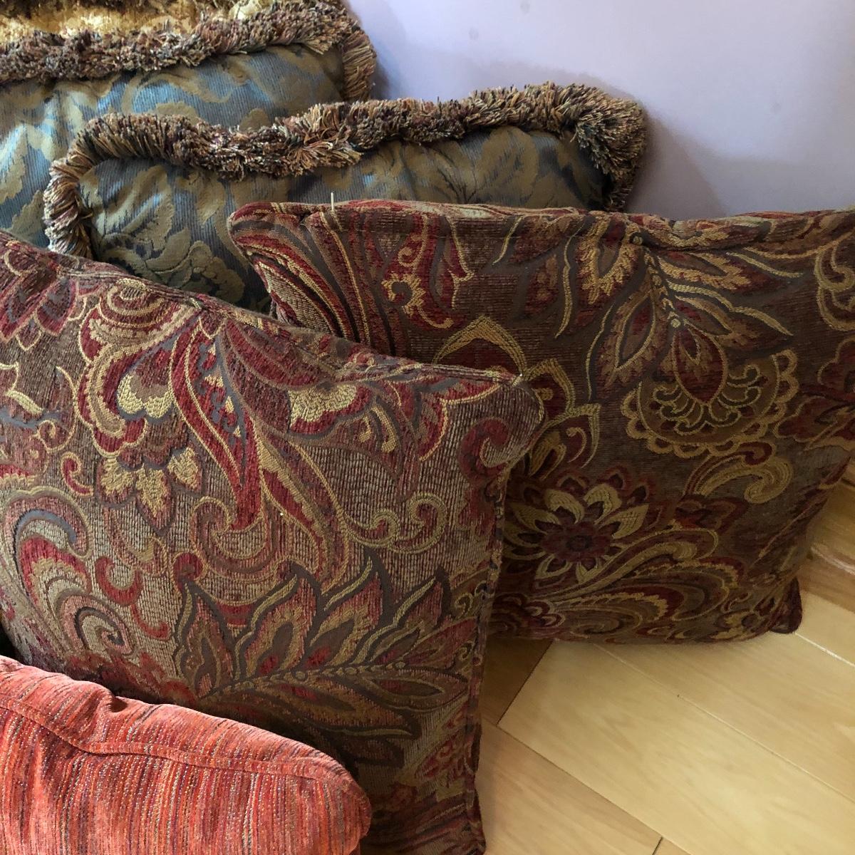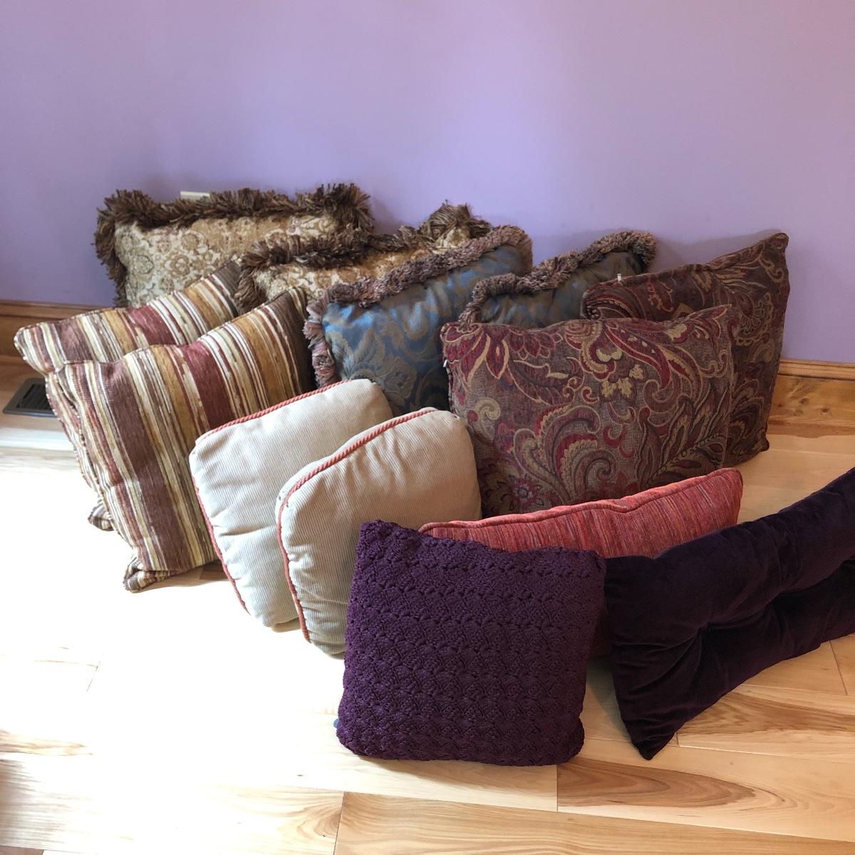 There are 5 pairs of matching pillows in this lot plus 4 individual ones. The green jacquard and tan paisley patterned pillows have fringes, all the rest do not. The purple pillow is crocheted. From smallest to largest in the last image they measure 6” and 19” respectively.