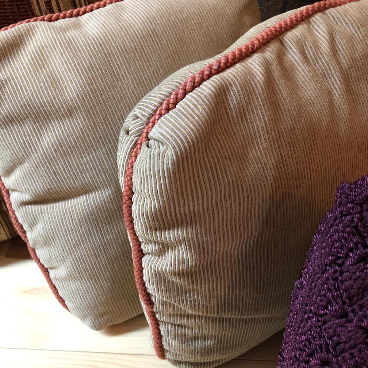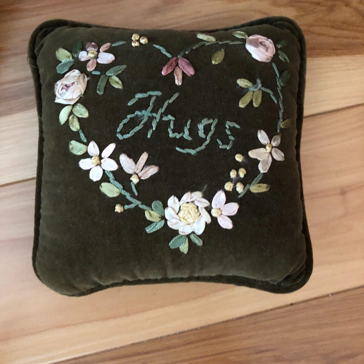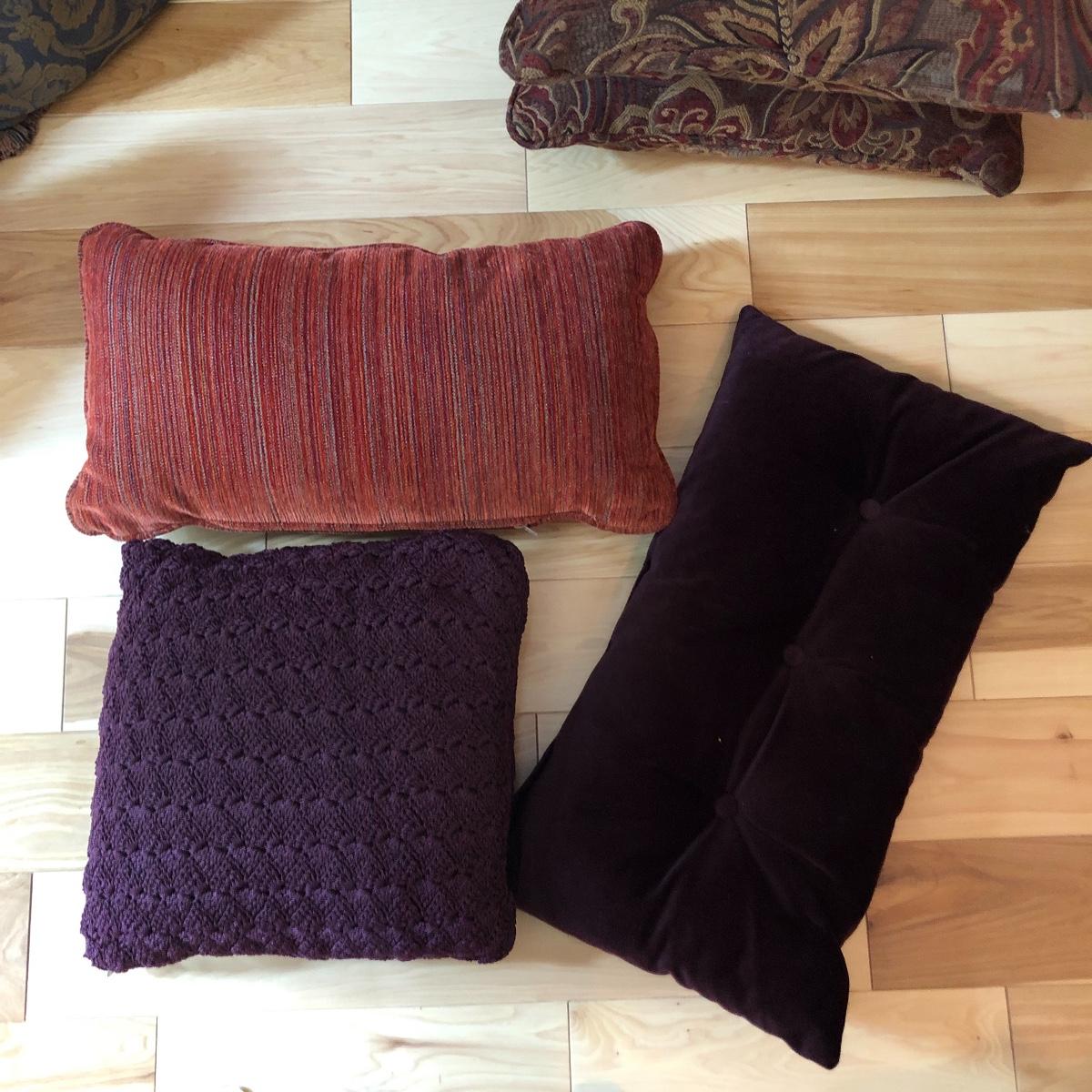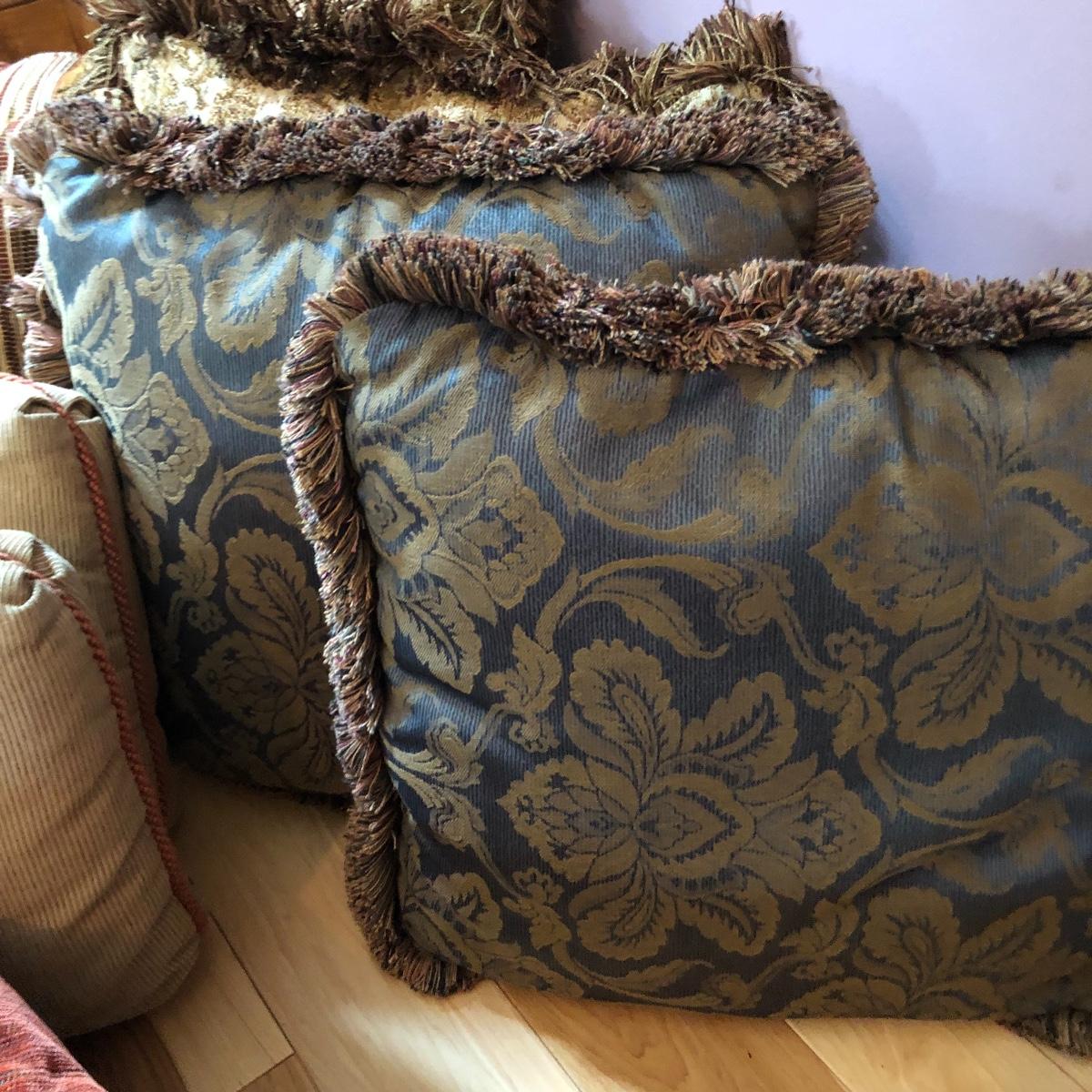 There are 5 pairs of matching pillows in this lot plus 4 individual ones. The green jacquard and tan paisley patterned pillows have fringes, all the rest do not. The purple pillow is crocheted. From smallest to largest in the last image they measure 6” and 19” respectively.