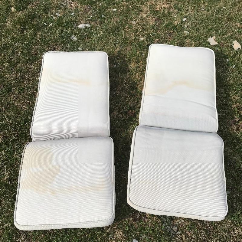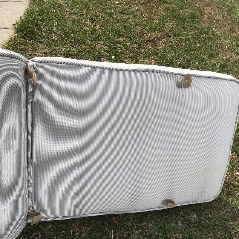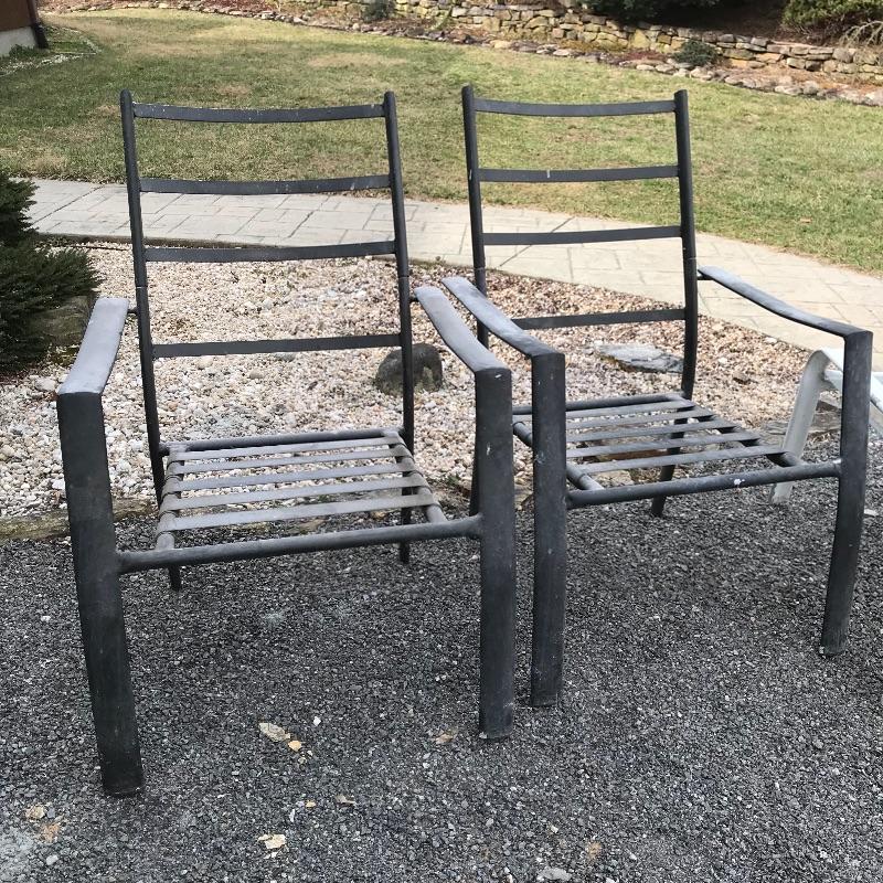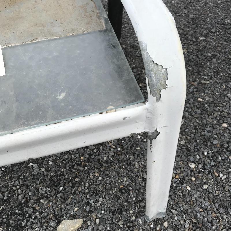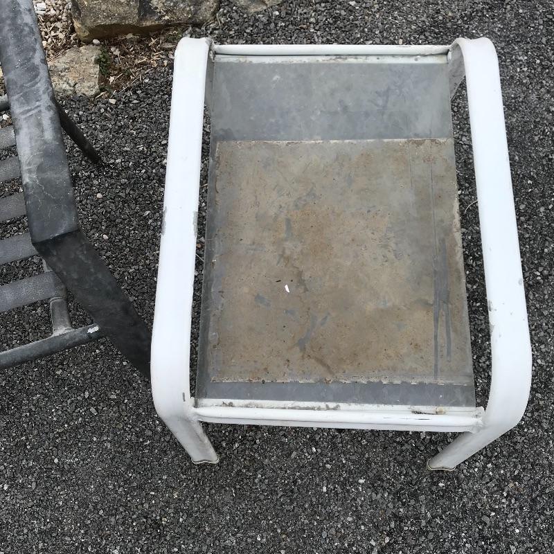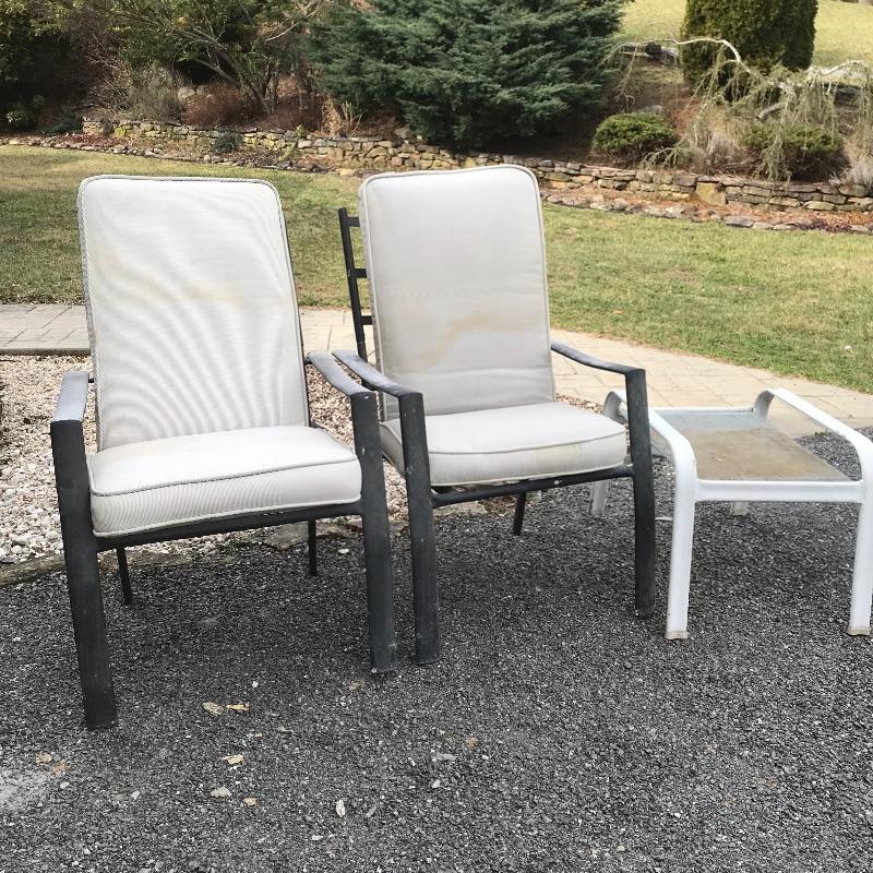 Two lightweight metal chairs with outdoor cushions measuring approximately 25.5” x 31” x 39”. A white painted metal frame with glass top accompanies chairs. Table measures approximately 21.25” x 25” x 18.5”. Table, chair frames and cushions all need some cleaning and polishing. No shipping.