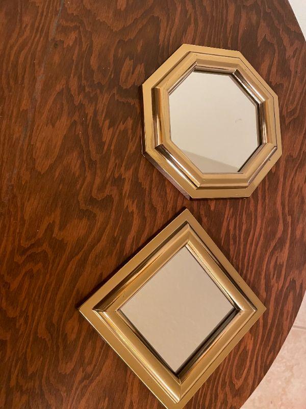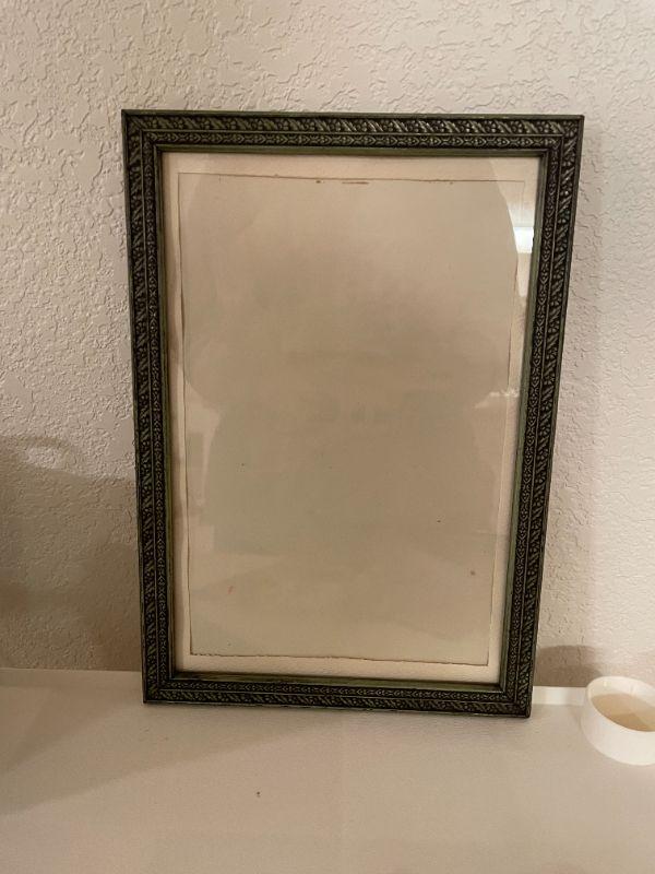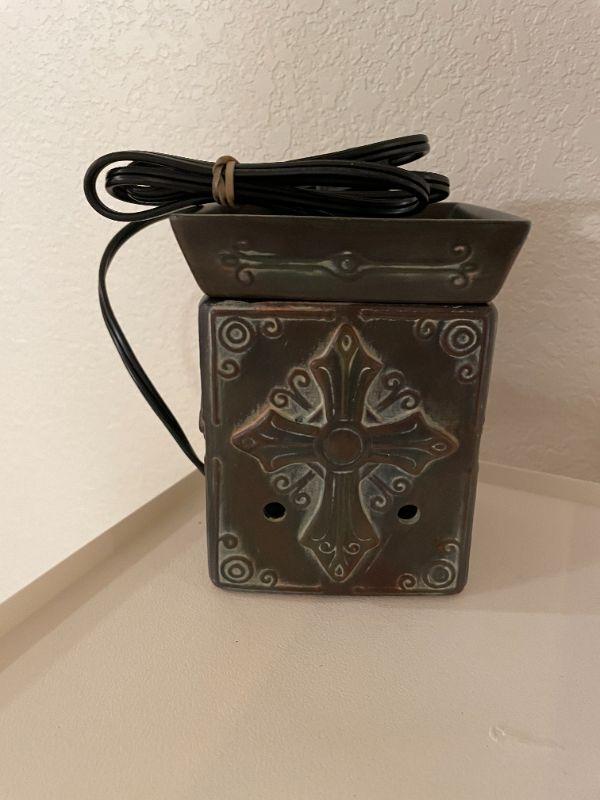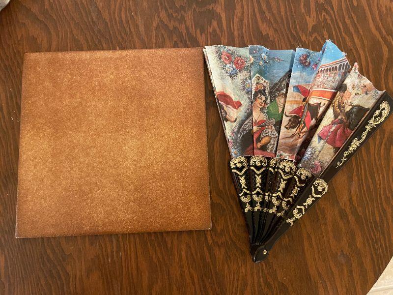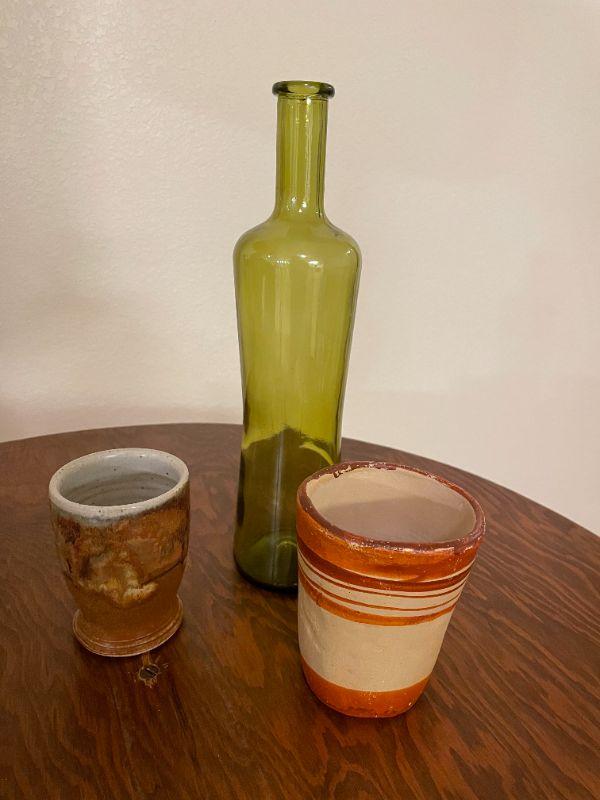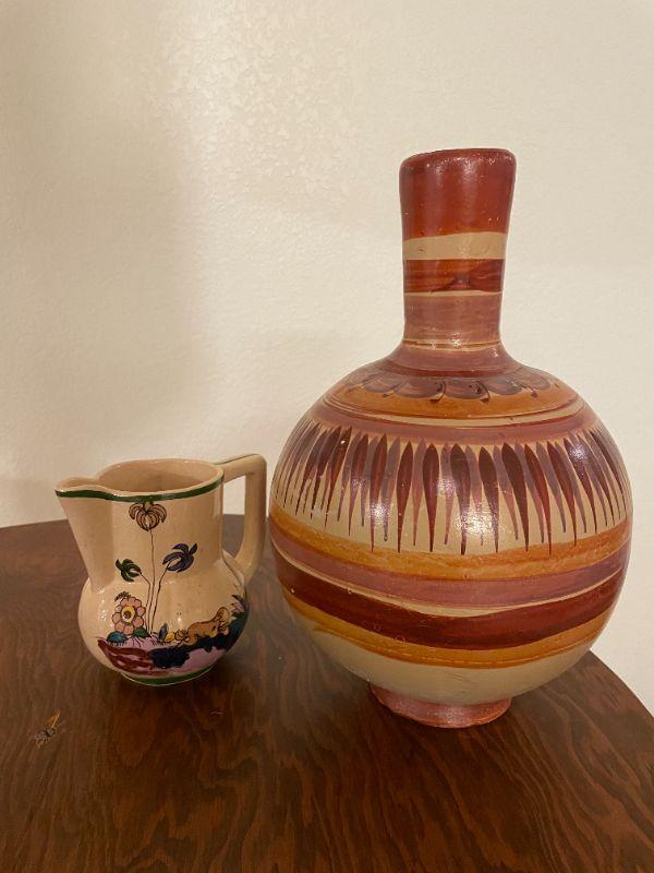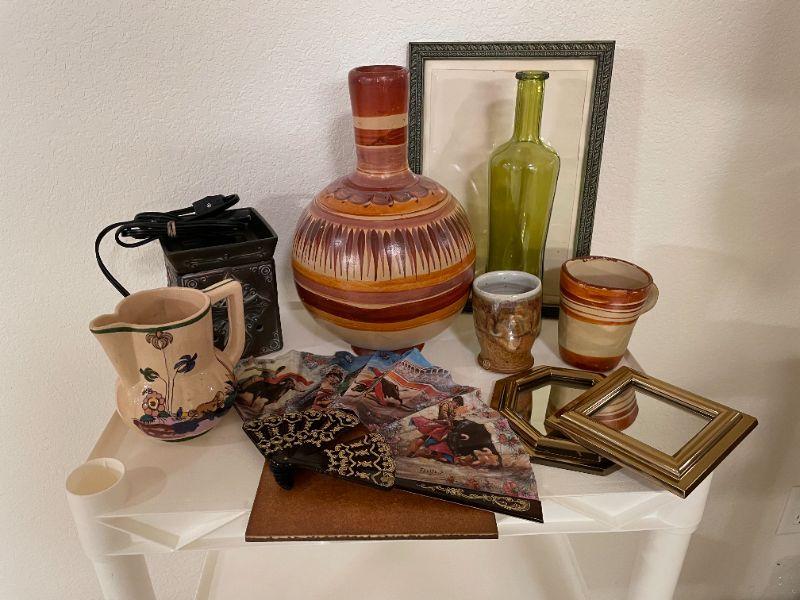 SCENSY BURNER, LARGE POTTERY VASE, SMALL POTTERY PITCHER, TWO POTTERY MUGS, SMALL DECORATIVE MIRRORS, A PICTURE FRAME, TILE HOT PLATE, BULL FIGHTERS ON A FAN (NEEDS REPAIRED), AND A GREEN GLASS BOTTLE.