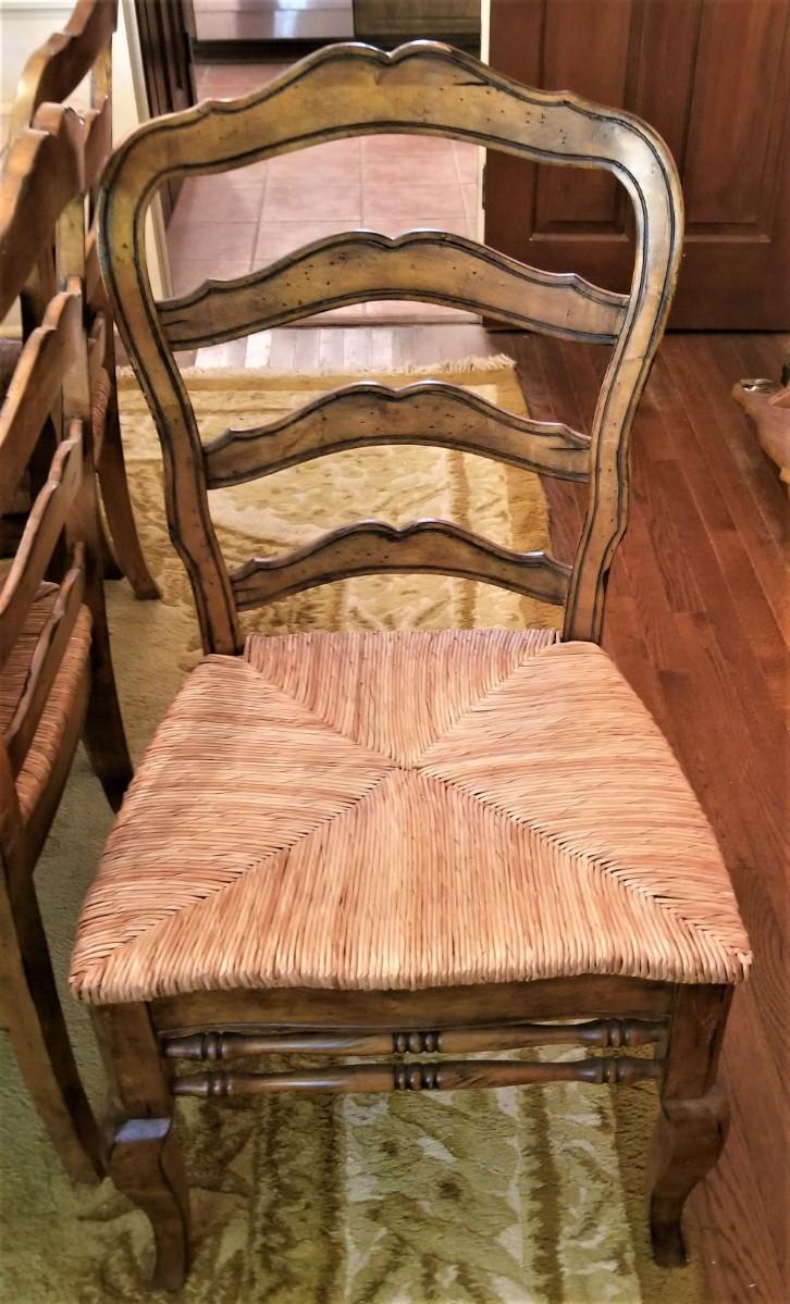 This great table has two leaves and 8 chairs (2 armchairs, 6 sidechairs). Chairs have rush bottoms - all are heavy and sturdy. Table is gently used and has a few small dings that come with normal use. With one leaf inserted, as shown, table is 86" long. The additional leaf is 18" across. Table is 44.5" across. Chairs are 23.75" across, 22" deep, and 40" tall. This is a very nice set that you will enjoy for years to come. Oak finish. Solid wood - heavy.