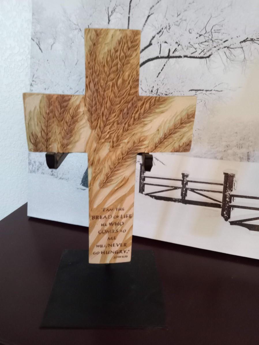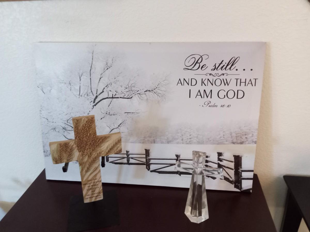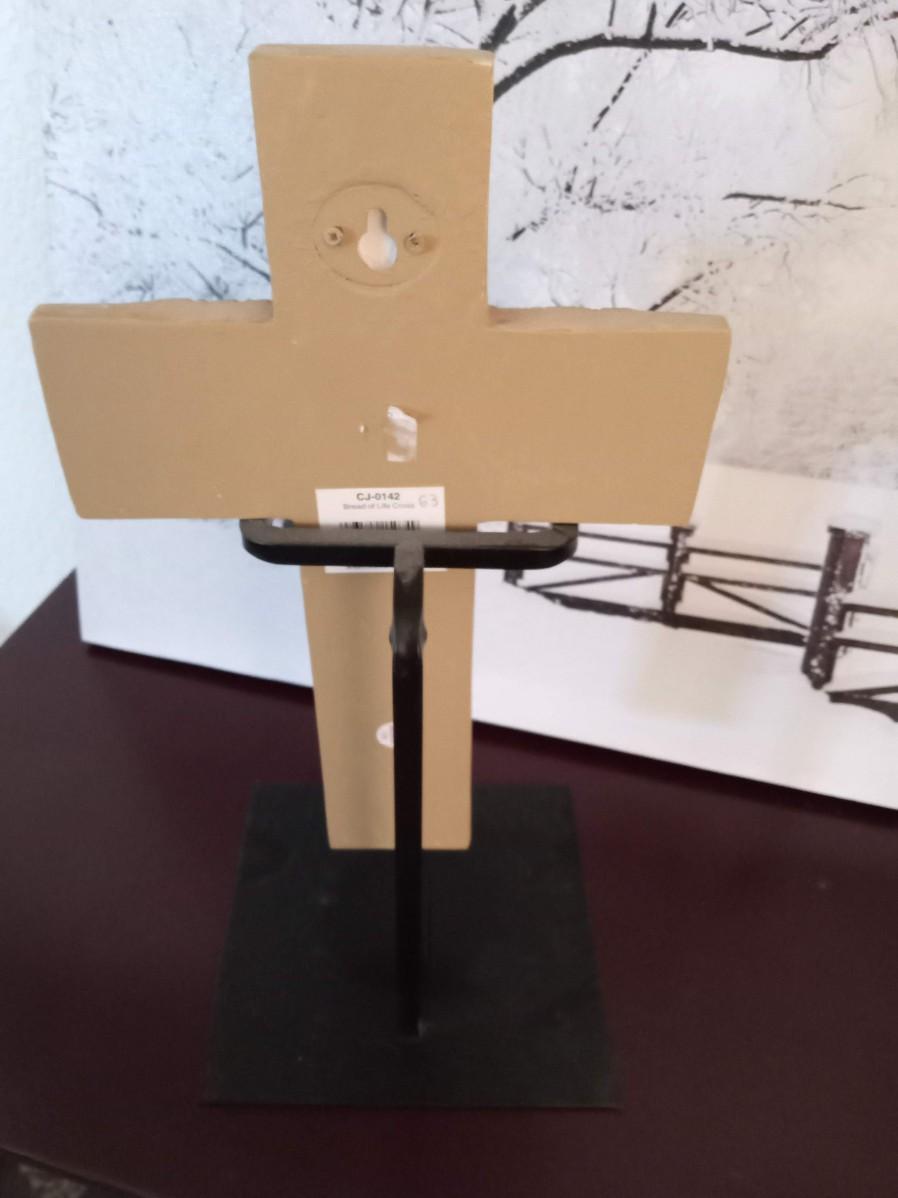 FINE BOHEMIAN CRYSTAL CROSS, PSALM 46 : 10 ON CANVAS WALL HANGING 24" X 16", JOHN 6:35 ON A CROSS HANGING ON AN IRON STAND