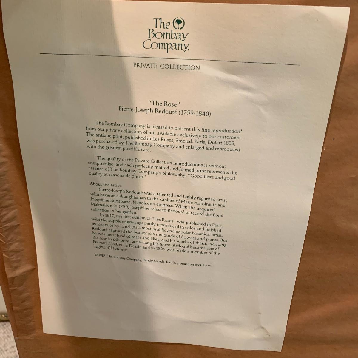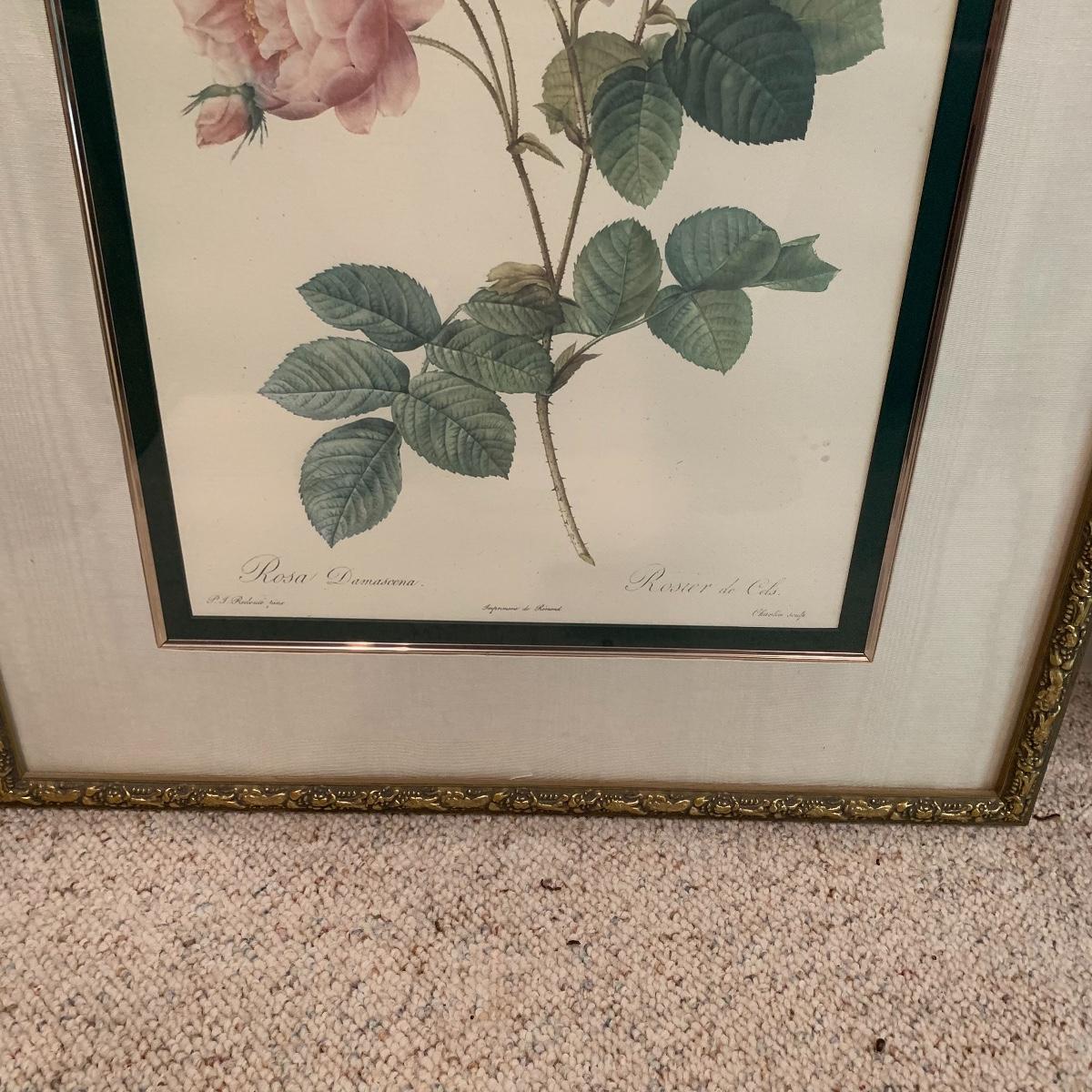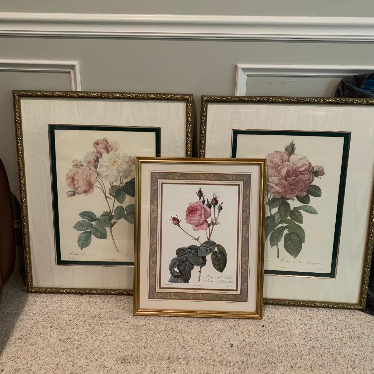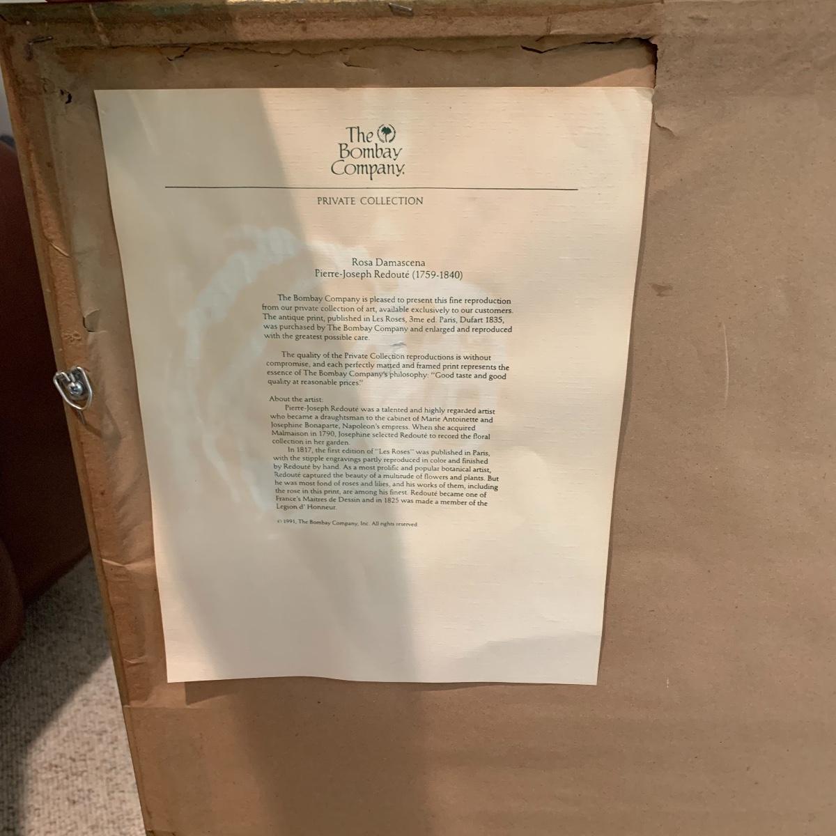 Don’t pass up this beautiful rose art originally created by Pierre-Joseph Redoute’. These prints are professionally framed and matted, and are in great condition. The two larger prints are 28” X 23” and the smaller one is 21” X 17”.