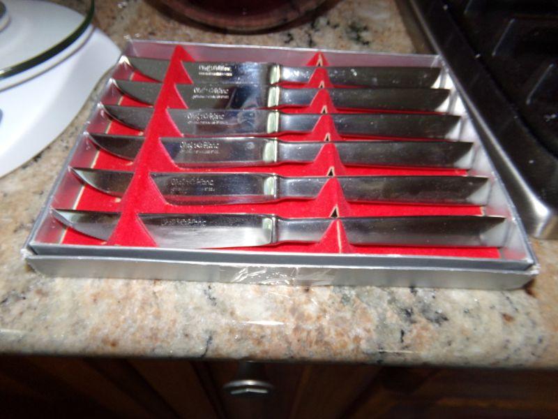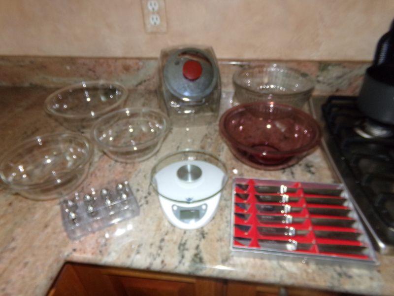 5 SERVING BOWLS, GLASS COOKIE OR CANDY JAR, CHEF JP LEBLANC STEAK KNIVES AND MORE