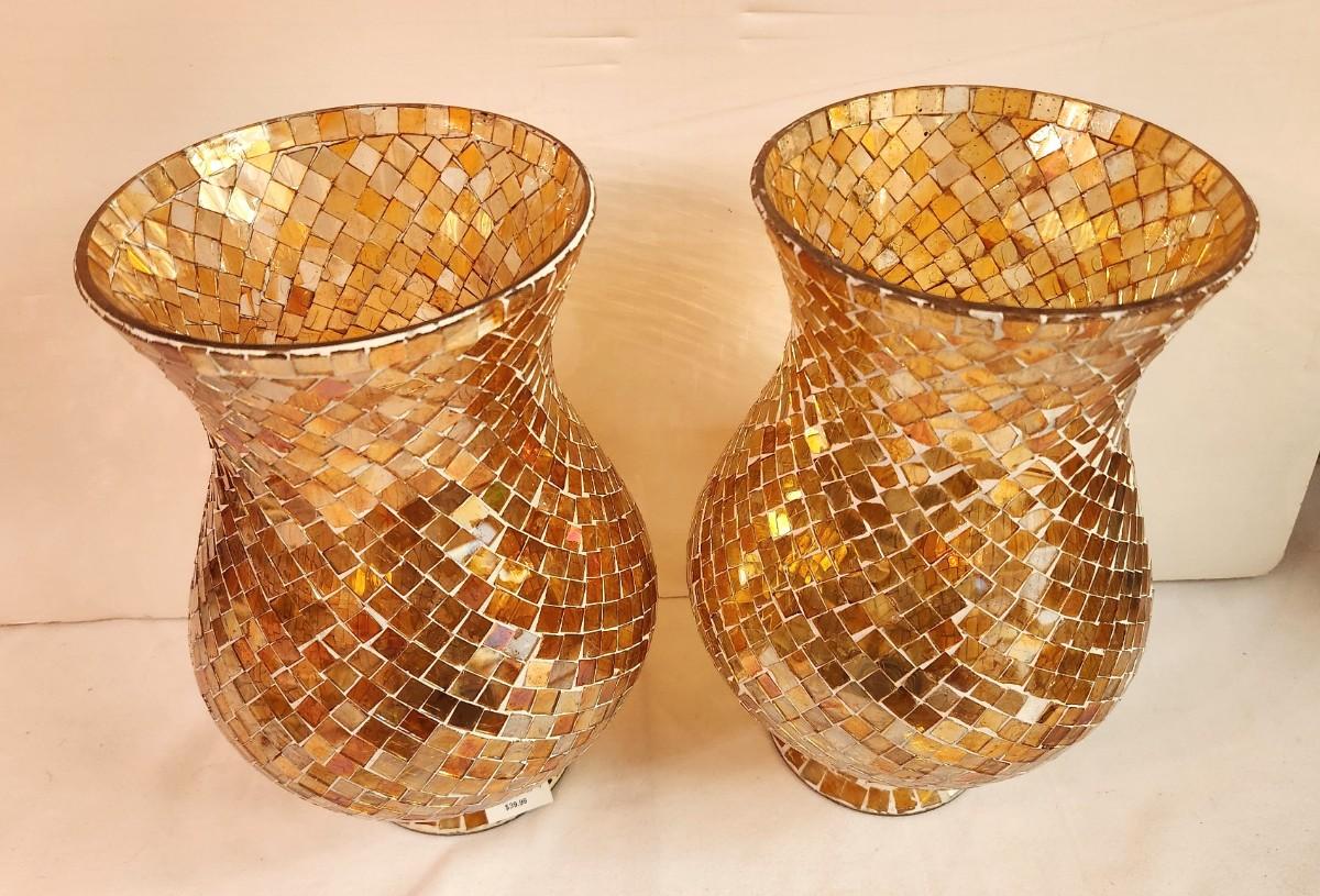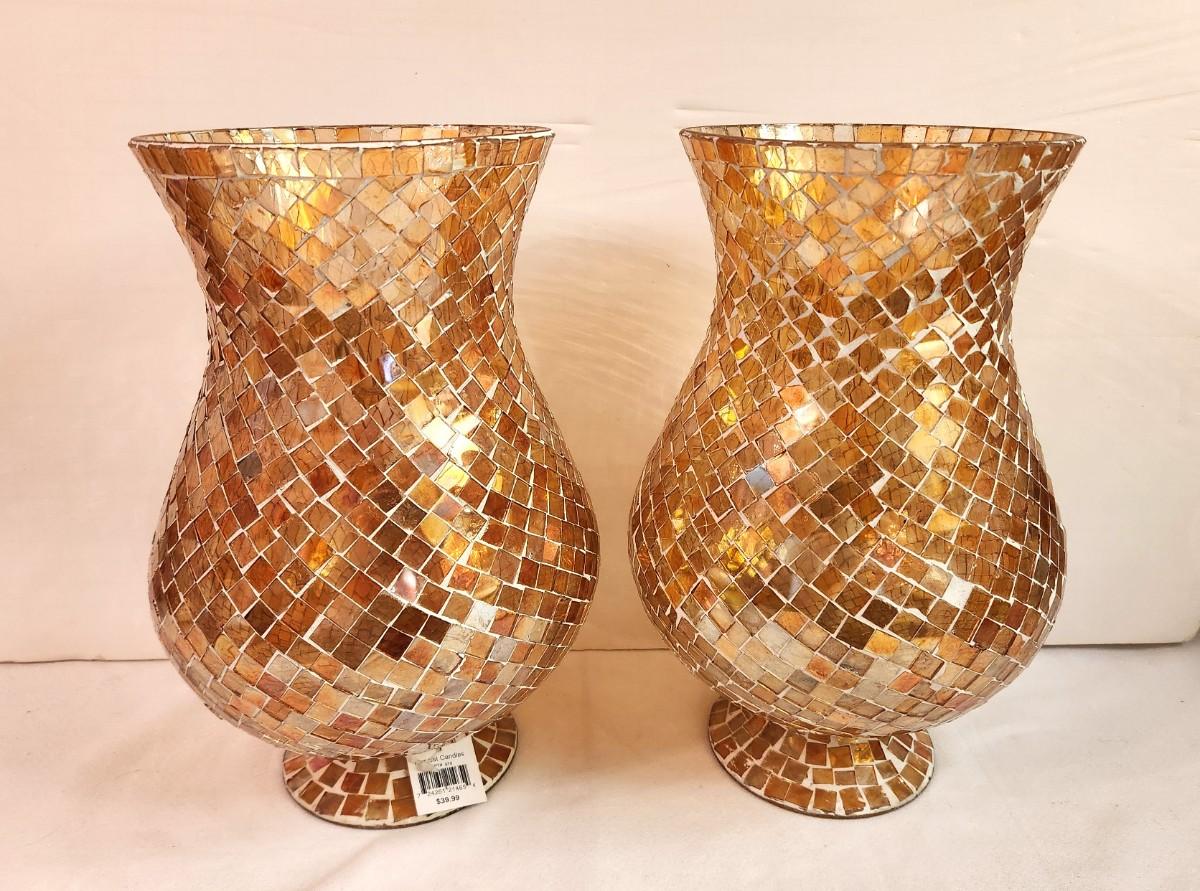 Set of 2 contemporary decorative glass candleholders - harvest gold colors. Each is 12" tall - original retail (has tag) 39.99 each.