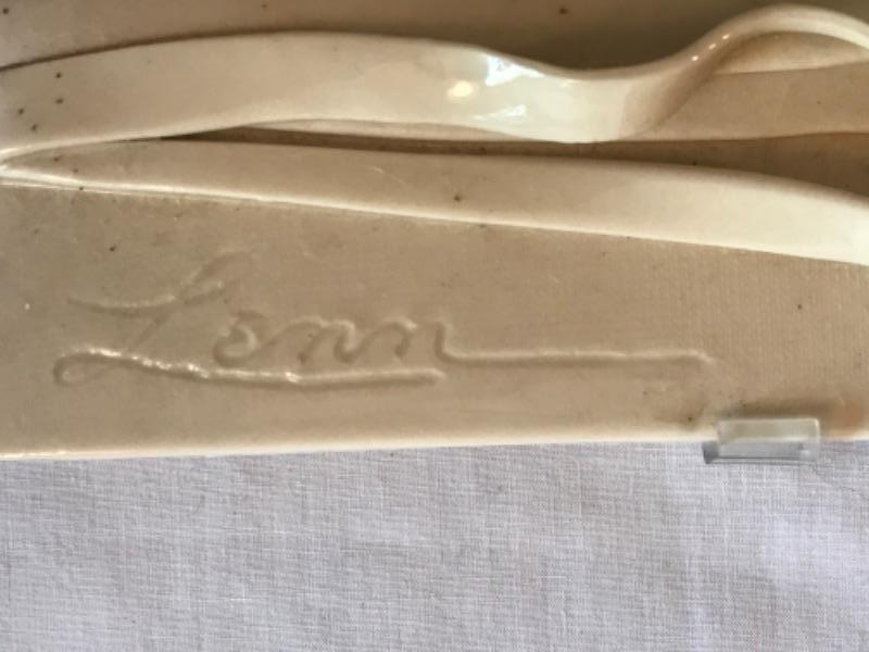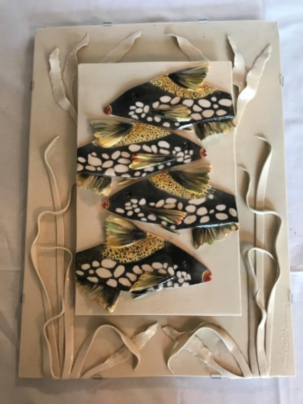 Pottery fish wall art signed Lenn and measures 19-1/2”x14”.