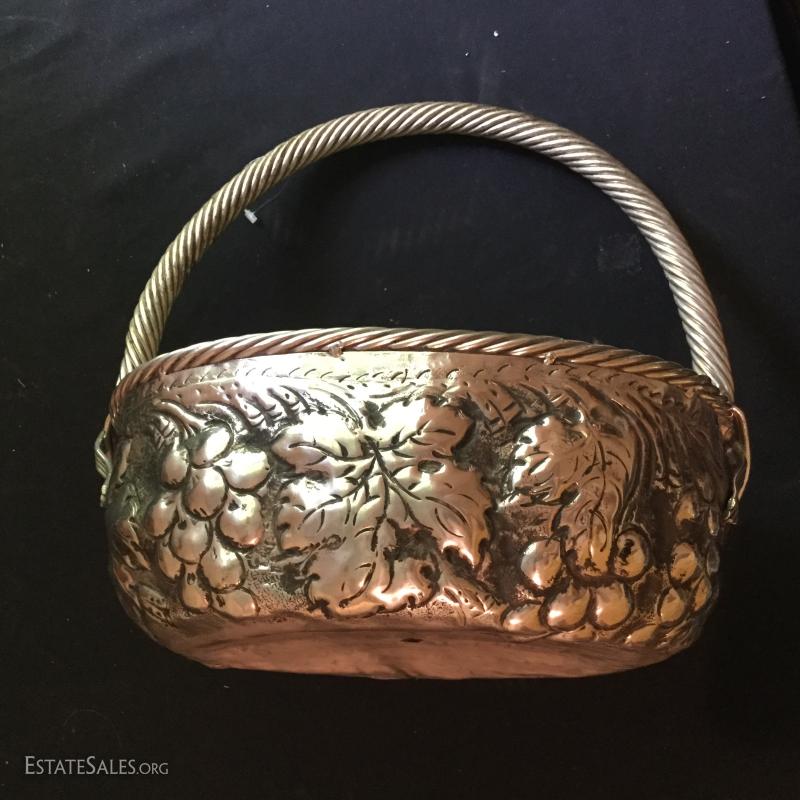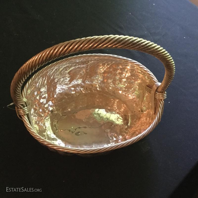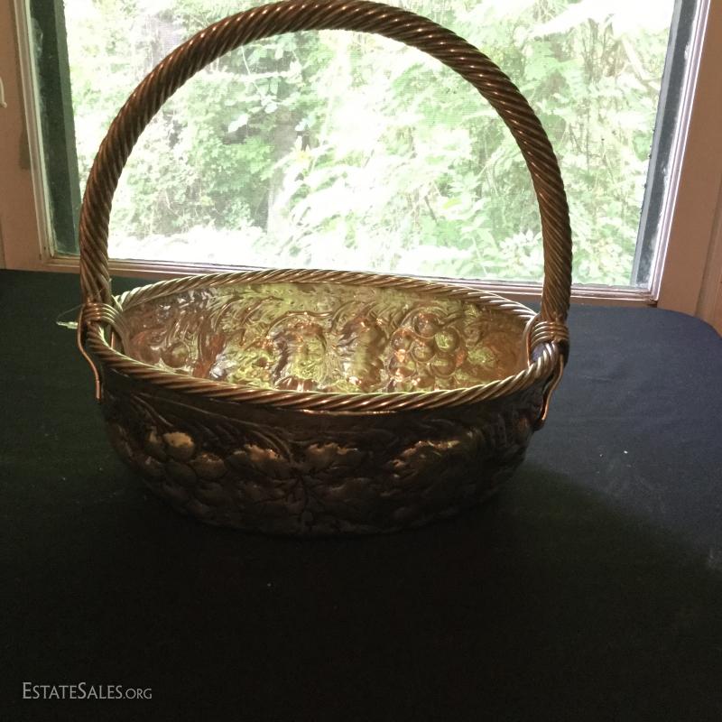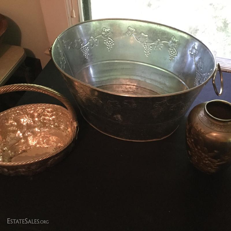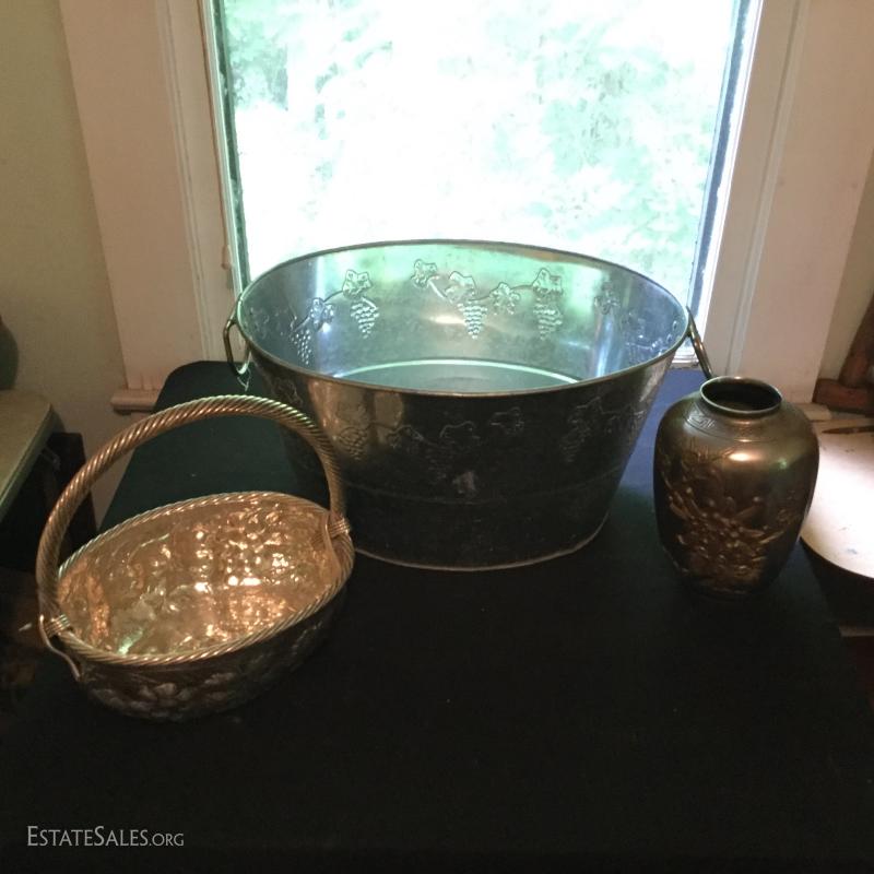 Silver-plated wine bucket, silver-plated basket, beautiful mixed metal vase and a Hellenic Homan Plate Nickel silver bread bowl. Vase measures 10.5"h. Total of 4 pieces. Lot available for local pick up in Saluda, NC