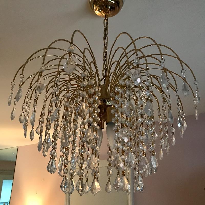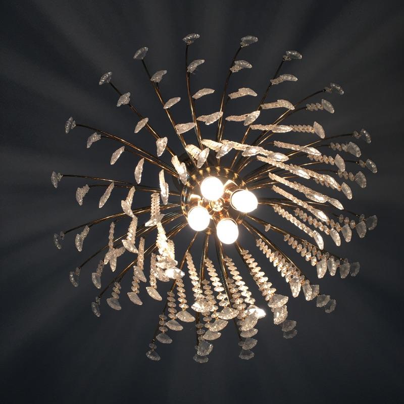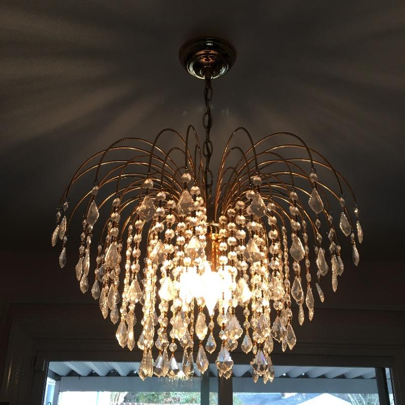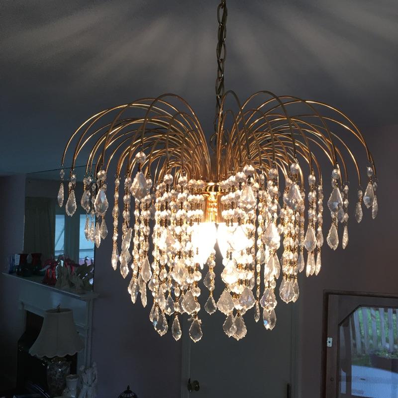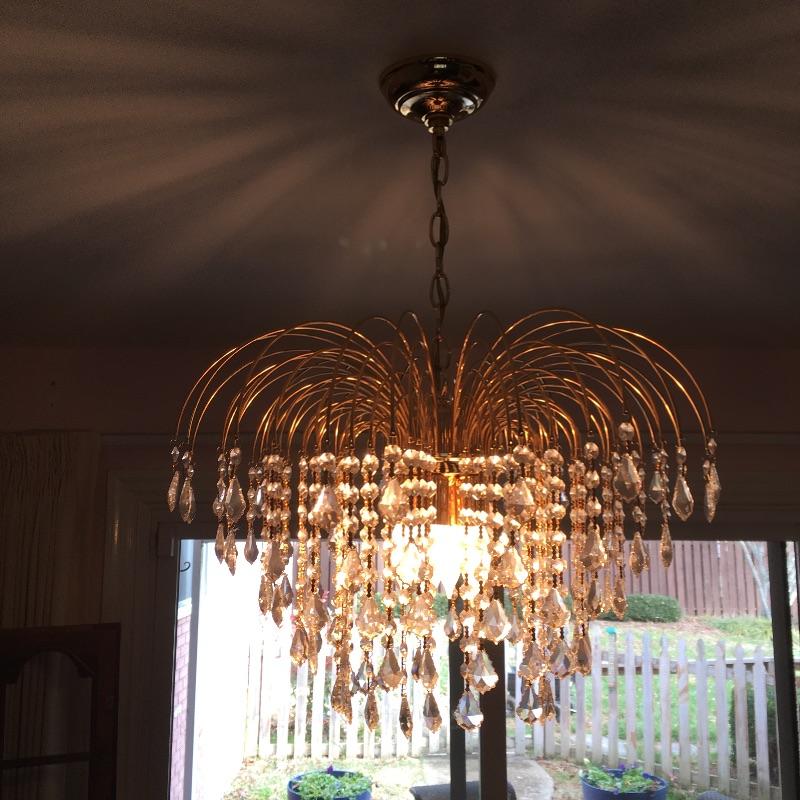Swarovski ceiling fixture. Get yourself some bling with this this sparkly ceiling fixture. Ceiling fixture measures 21”D and hangs 25.5” from ceiling. Light fixture is still up and will be the responsibility of the buyer to take down and end wires at house.