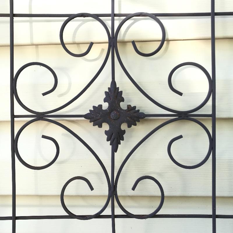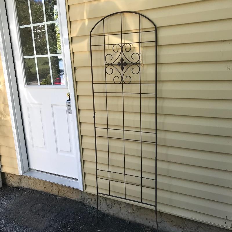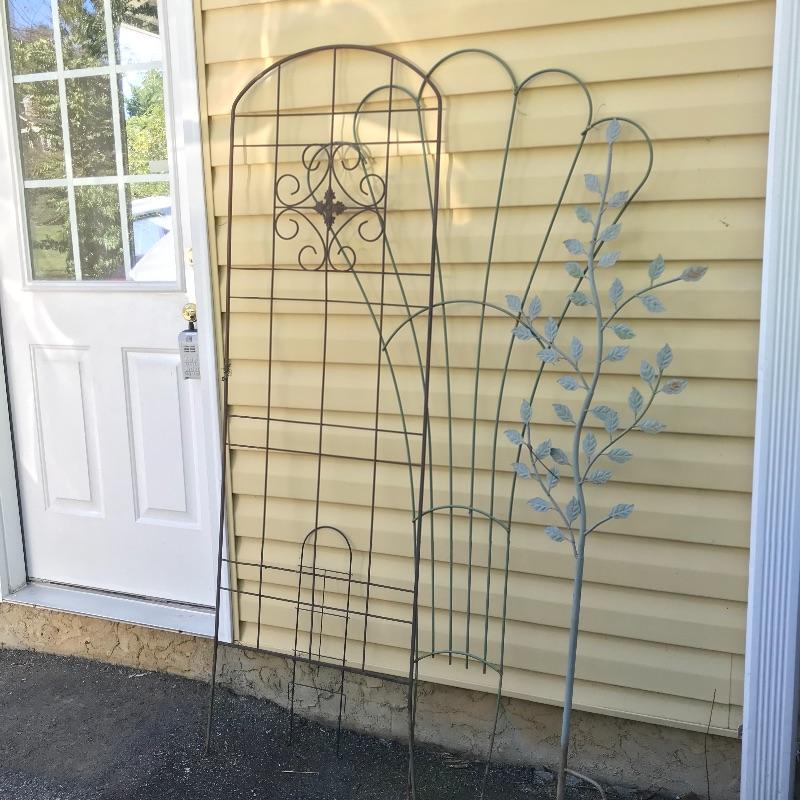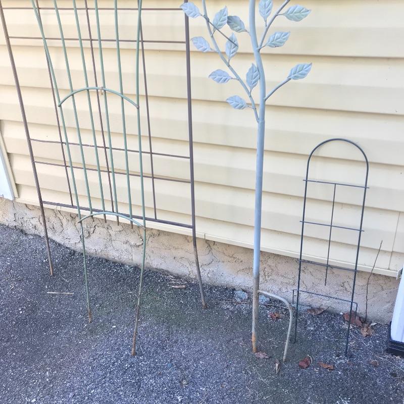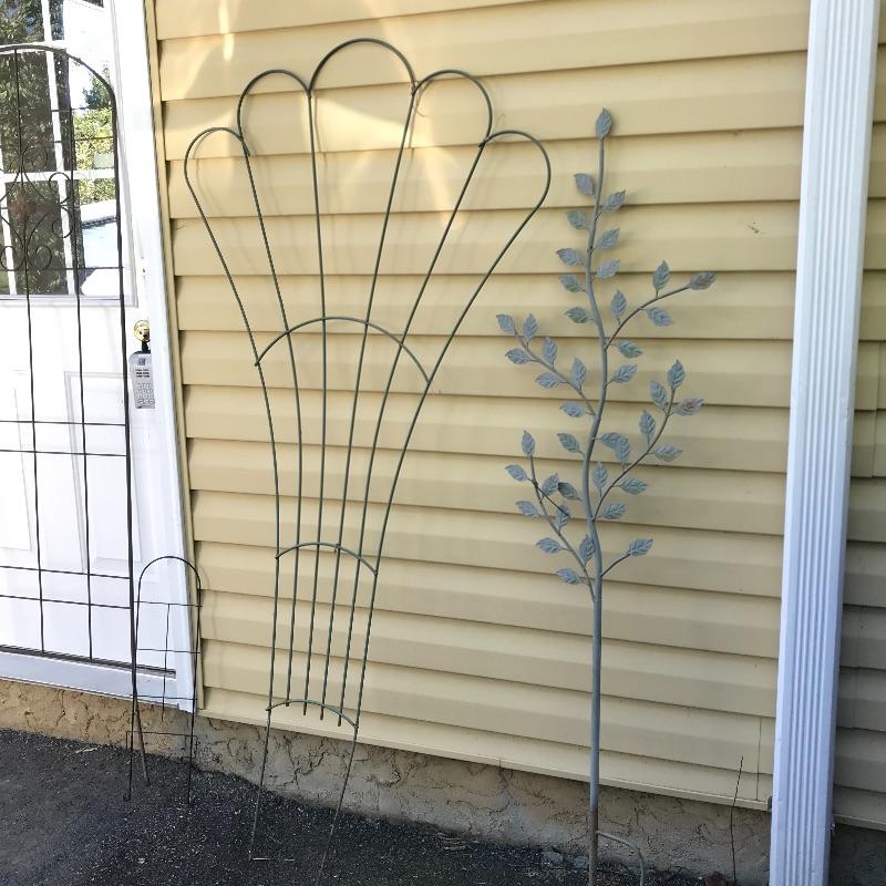 Three large metal trellises with one small 2’ trellis in the mix. Two door shaped trellises looked perfect side by side or separately. A lovely gray-mint green tree and a large fanning trellis too! The two brown trellises are approximately 6’ tall. See photos. No shipping.