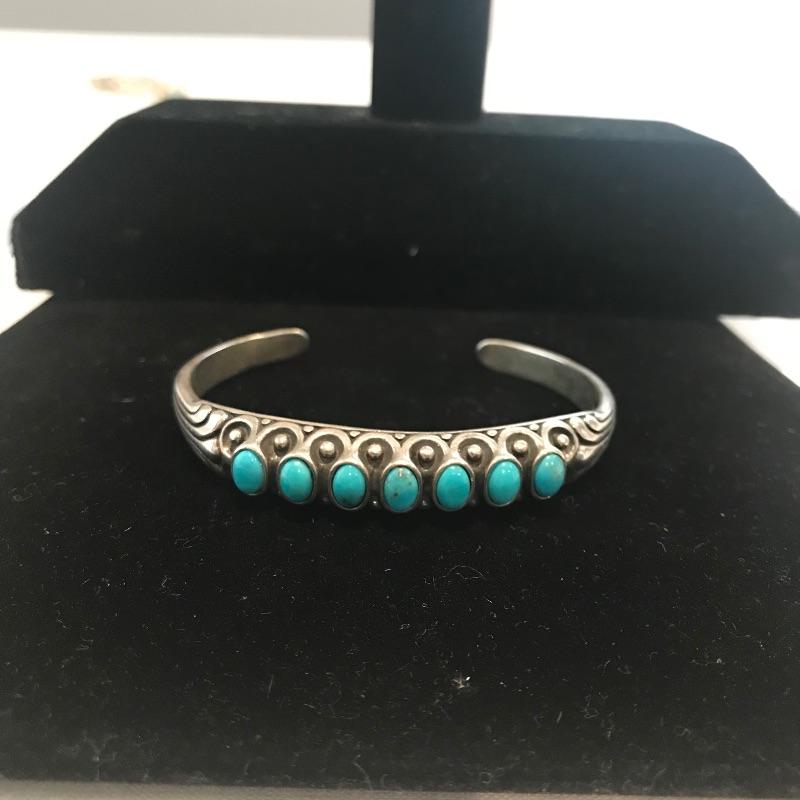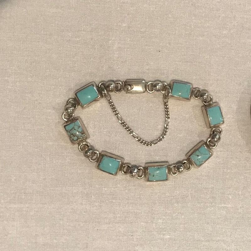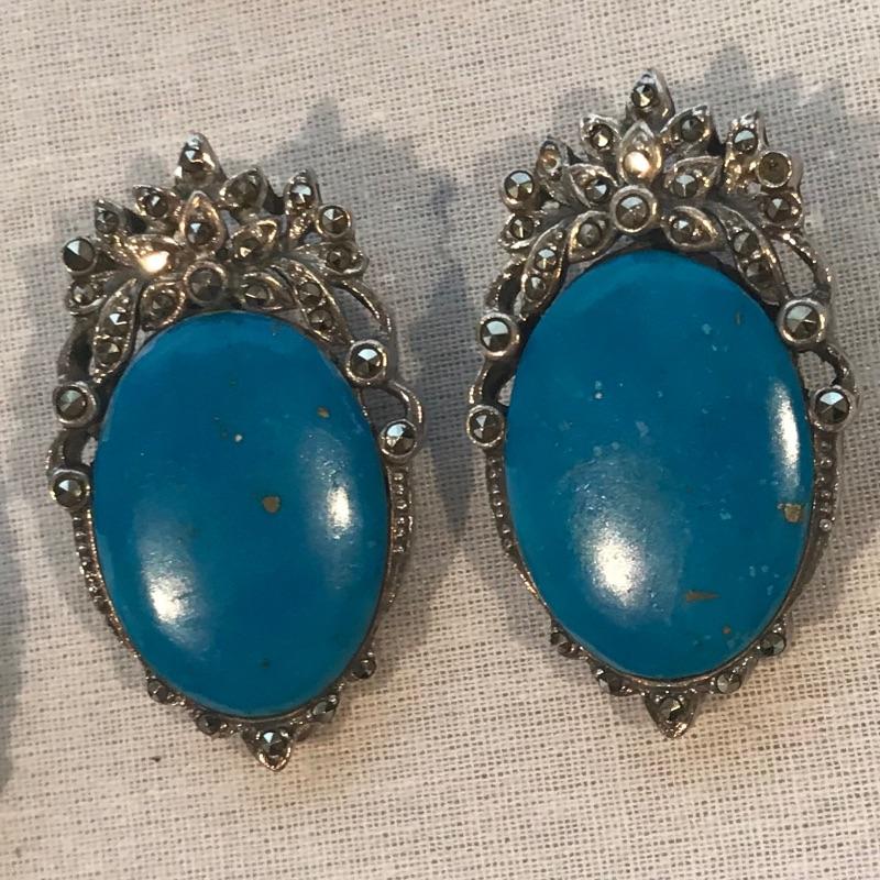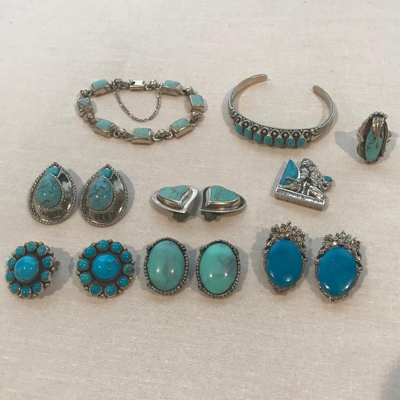 A stone to match many an outfit and your mood here with this beautiful stone jewelry assortment that are likely to include turquoise and larimar and mostly marked 925 or Sterling. Two lovely bracelets, one of which is a cuff and one with a safety chain and clasp. Five pairs of clip-on earrings, three are definitely marked 925, one is unmarked and the final pair has a marking that is very muddled, but likely 925. Also included in collection is a ring sized 7.5 and a pendant, both pieces are marked. See photos. Shipping available.