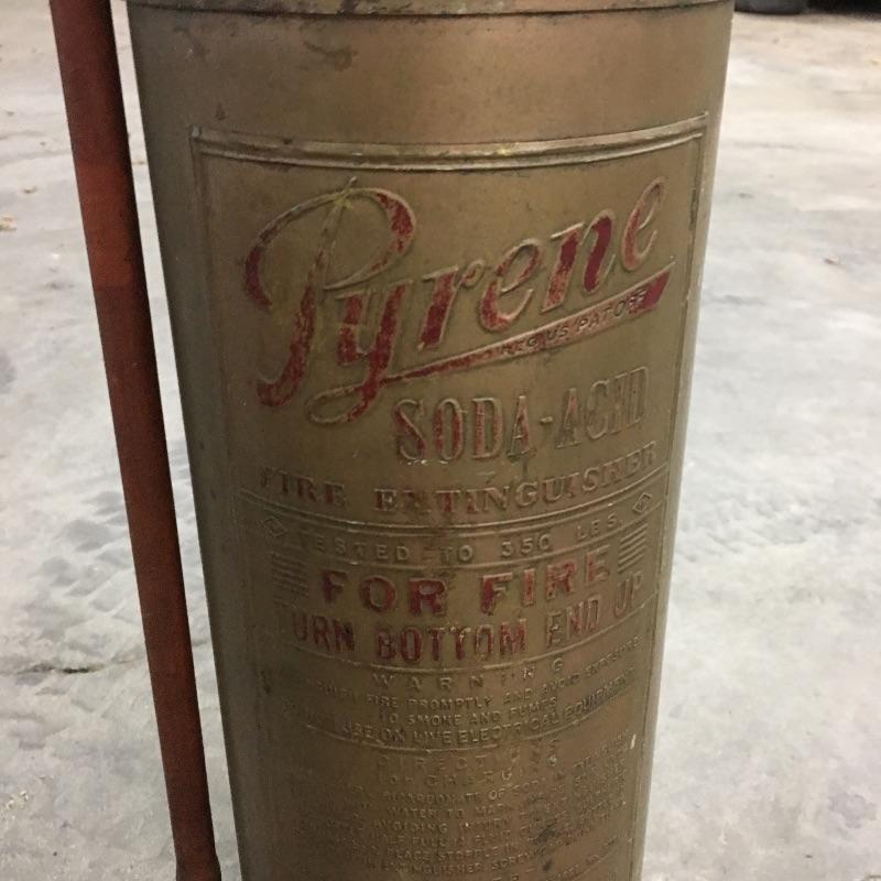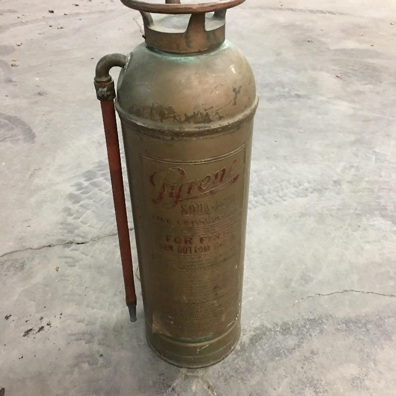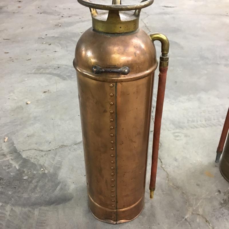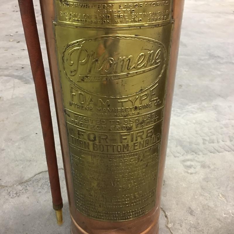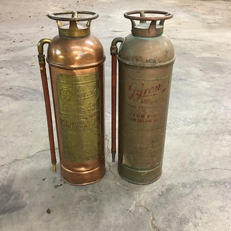 Pair of copper fire extinguishers. Phomene extinguisher is polished and Pyrene extinguisher is unpolished. A great pair to decorate any room in the house. Extinguishers measure 7”D x 24” tall.