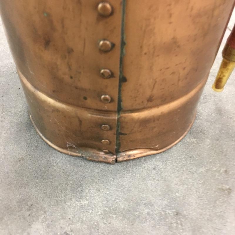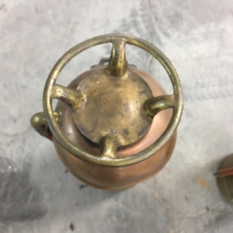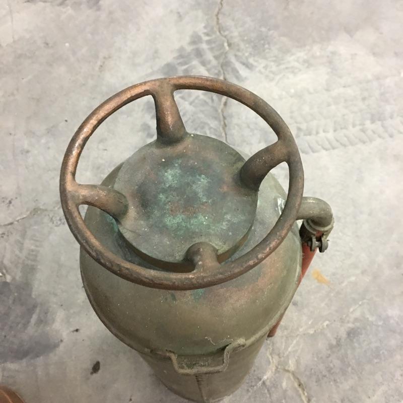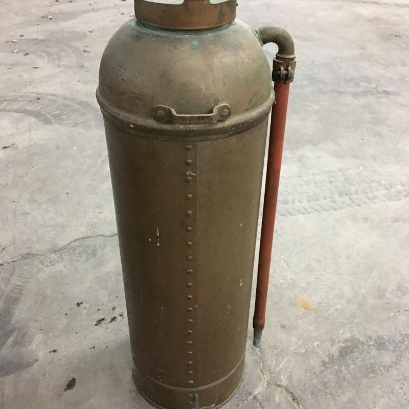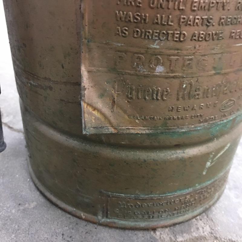 Pair of copper fire extinguishers. Phomene extinguisher is polished and Pyrene extinguisher is unpolished. A great pair to decorate any room in the house. Extinguishers measure 7”D x 24” tall.