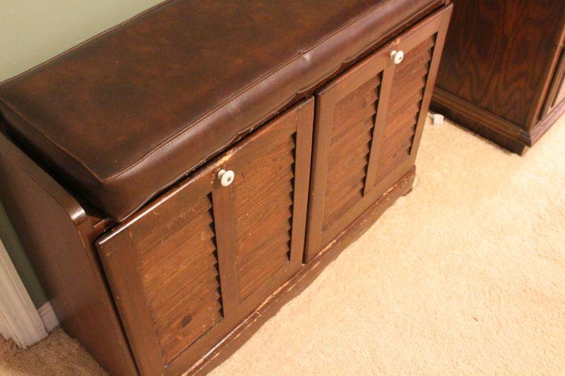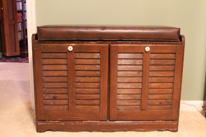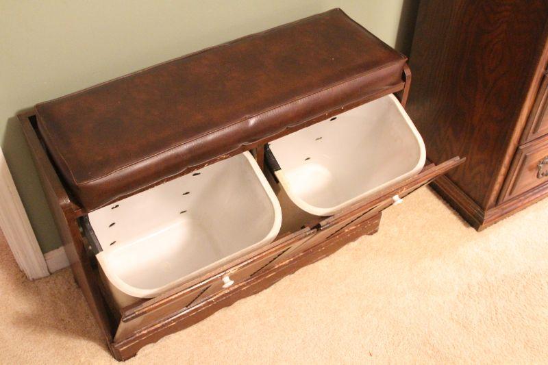 25" h x 35" w x 13" d vintage double hamper with shutter louvers design front. Ceramic knobs with brass screws. Vinyl cushion top. Plastic laundry bins pull out. bins are lightly soiled and show use. some scratching of finish along bottom edges. Vinyl intact. Particle board back.