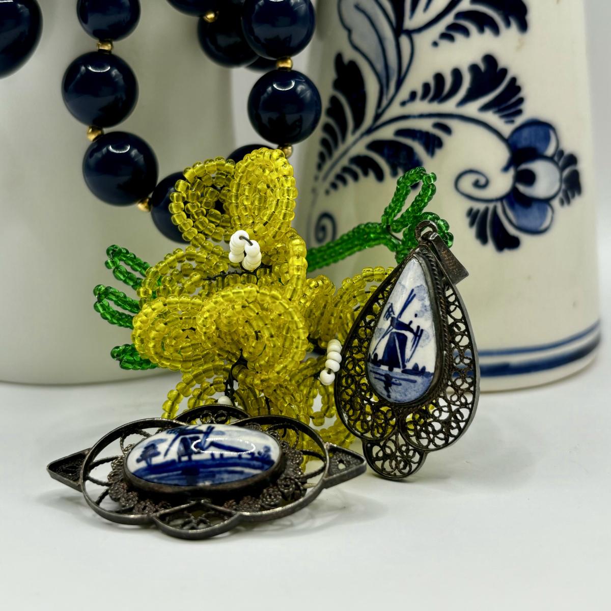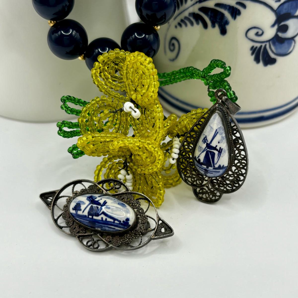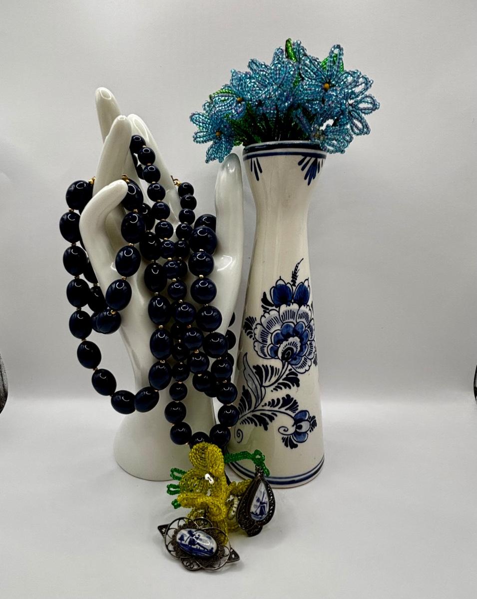LOT 300: Vintage Delft Brooch, Pendant & Vase, Blue Beaded Necklaces (18" & 24") along with Handcrafted Beaded Flowers