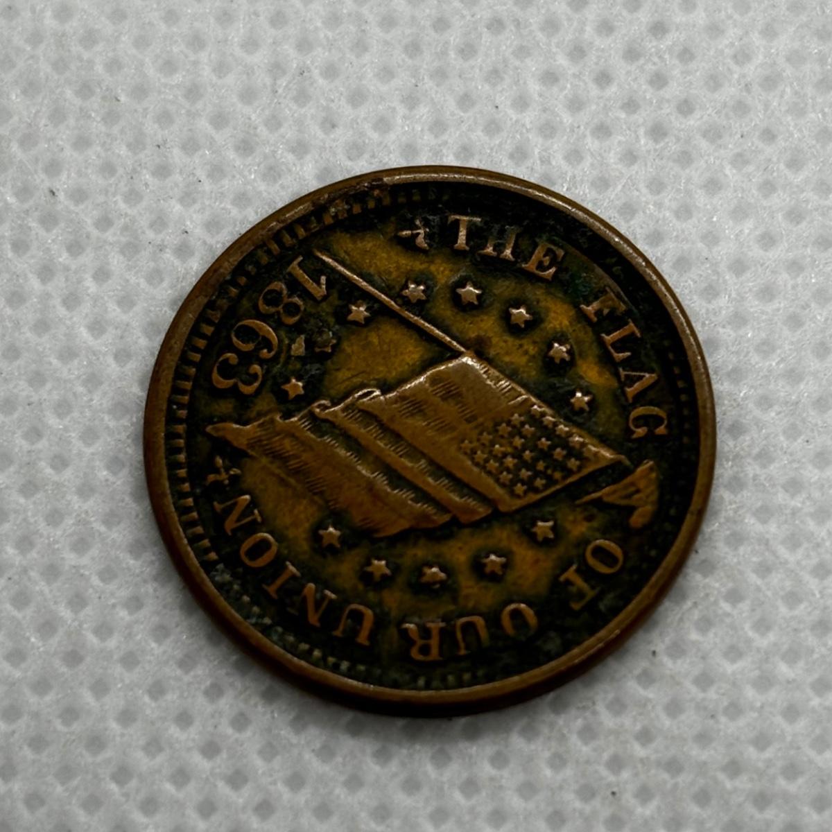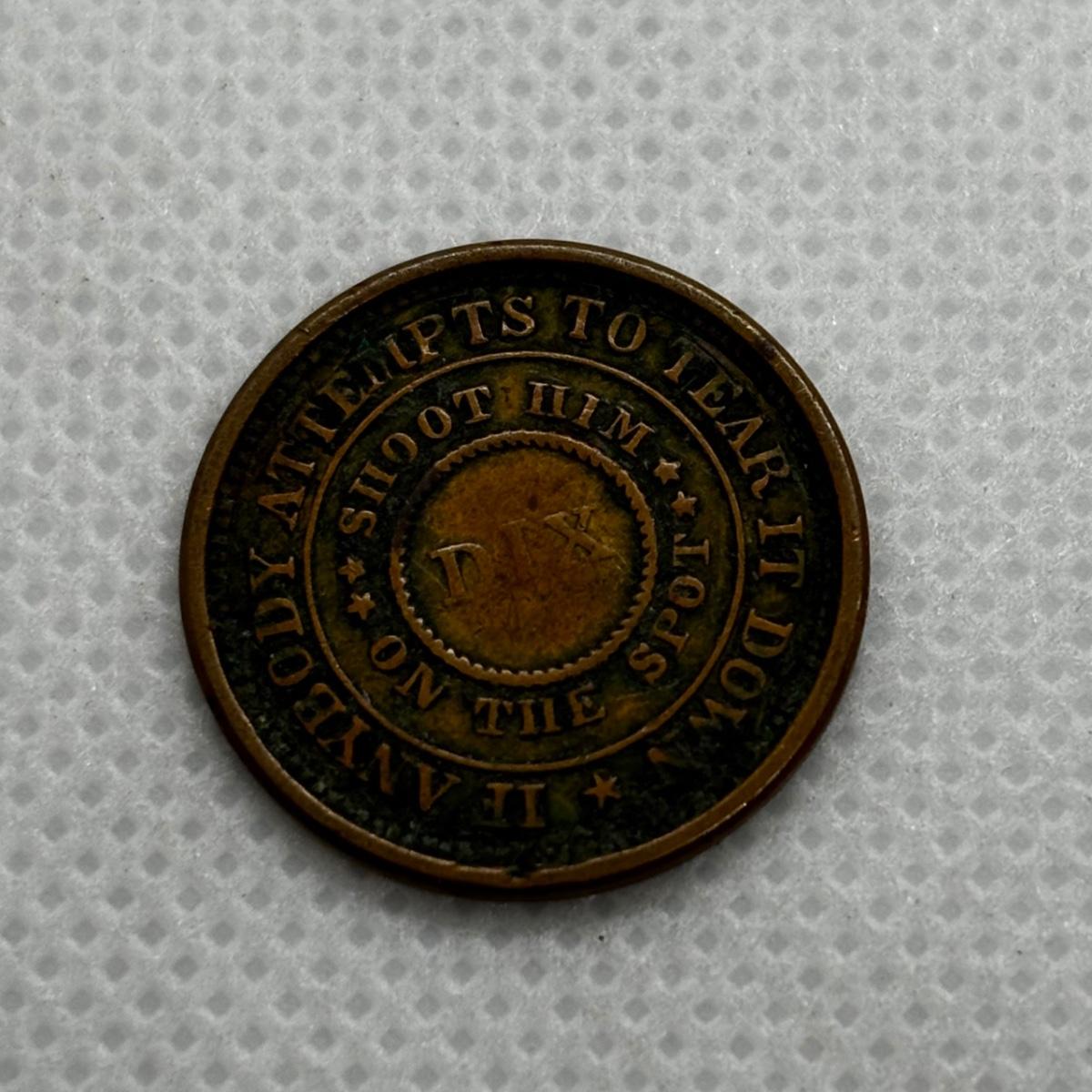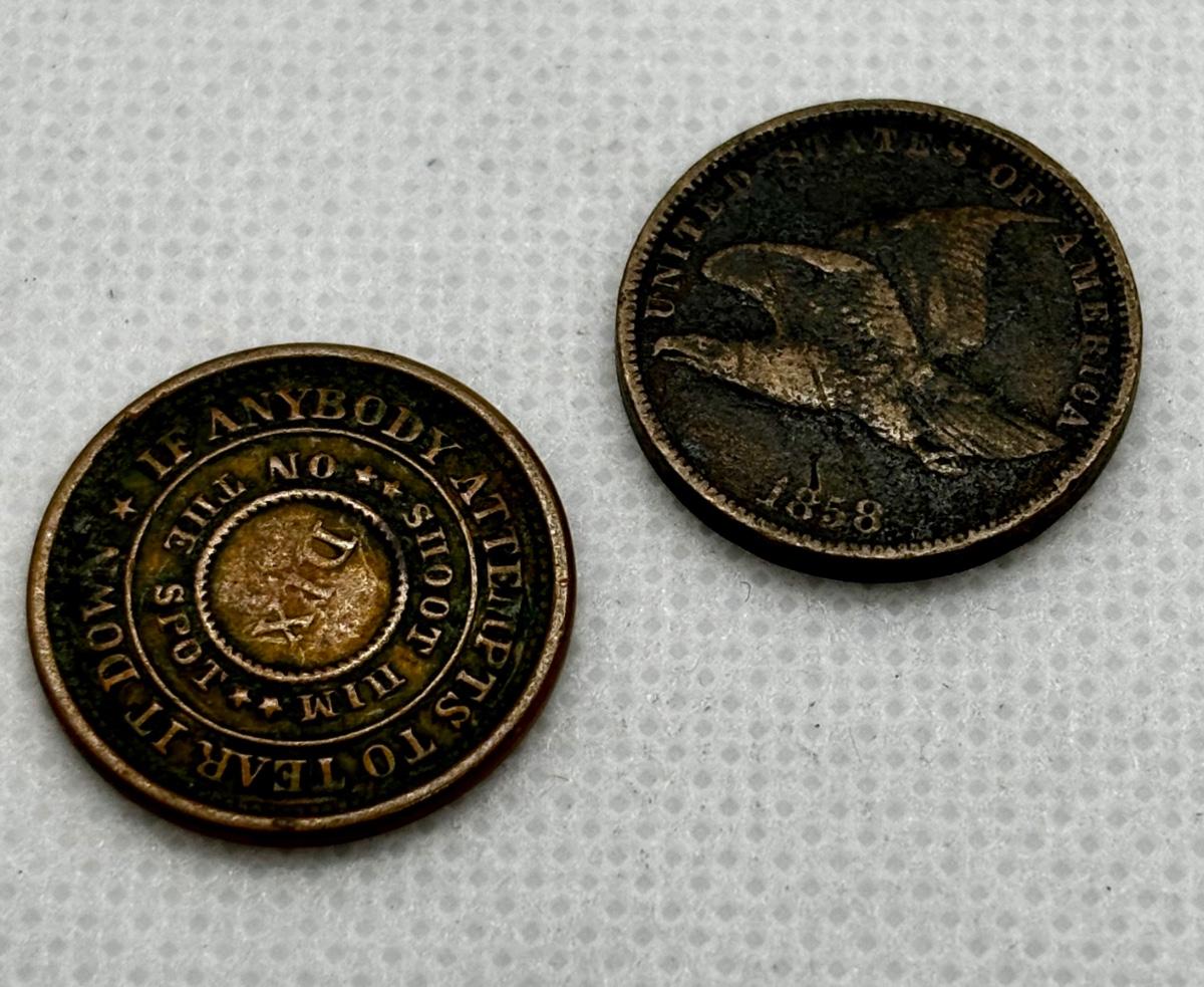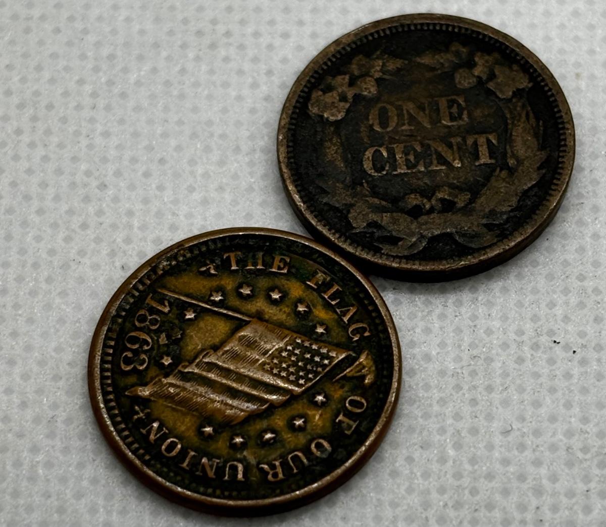 LOT 319: Civil War Token - The Flag of Our Union - DIX Shoot Him on the Spot 1863, Flying Eagle Large One Cent 1858