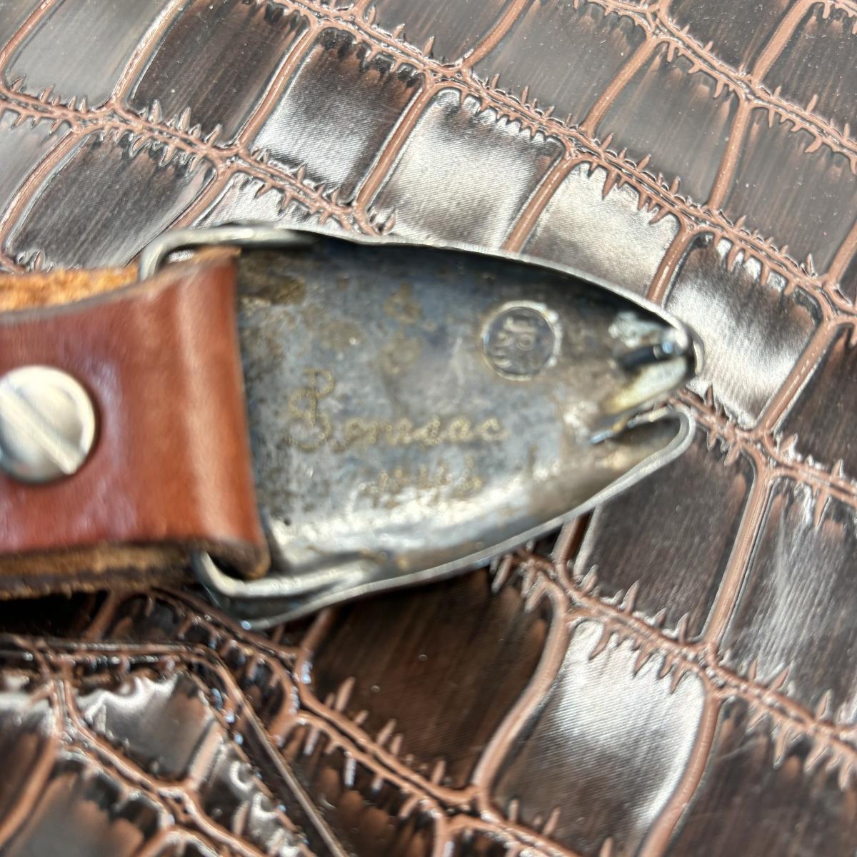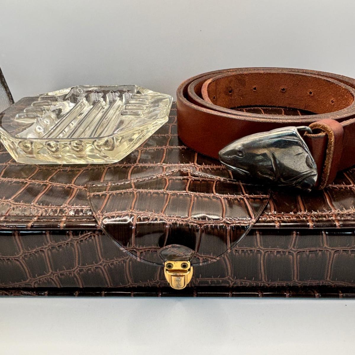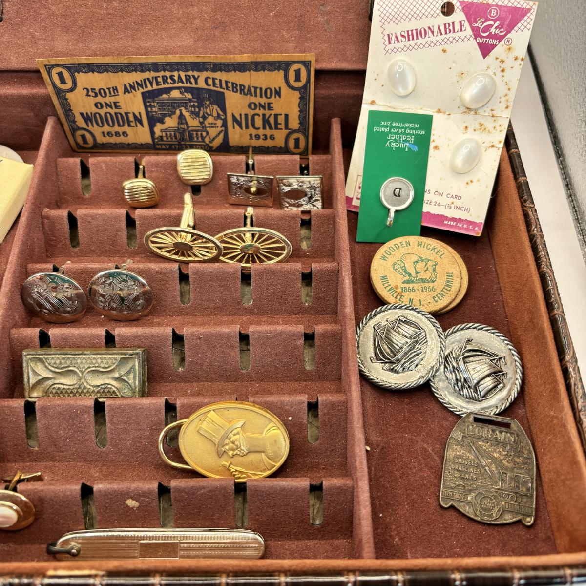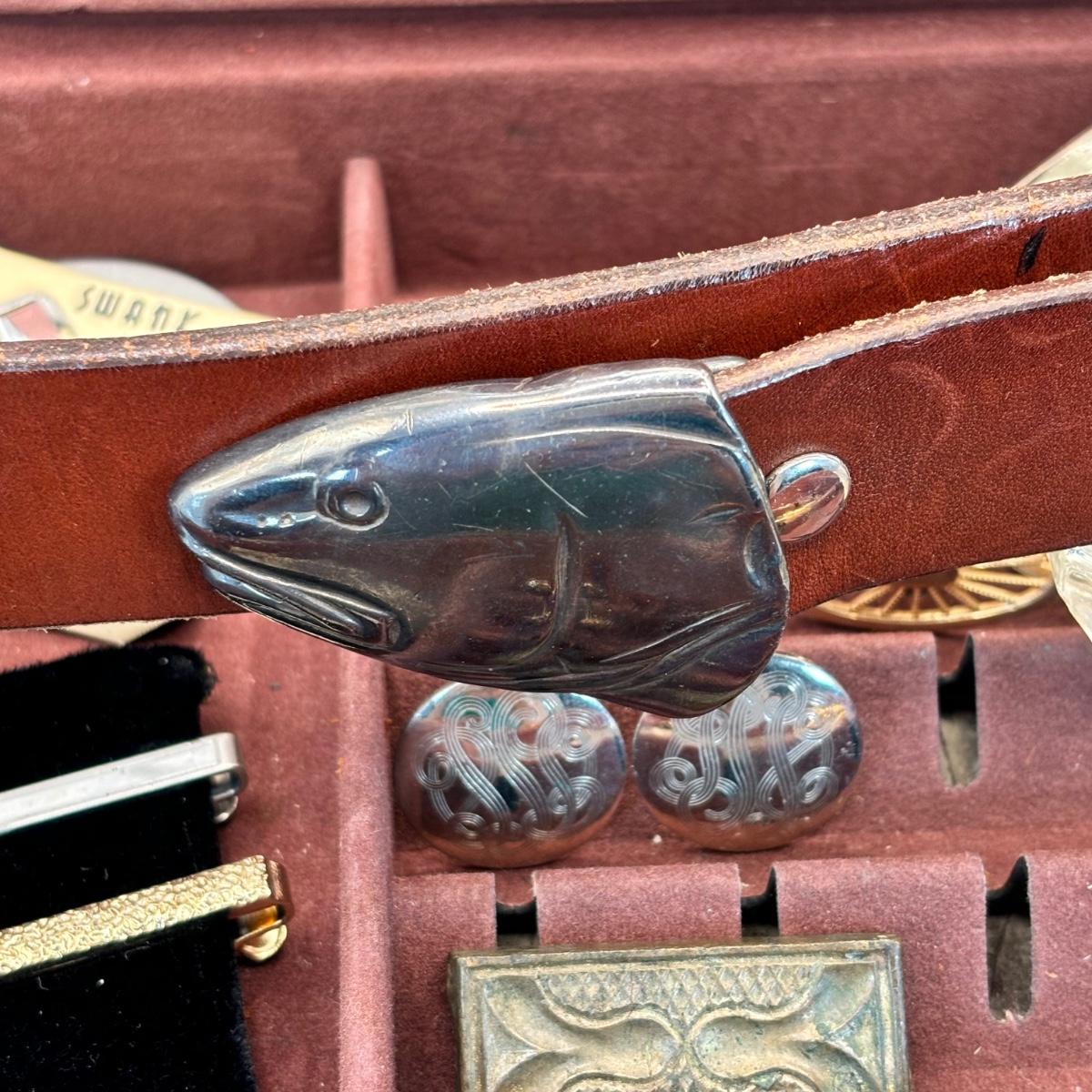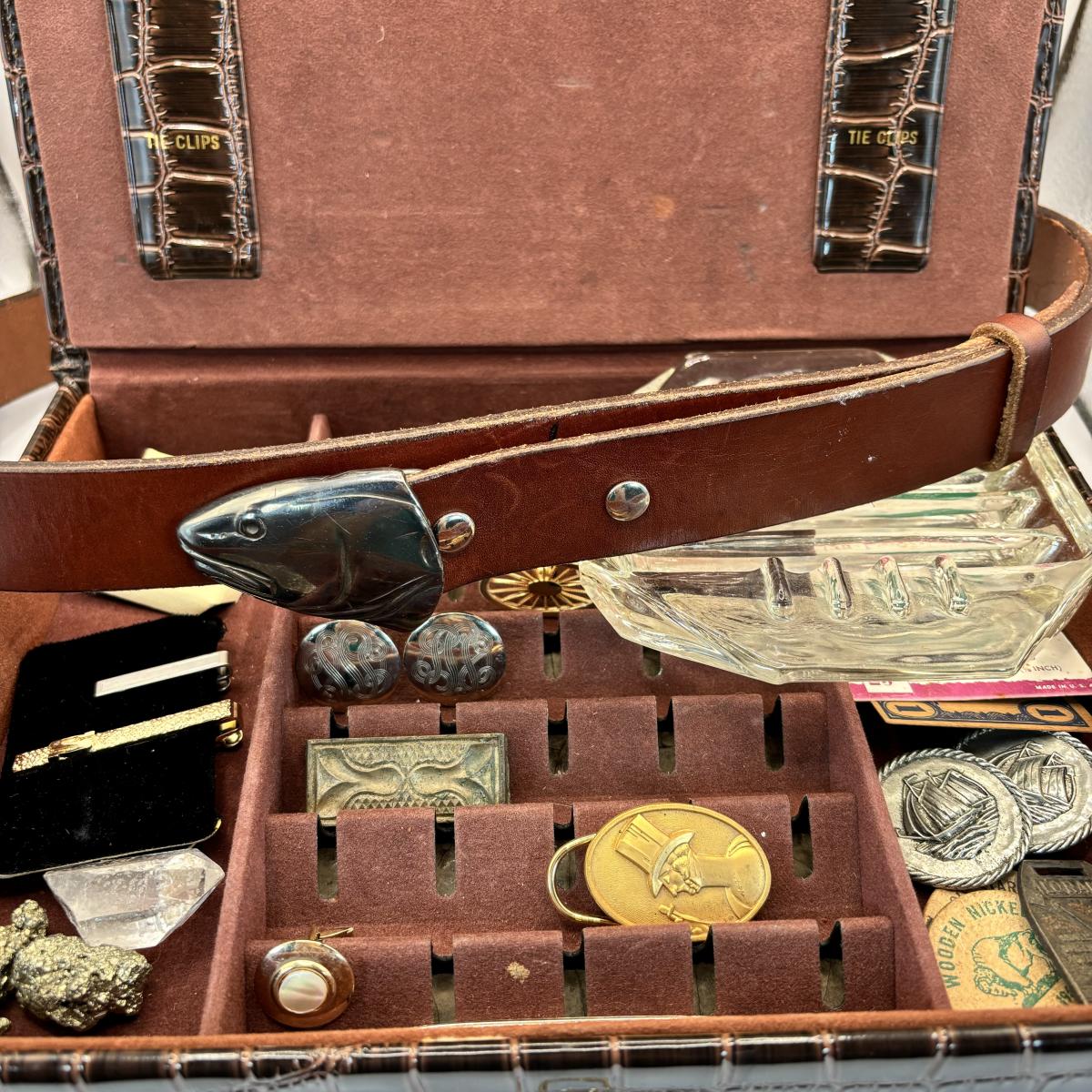 LOT 348: Men's Dresser Box w/Contents (cufflinks 7 tie tacks etc.), Leather Belt w/Fish Buckle & More