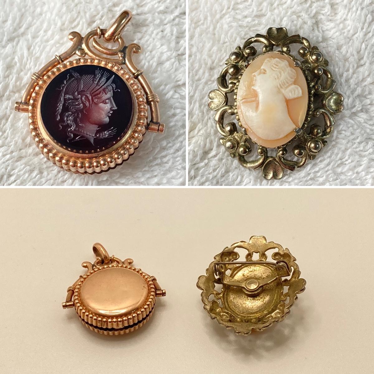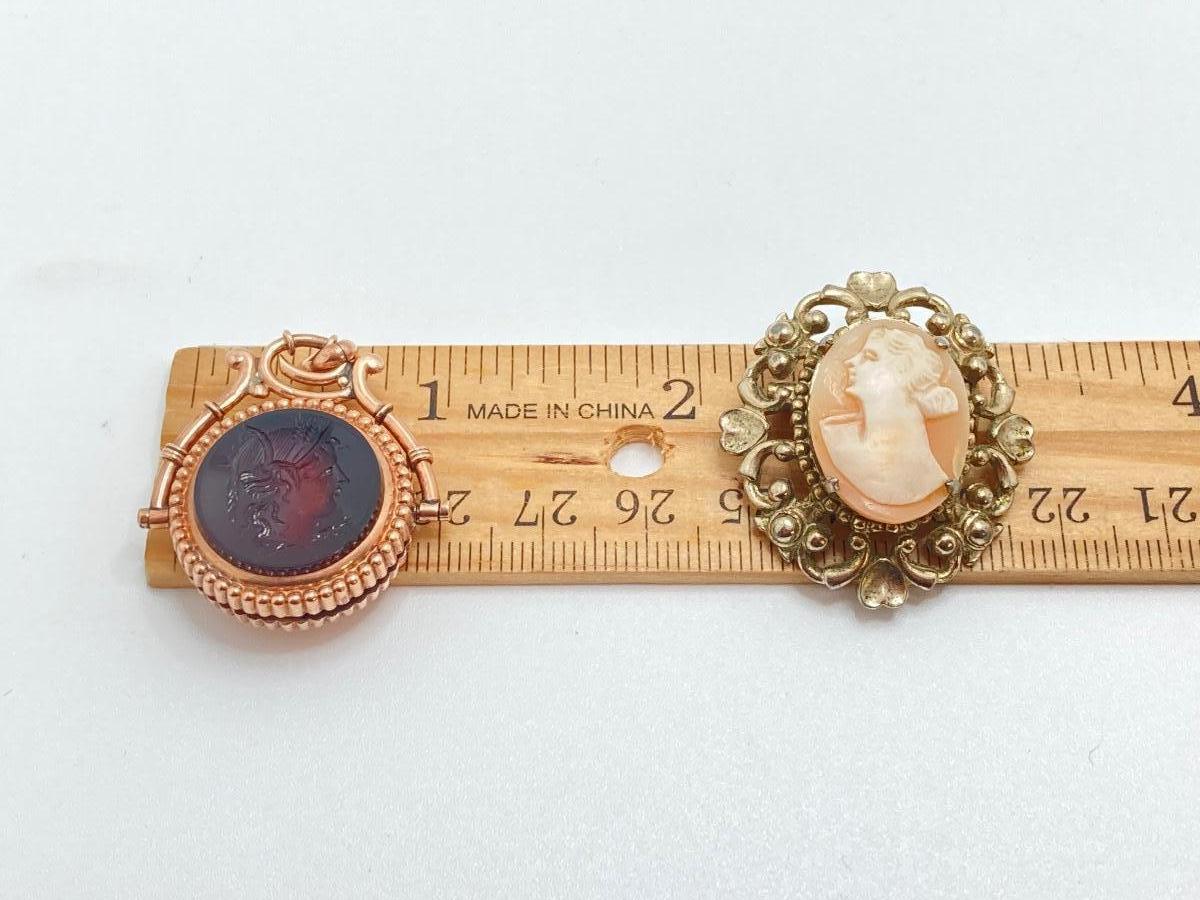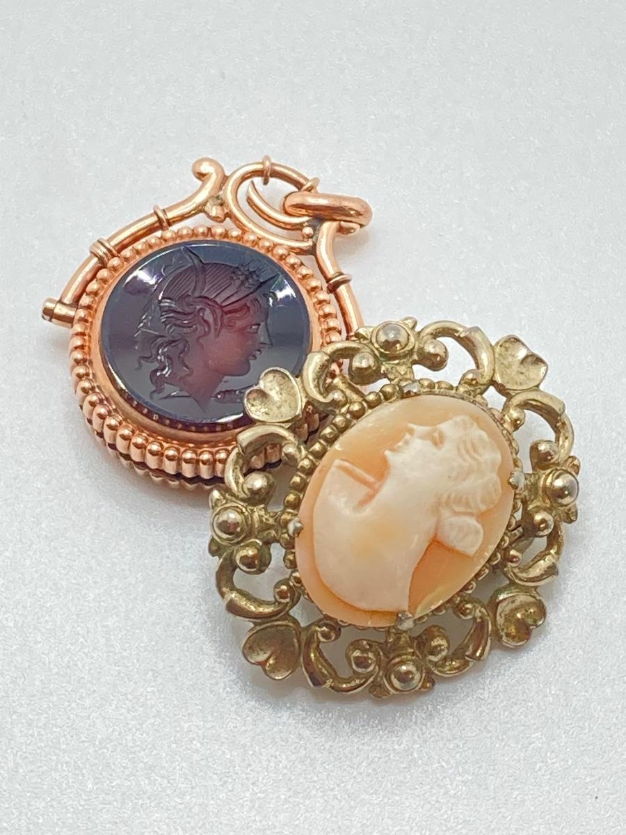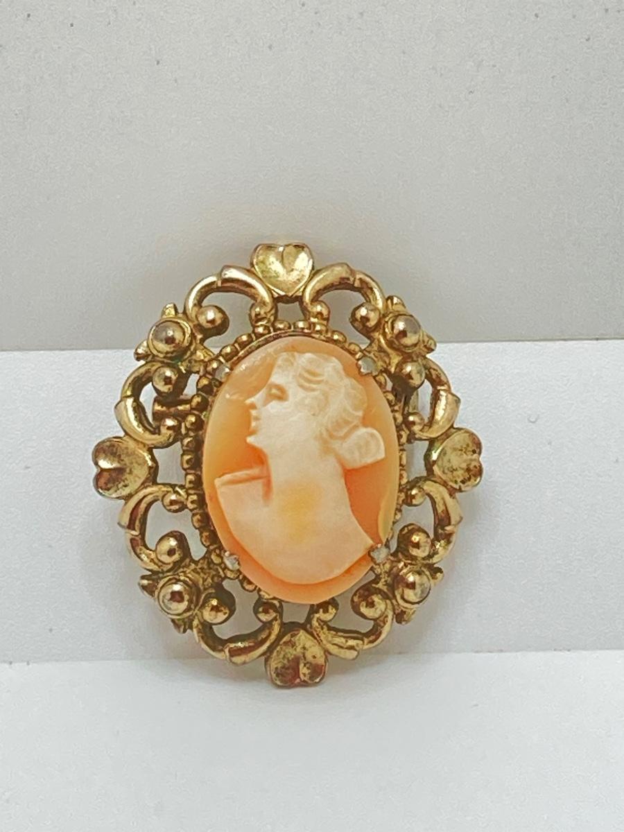 LOT 351: Vintage Coro Cameo Brooch and Rose Gold Tone Carved Locket