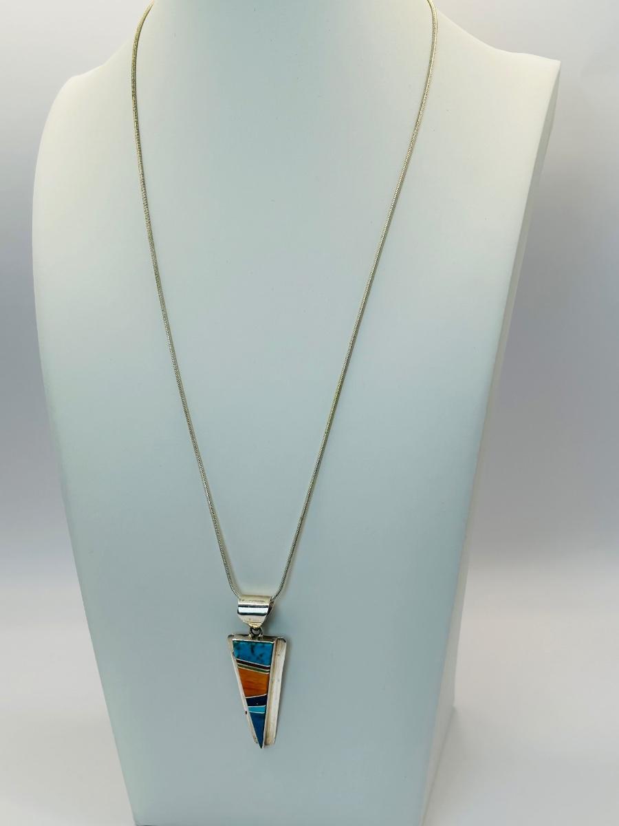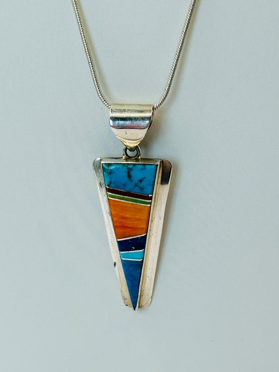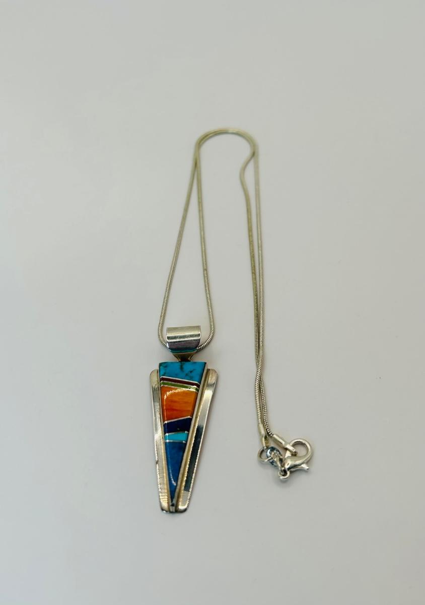 LOT 3: Artist Wayne Muskett Navajo Style Multicolor Inlay Pendant 20" Sterling Chain Necklace