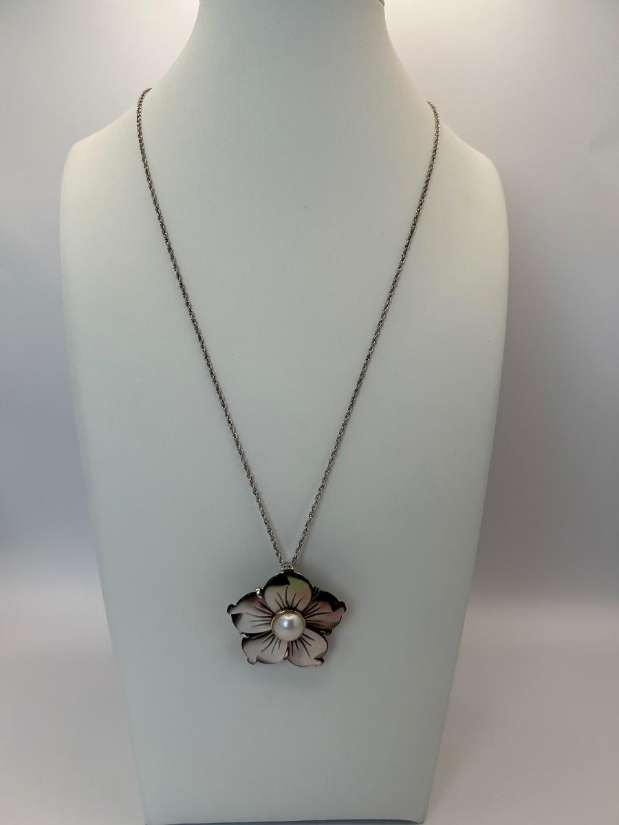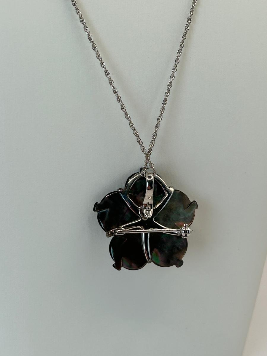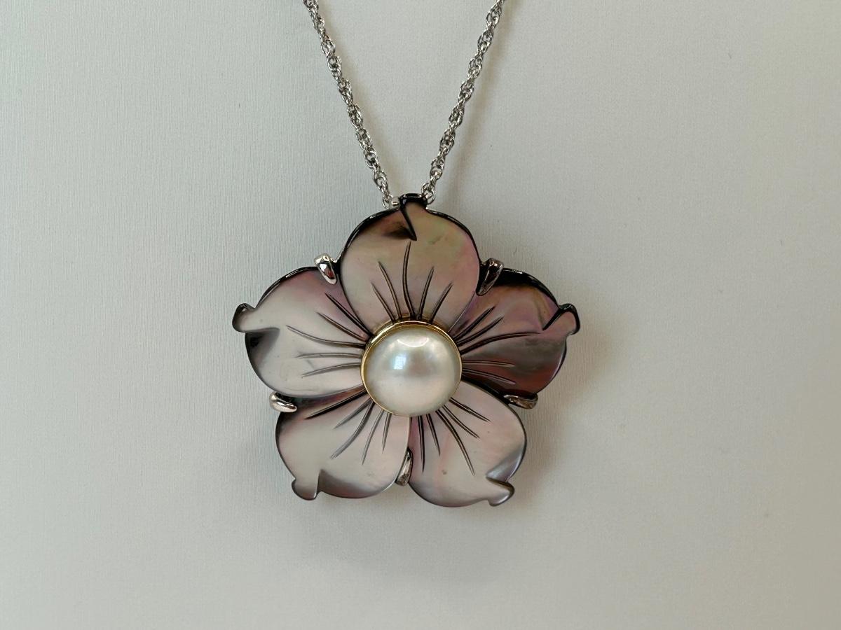 LOT 4: Mother of Pearl w Cultured Pearl Center Enhancer Pendant/Brooch On Sterling Silver 24" Chain