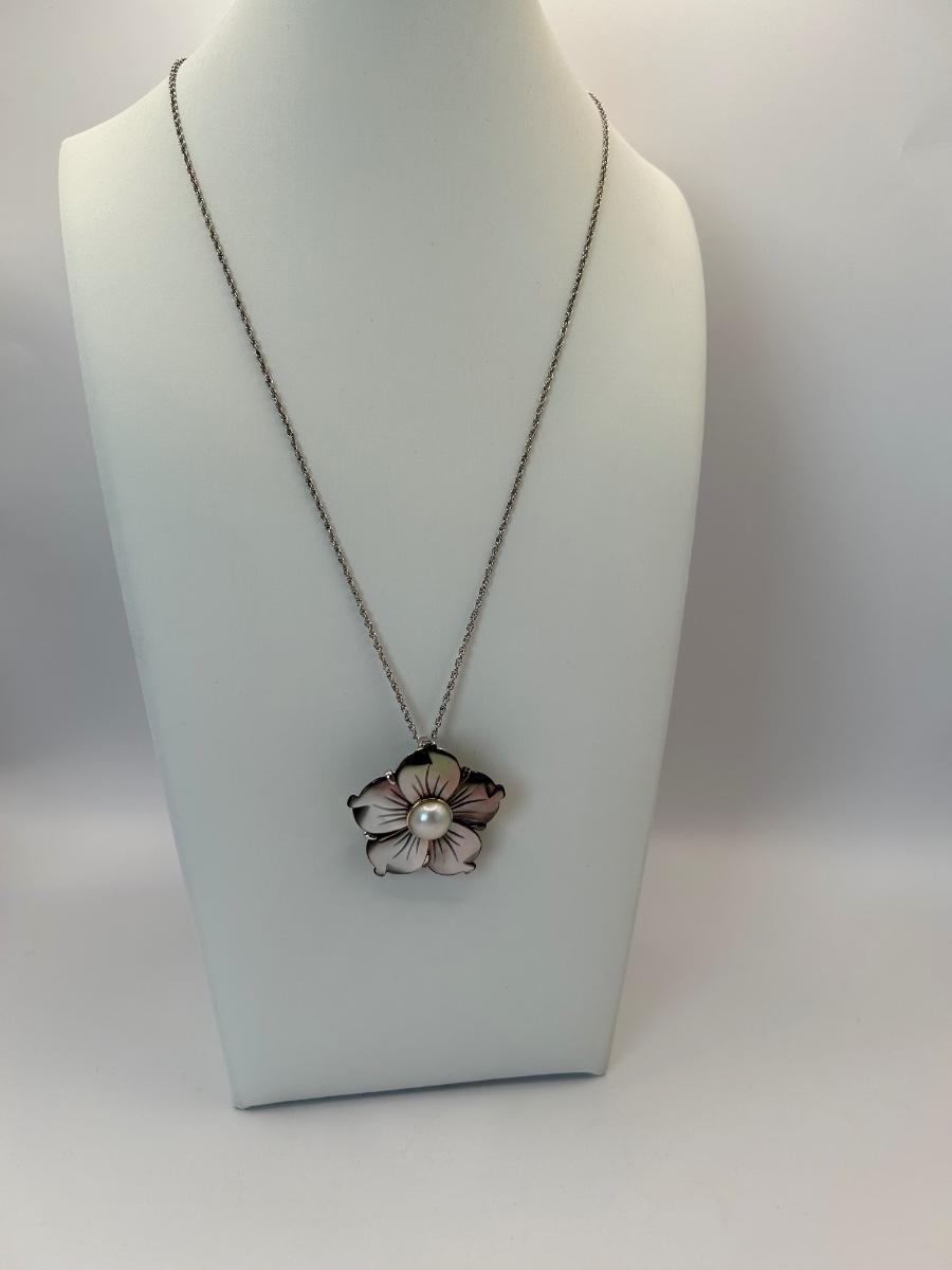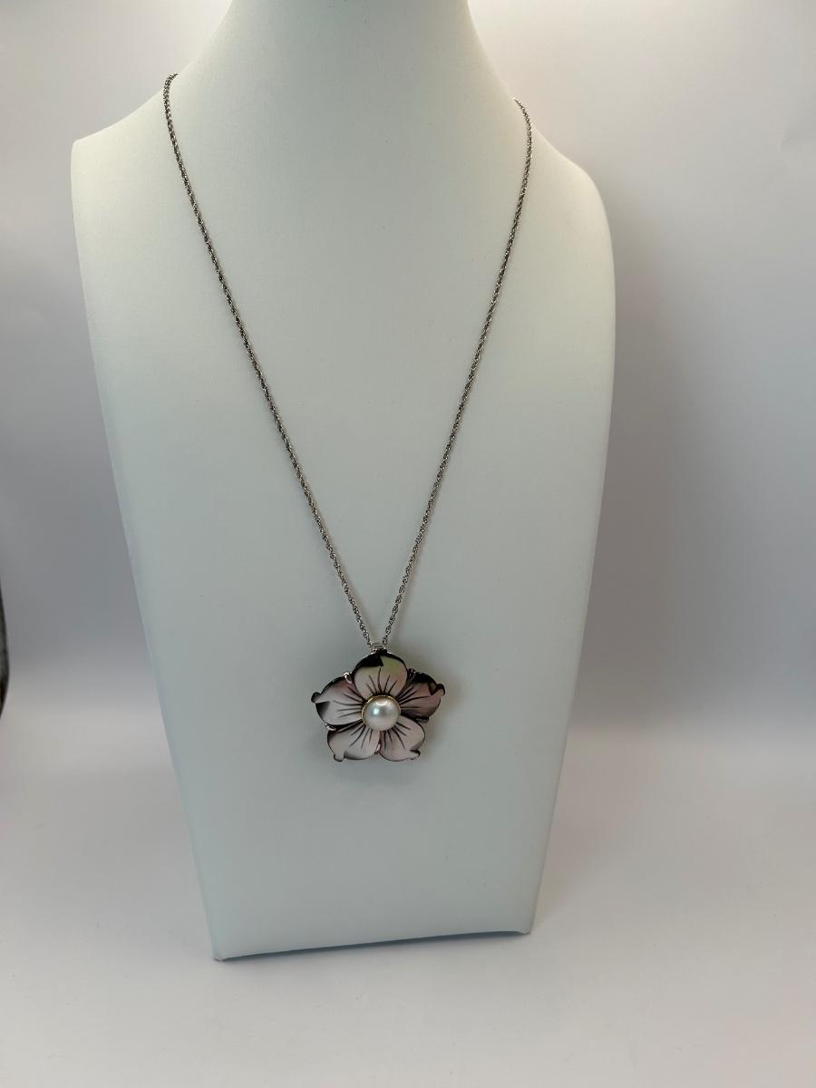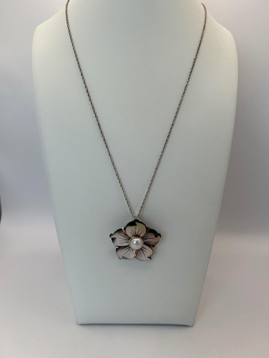 LOT 4: Mother of Pearl w Cultured Pearl Center Enhancer Pendant/Brooch On Sterling Silver 24" Chain