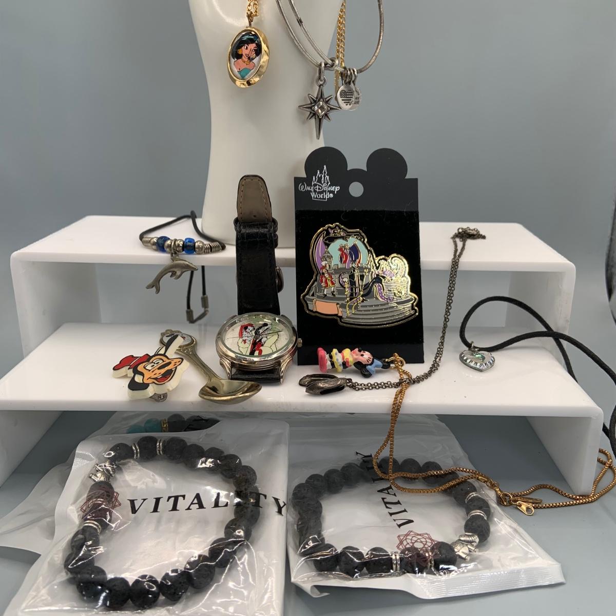 LOT:34: Collection of Disney Fashon Jewlery Including a Villains Watch, Goofy Pin Jasmine Necklace Mickey Mouse Collectors Spoon and More