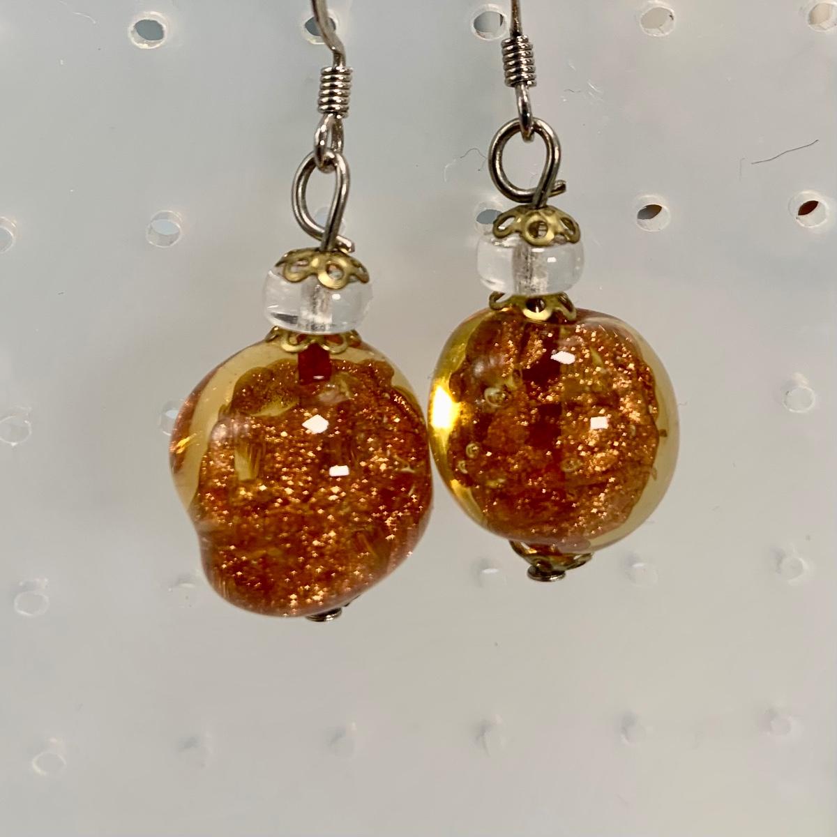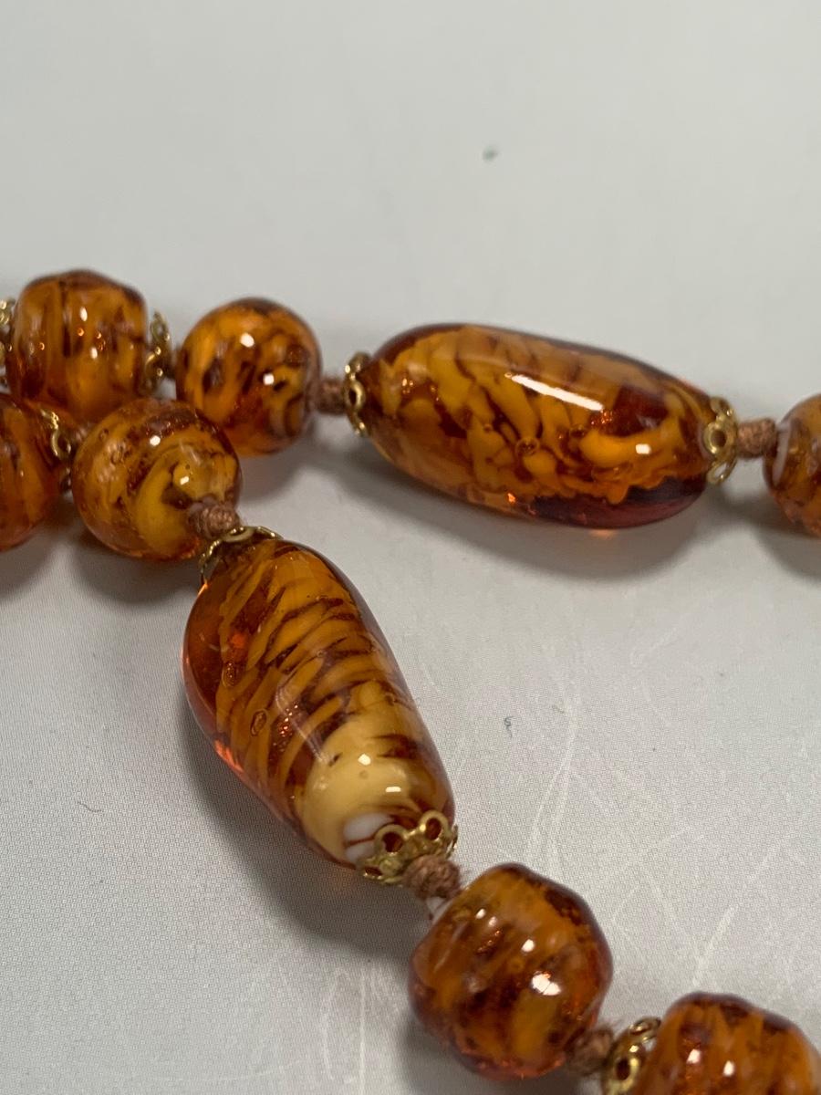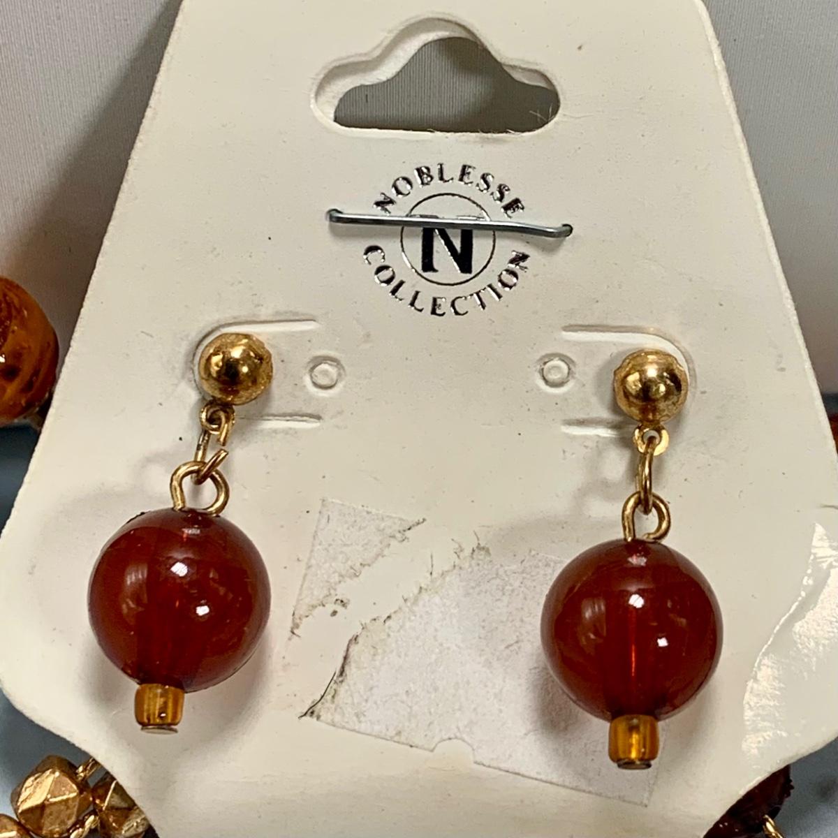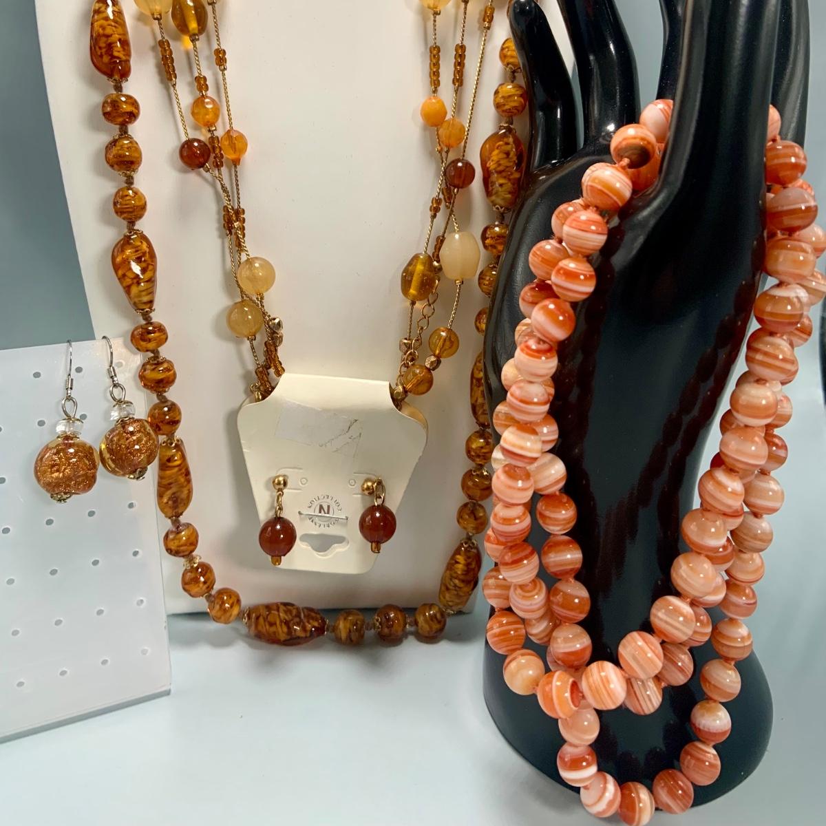 LOT:44: Amber Colored Necklaces and Earrings and Coral Colored Beaded Necklace.